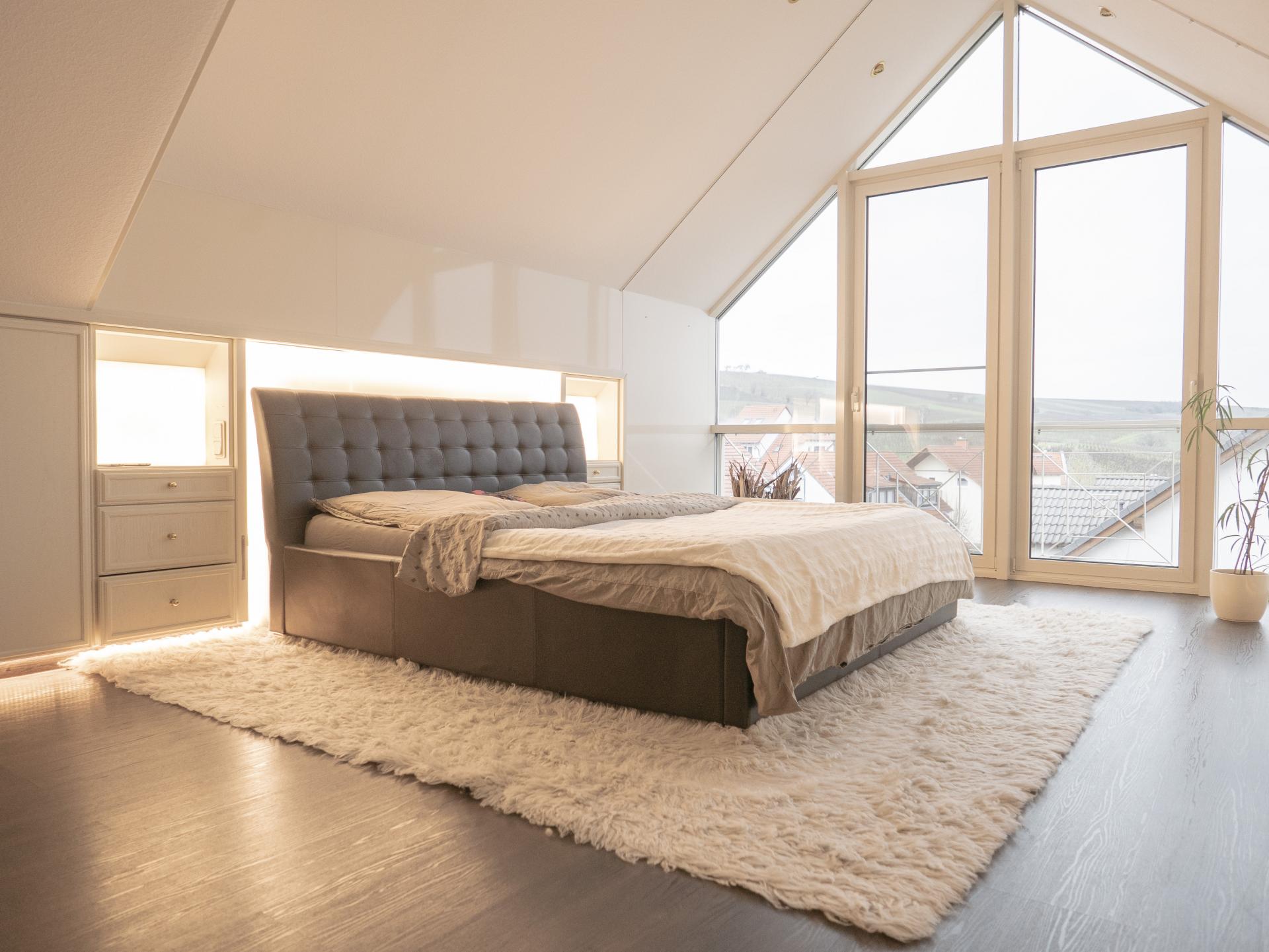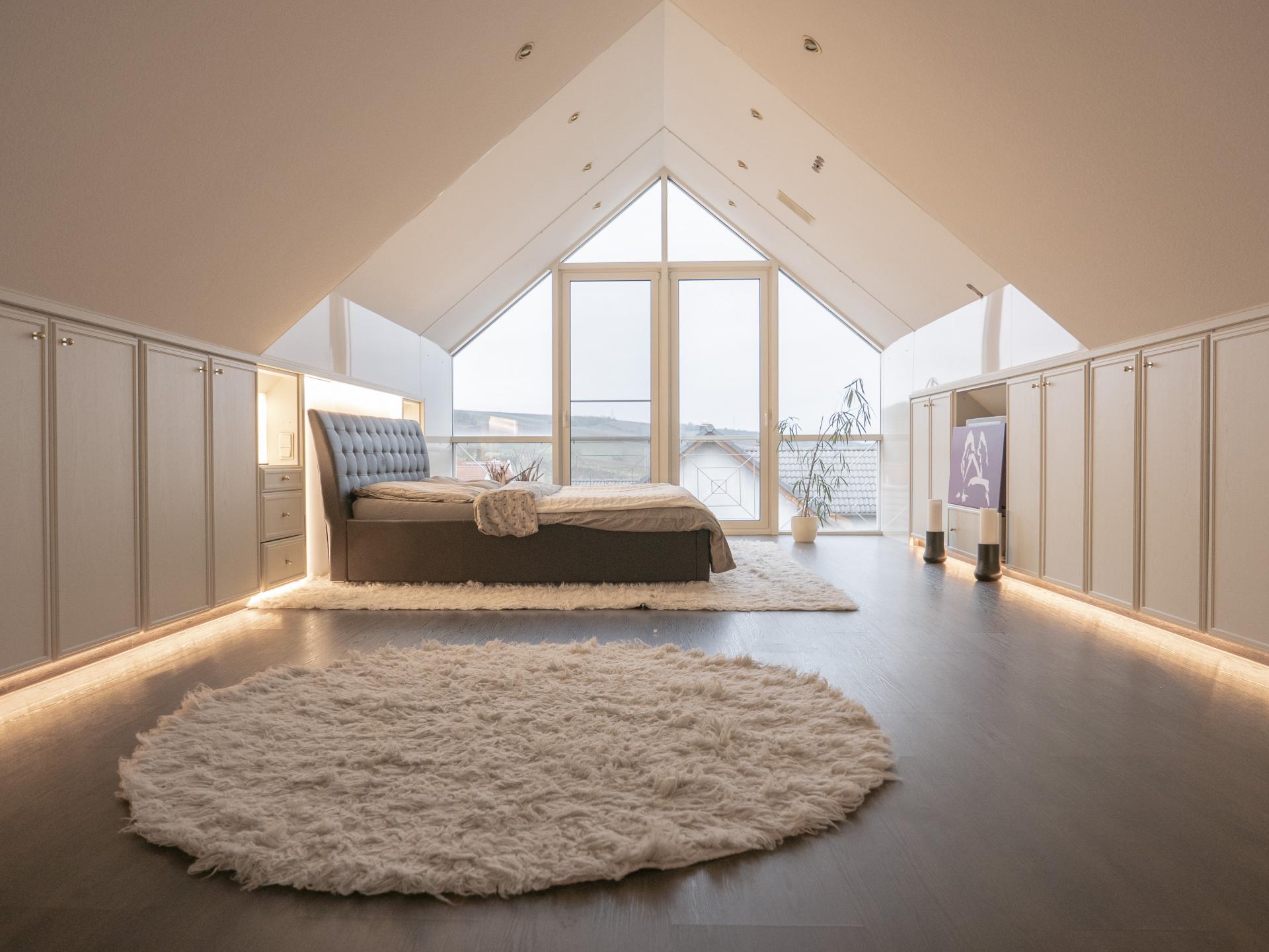 Adjacent is the exclusive and extremely comfortable master bedroom, equipped with the highest quality custom-built wardrobes and ambient lighting that cleverly disappears into the sloping ceilings. This wardrobe concept provides immense storage space for the wardrobe of Lady and Gentleman. Particularly, the window front with enchanting views of the vineyards makes this room a cozy, top-class bedroom. A glass door connects the room to a spacious and light-filled bathroom with built-in cabinets, open shower, and whirlpool bathtub.
