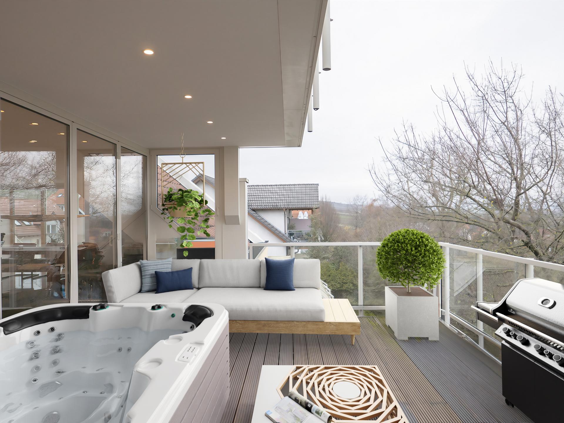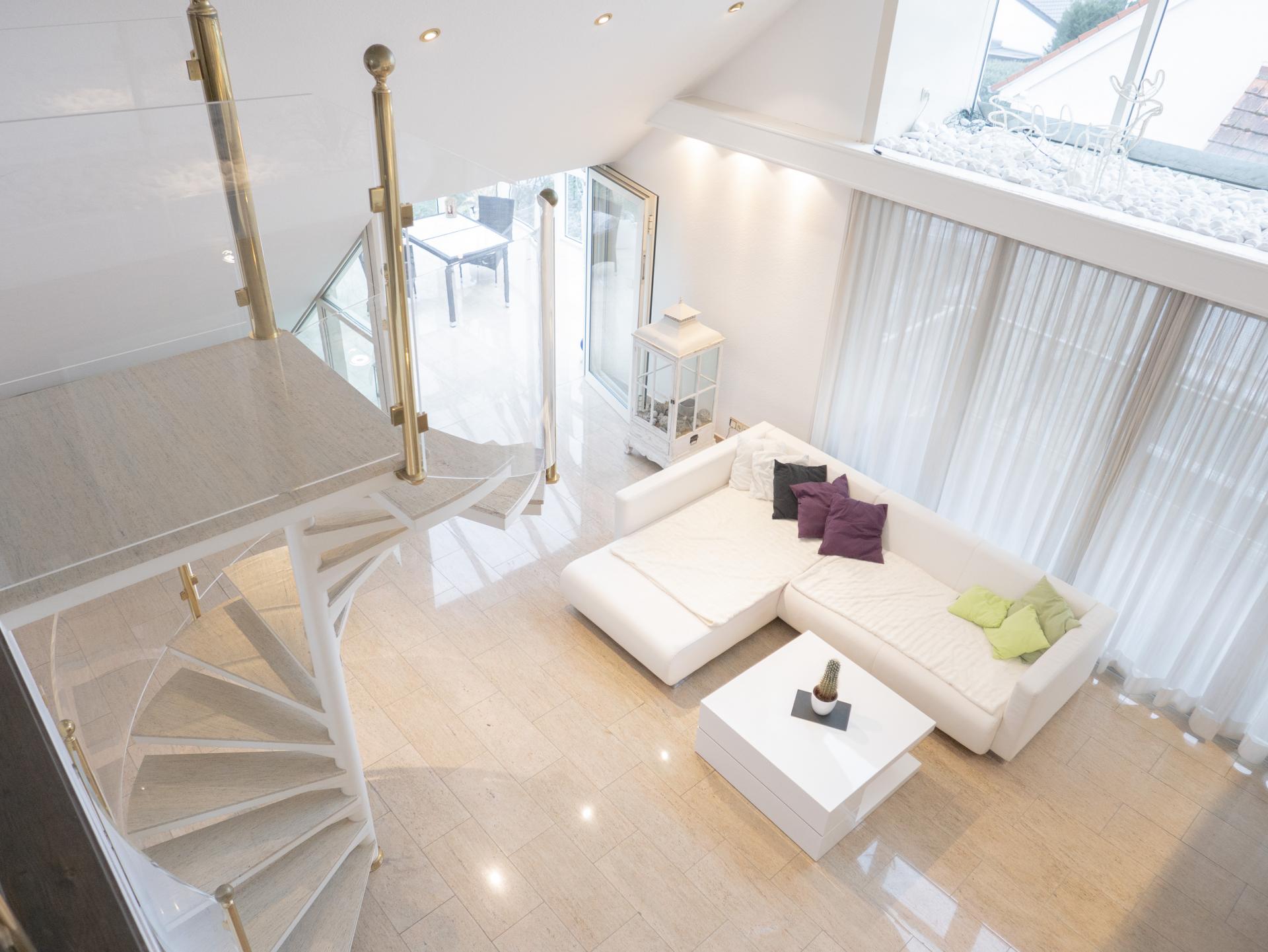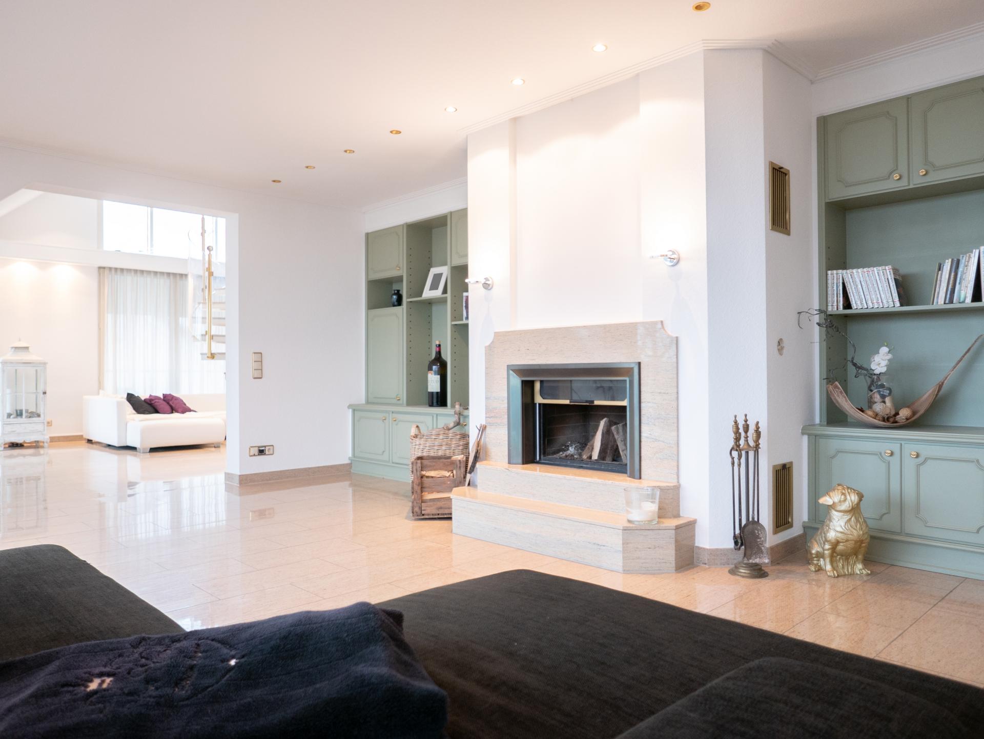 In the picturesque setting at the foot of the vineyards of Bodenheim, this impressive penthouse stands as a true masterpiece of elegance and sophistication. Two levels, skillfully connected by a gallery, along with a fireplace, a lift with penthouse ride, spacious outdoor areas, a conservatory, and a private wine cellar, lend an unparalleled aura to this home.
