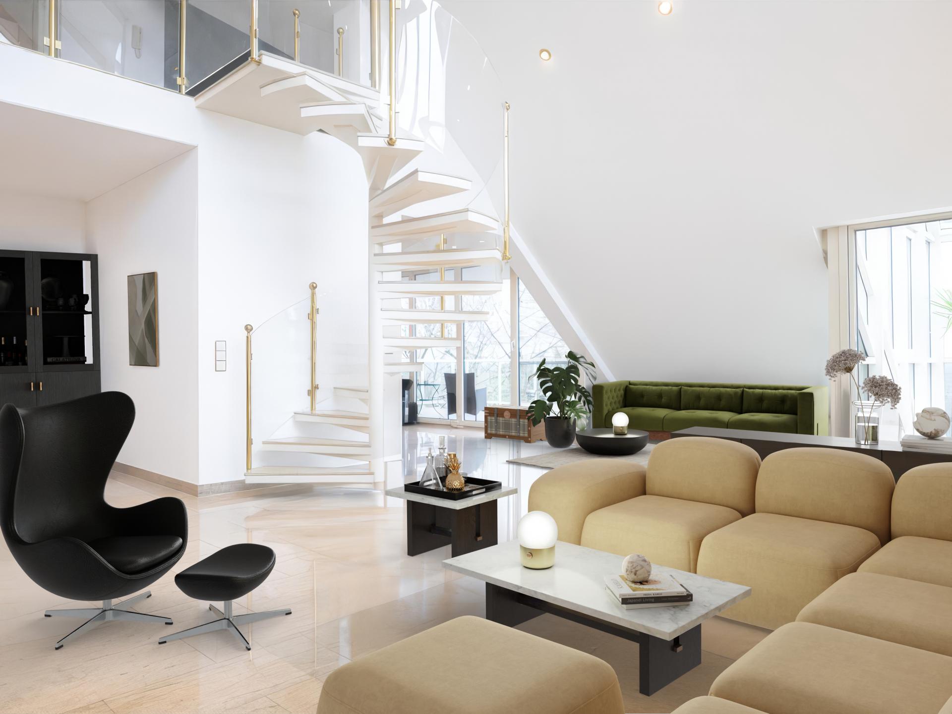 An elegant spiral staircase with marble steps leads you to the second level of this penthouse, where a gallery room overlooking the living area creates an inspiring ambiance. A versatile work or studio room, which can also be used as a bedroom, offers space for individual development and provides an inspiring view over the treetops to the Rhine plain through a glass front.