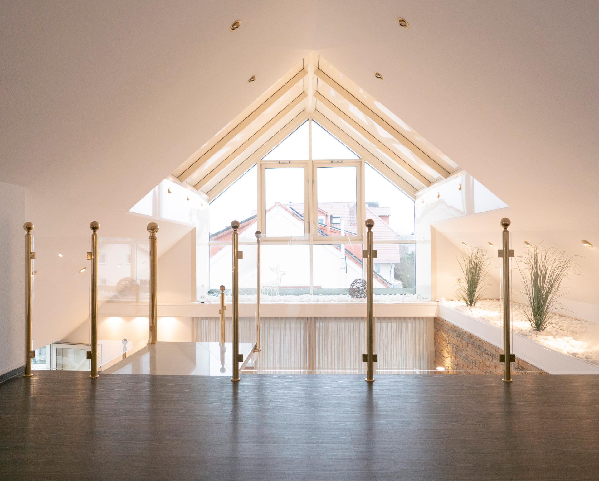 In front of the fireplace and below the gallery, cozy lounge areas can be arranged. The living area with a gallery impresses with double ceiling heights and the impressive gallery window. Optionally, an exclusive lounge with a billiard table and stylish home bar can be set up here.