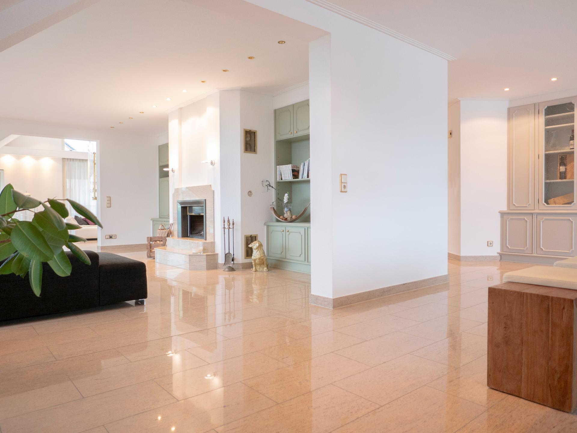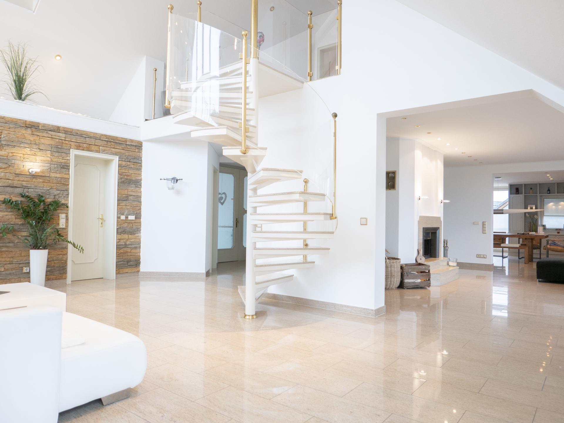 Through the lift with a private penthouse ride, you are stylishly transported directly into the entrance area of this luxury penthouse, which encompasses the top two floors of a property built in 1994 with only a total of 8 residential units. The entrance area, laid out with exquisite marble flooring, opens in both directions to the spacious rooms on this level. It not only offers a storage space for wardrobe and shoes but also a guest toilet in an extravagant retro look.