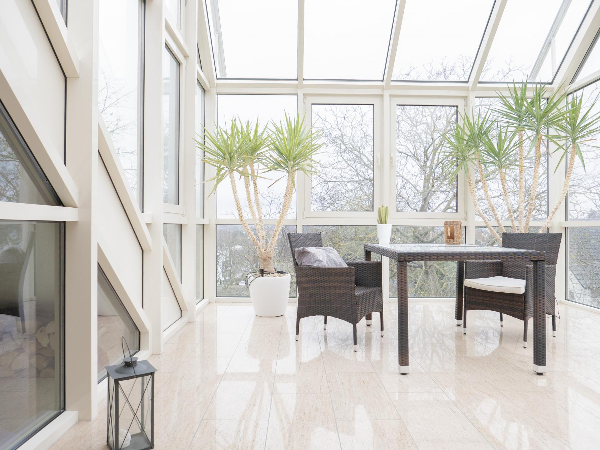 The fully glazed and heated conservatory, also equipped with marble floors, integrates the surrounding nature into the living space even during the colder seasons. An atmospheric place for breakfast at sunrise or a cozy glass of wine in the evening.