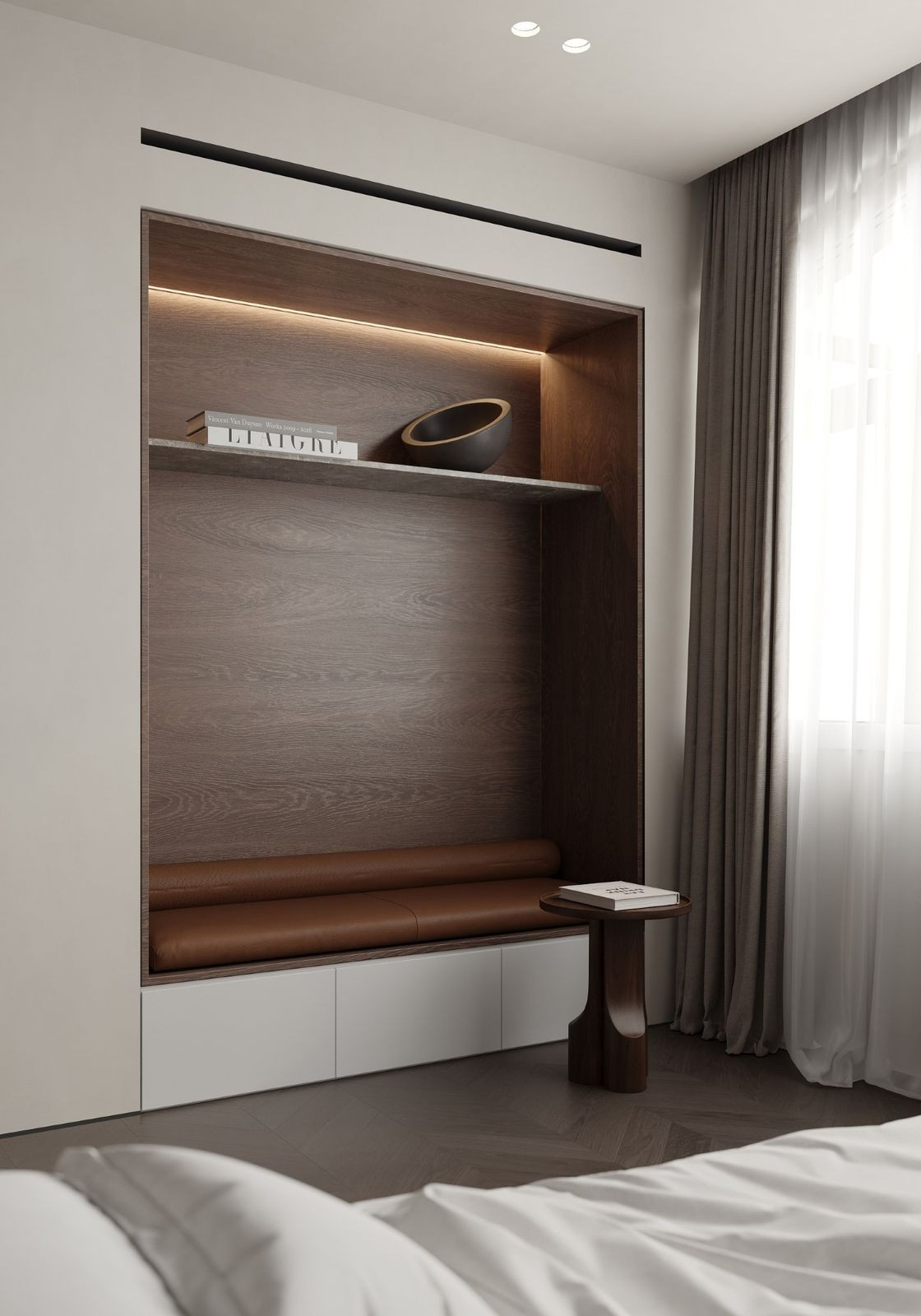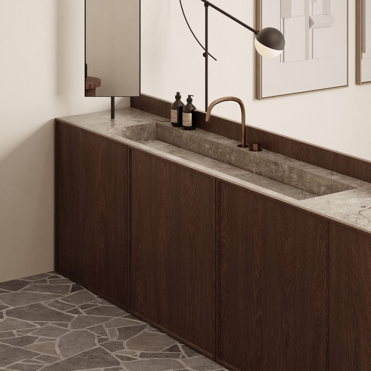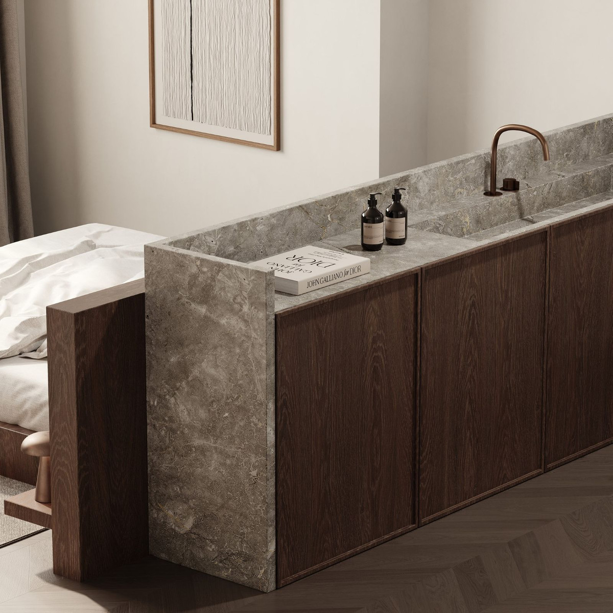 The use of premium materials, such as stone, dark oak wood carpentry, parquet flooring, and ribbed tiles in the bathrooms, enhances the warm yet contemporary ambiance. Spanning two floors, the penthouse provides an intelligently designed layout that prioritizes both functionality and elegance. Upon entering, the lower level welcomes residents with a refined entrance hall that leads to three spacious en-suite bedrooms, each boasting custom walk-in wardrobes and sleek integrated bathrooms. The master suite stands out with its private terrace and an outdoor shower, offering an exclusive space for al fresco bathing.