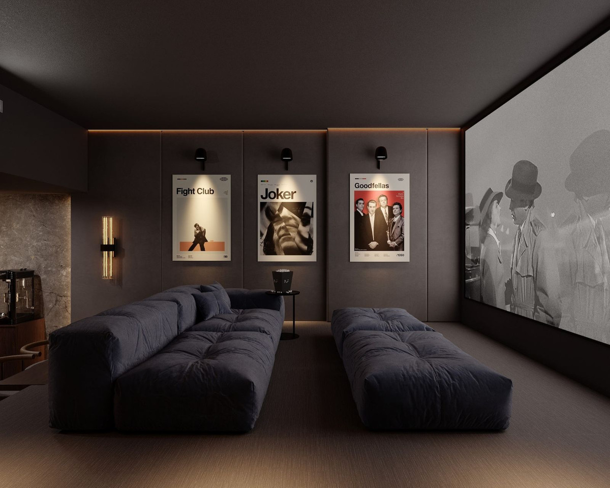 A floating staircase with glass railings ascends to the upper level, where an open-plan kitchen seamlessly integrates with the dining and living areas. From here, direct access leads to the expansive terrace, which features a covered section for year-round enjoyment, an outdoor kitchen, and a dedicated chill area. This floor also houses a guest toilet, a fourth en-suite bedroom, and a private bar that connects to an inviting cinema room, creating an ideal space for entertaining while maintaining privacy. The penthouse is offered fully furnished and equipped, ready for immediate occupancy.