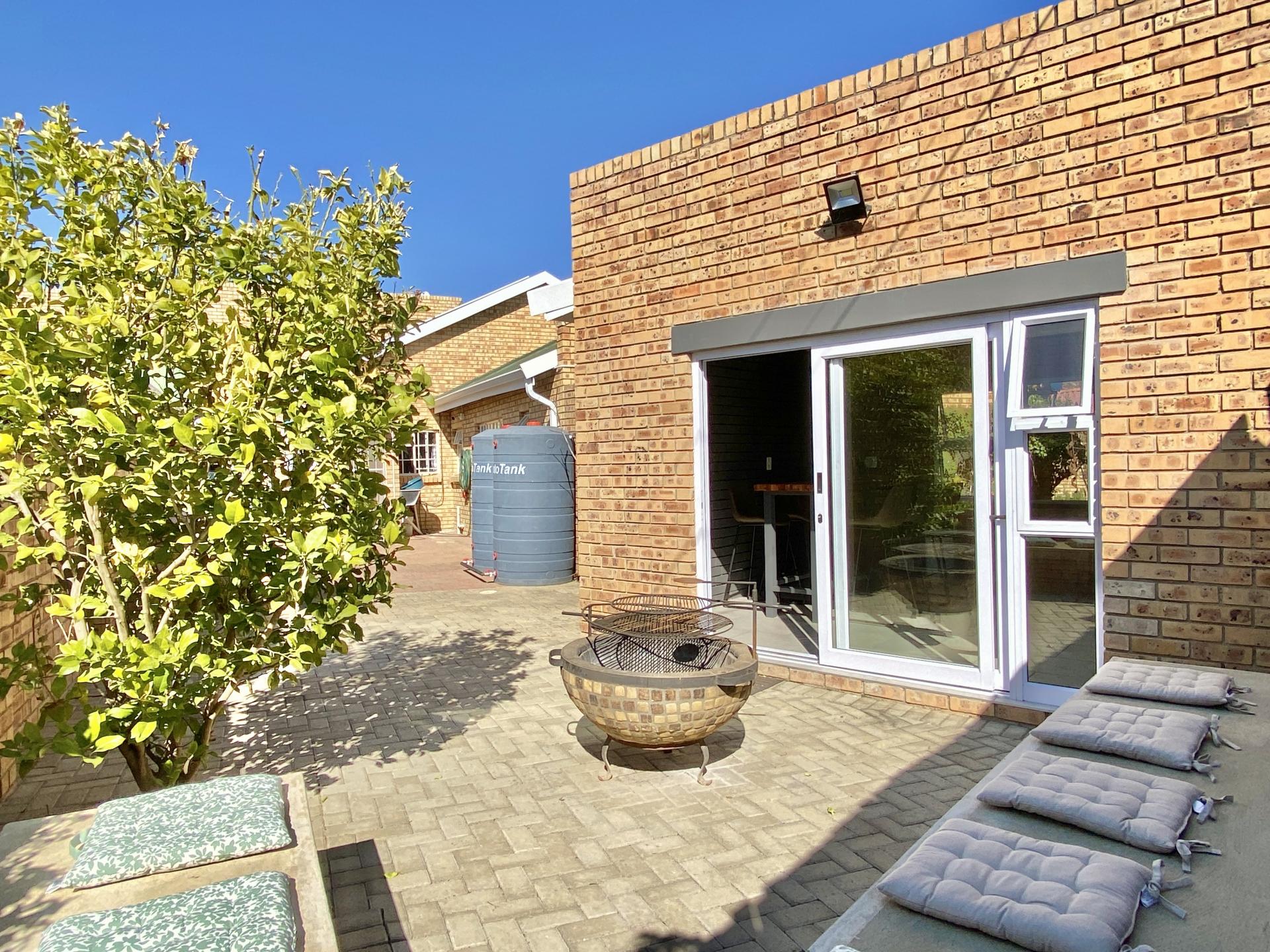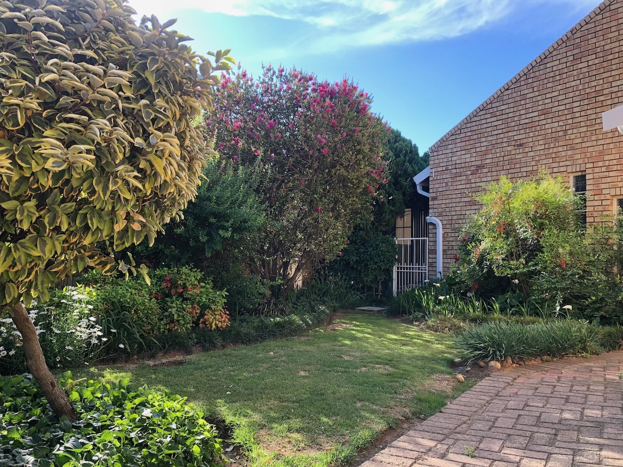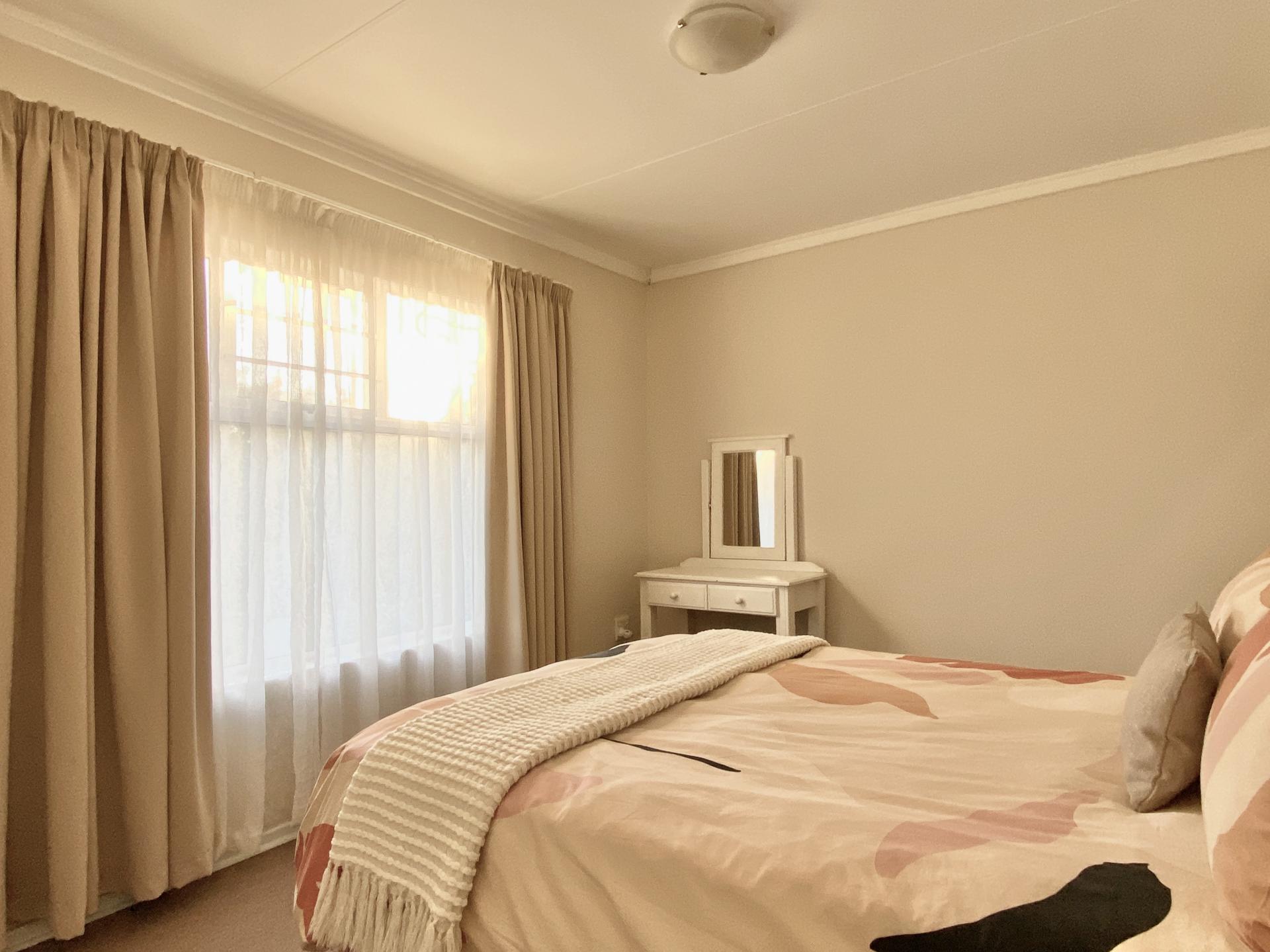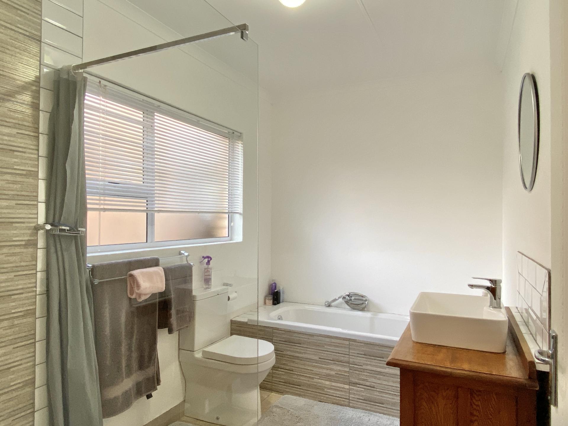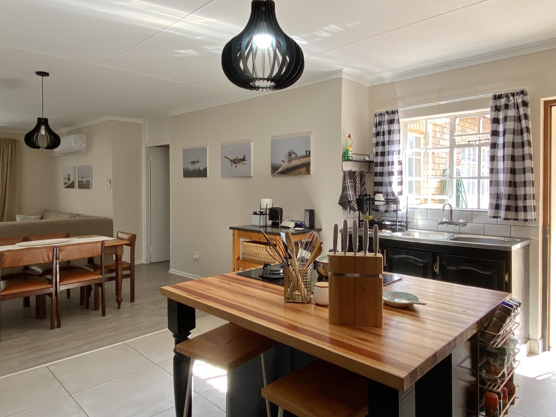 The kitchen, dining- and living room are semi-open plan, creating a lovely flow throughout the house. Adjacent to the kitchen is a neat laundry/scullery with all the necessary fittings. From the living room, an intimate sun lounge welcomes you to the manicured, water-wise garden.