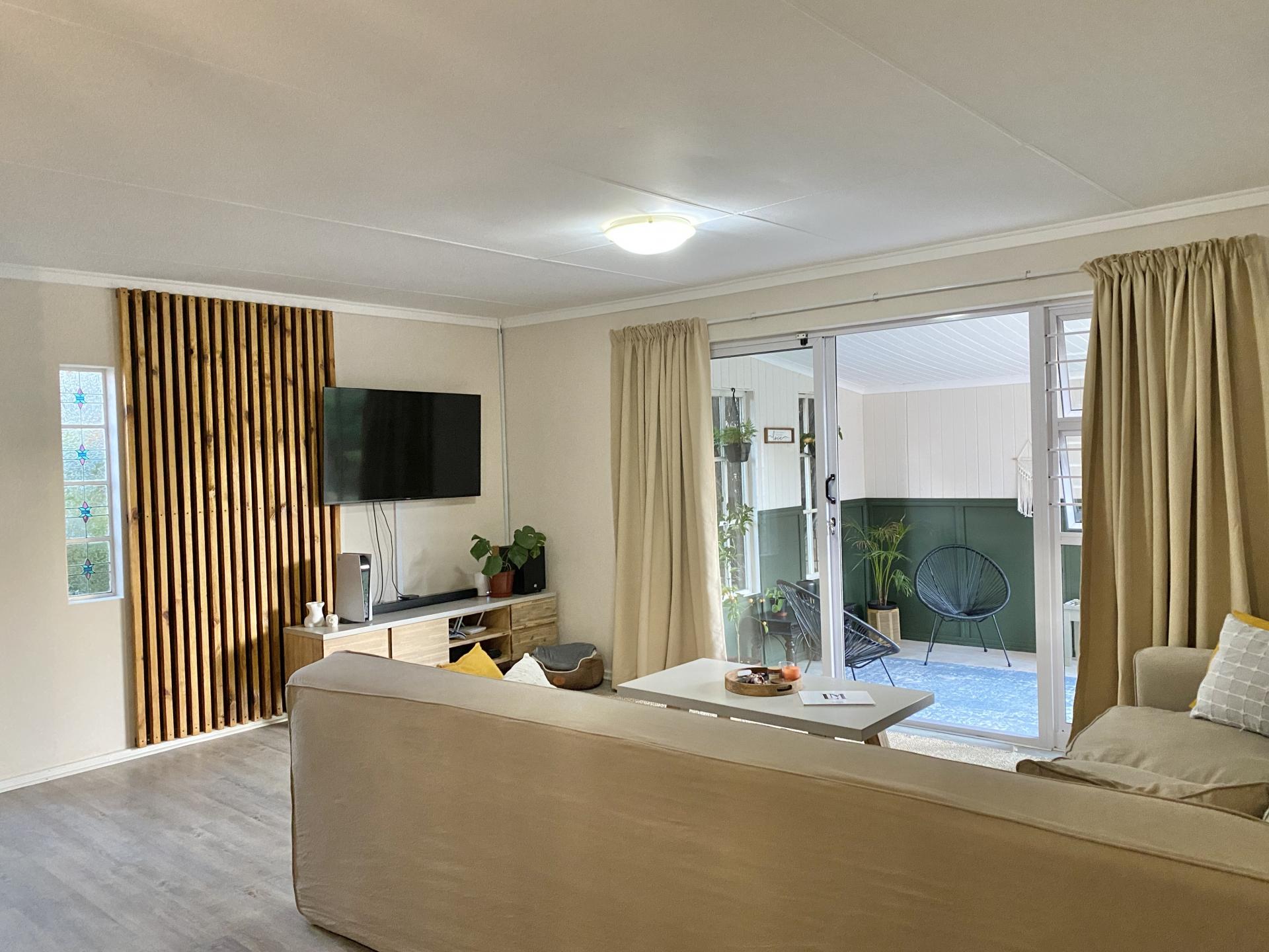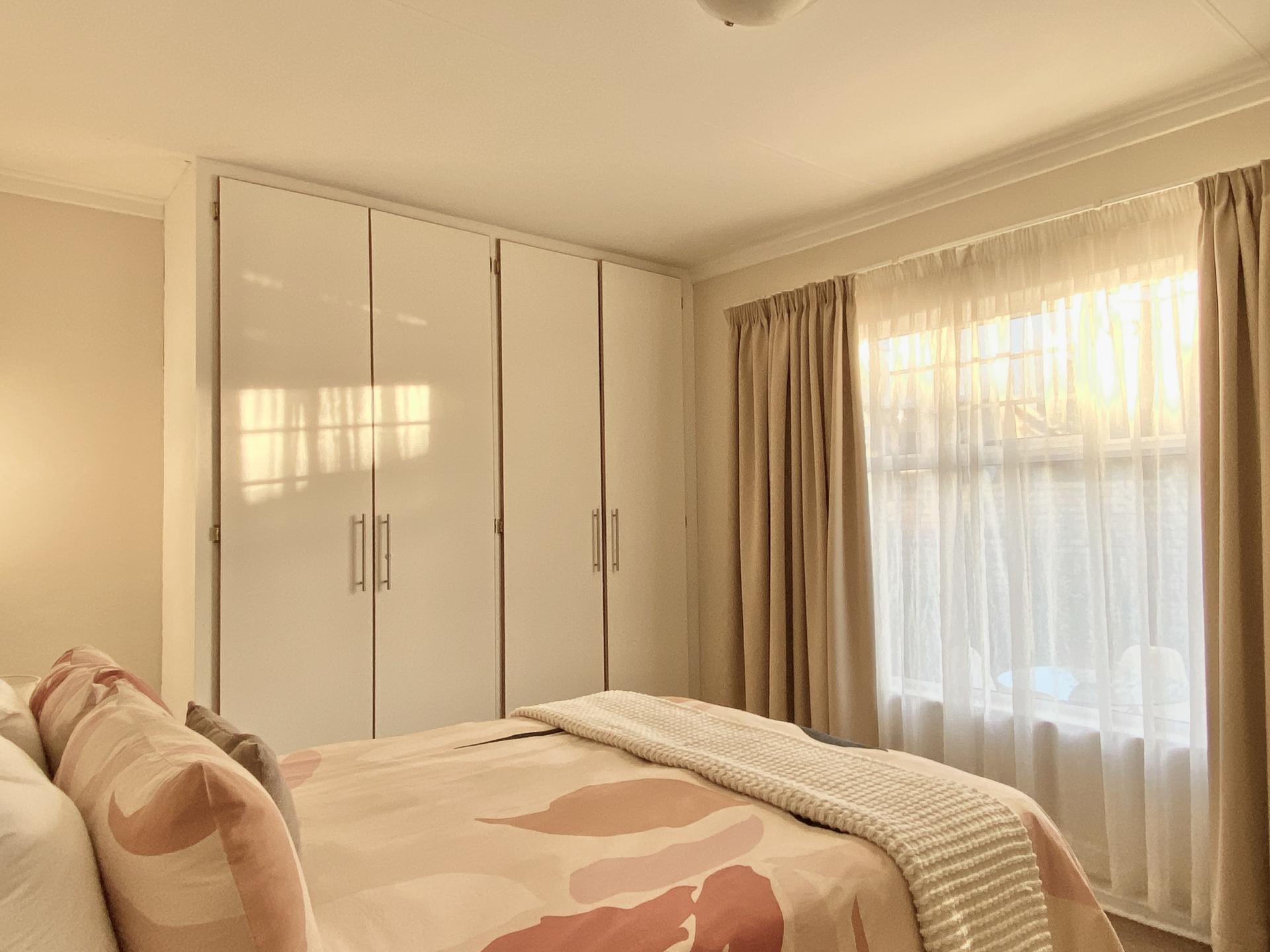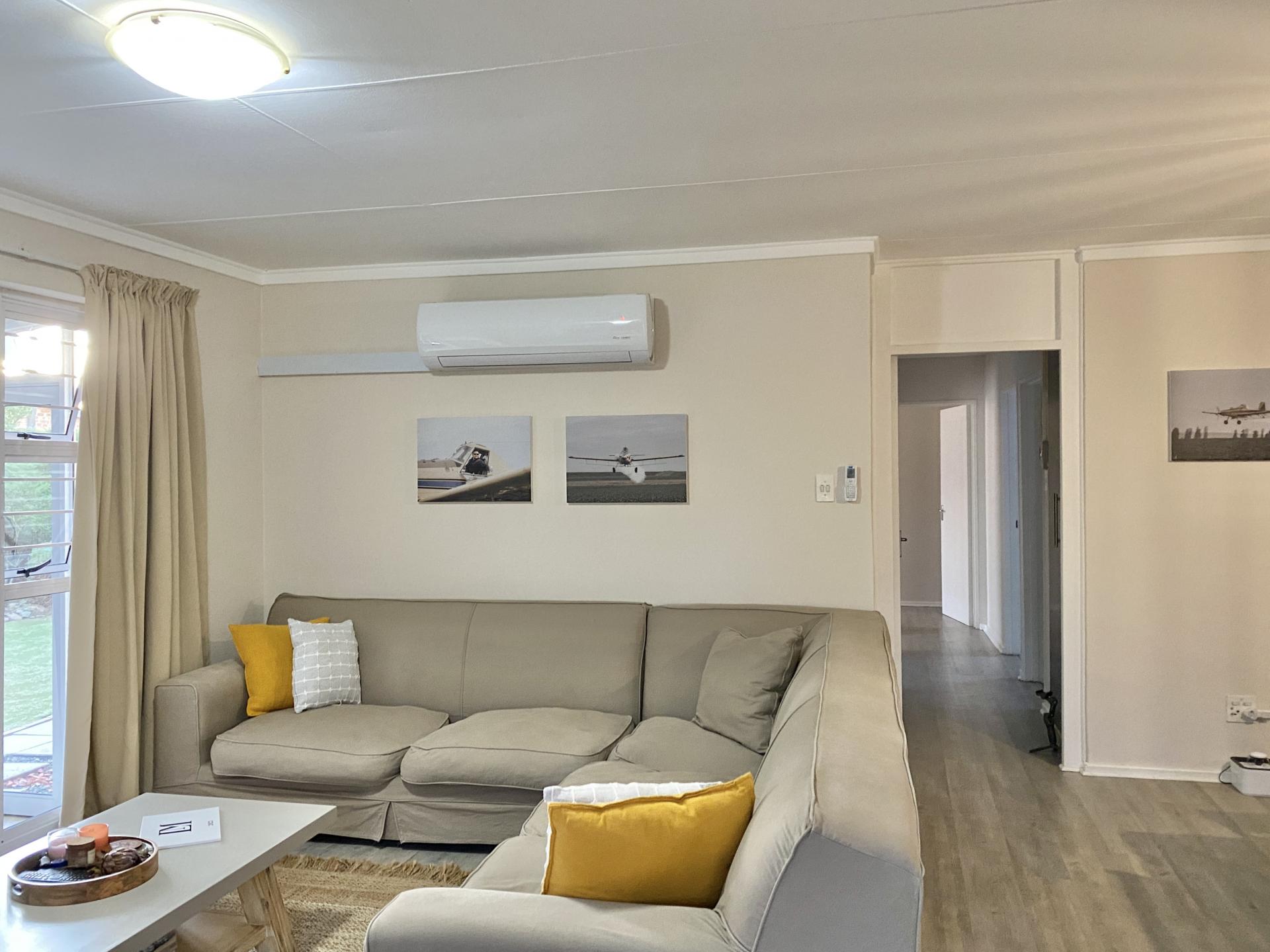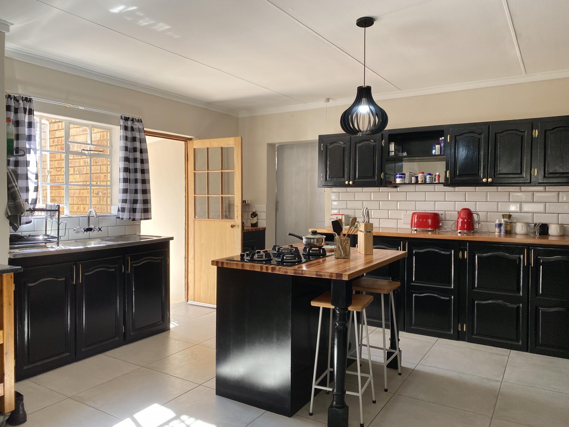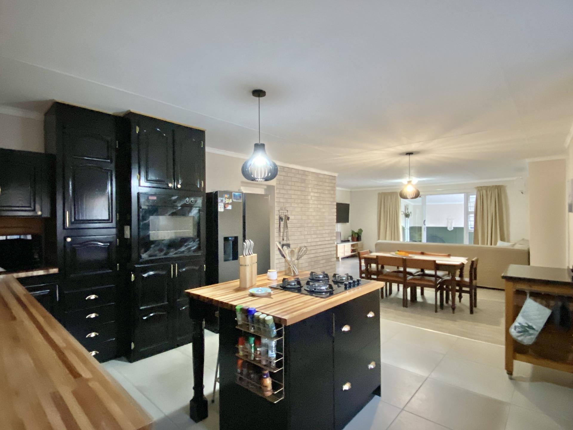 The kitchen, dining- and living room are semi-open plan, creating a lovely flow throughout the house. Adjacent to the kitchen is a neat laundry/scullery with all the necessary fittings. From the living room, an intimate sun lounge welcomes you to the manicured, water-wise garden.