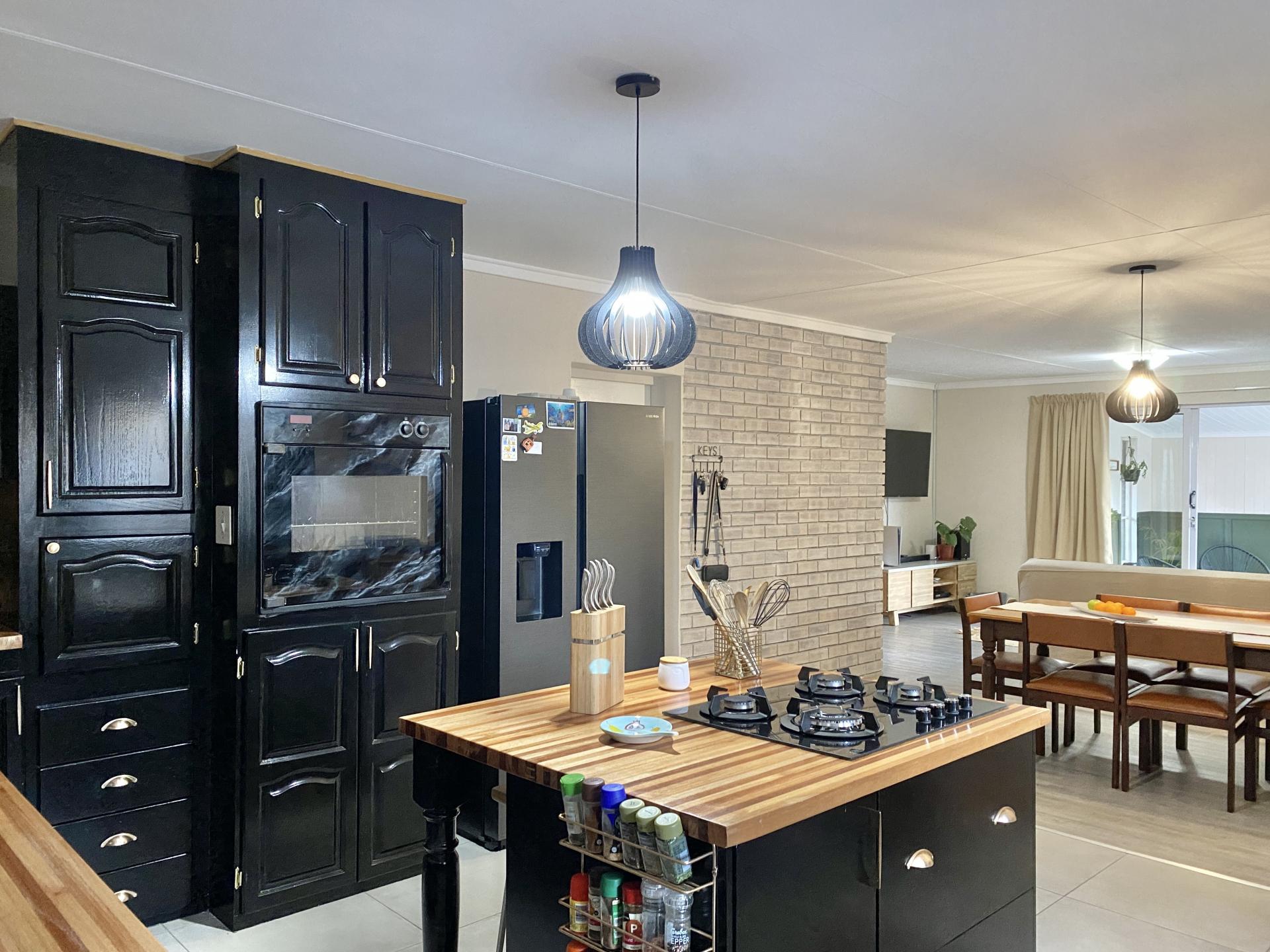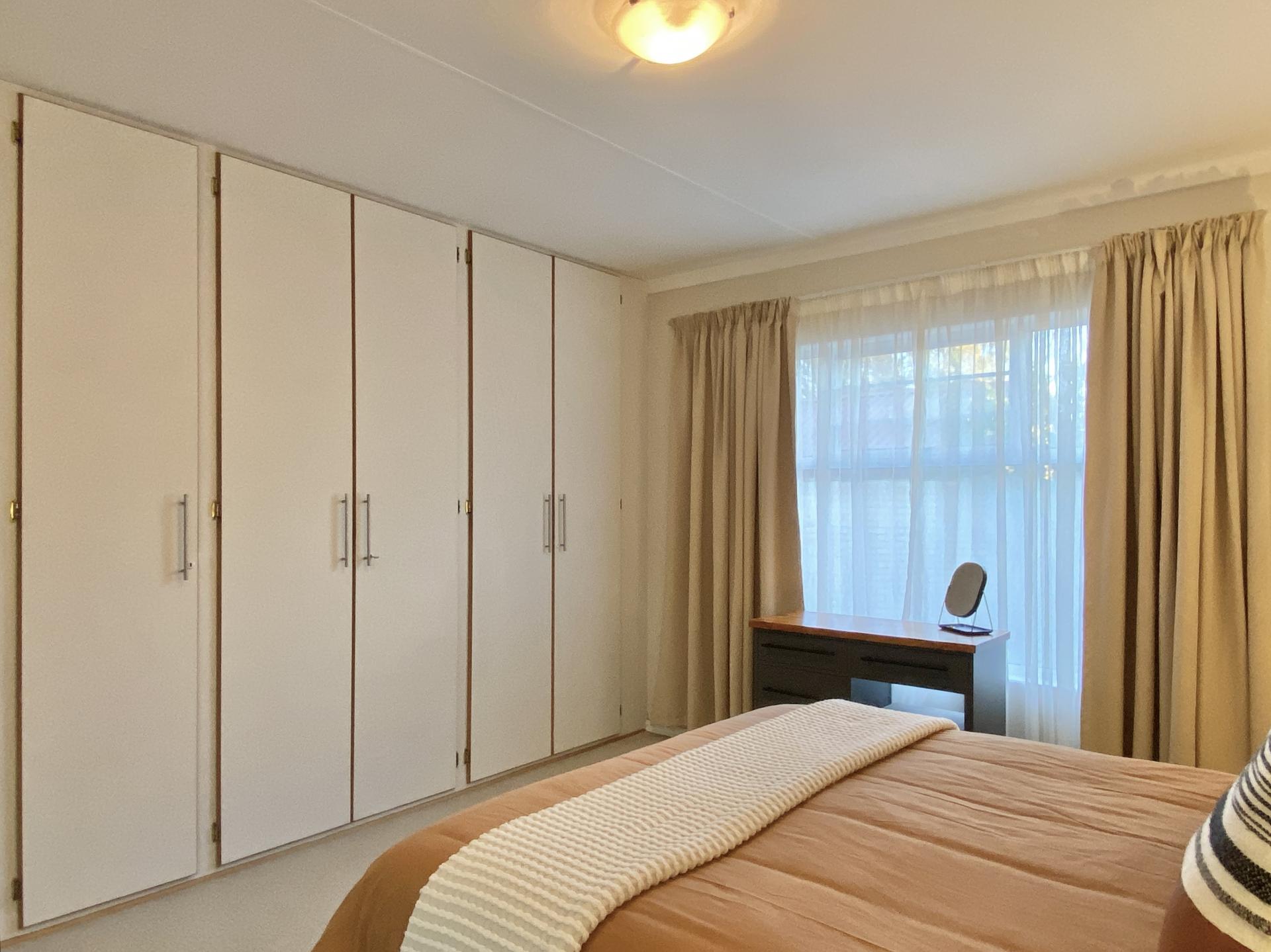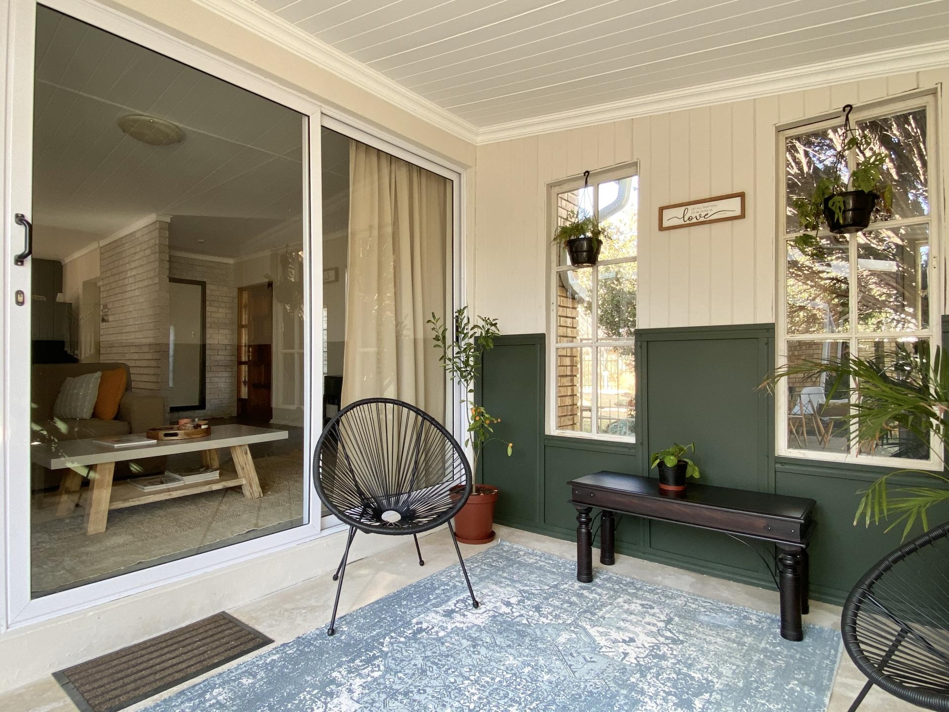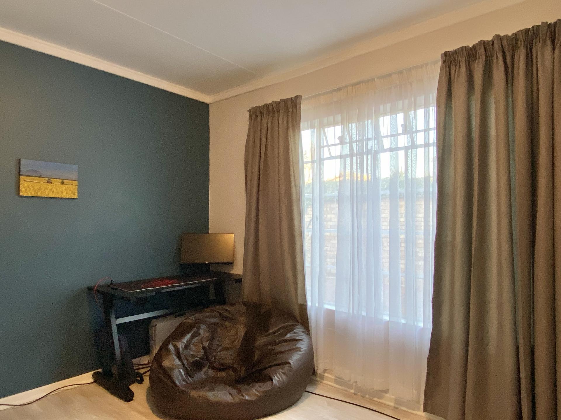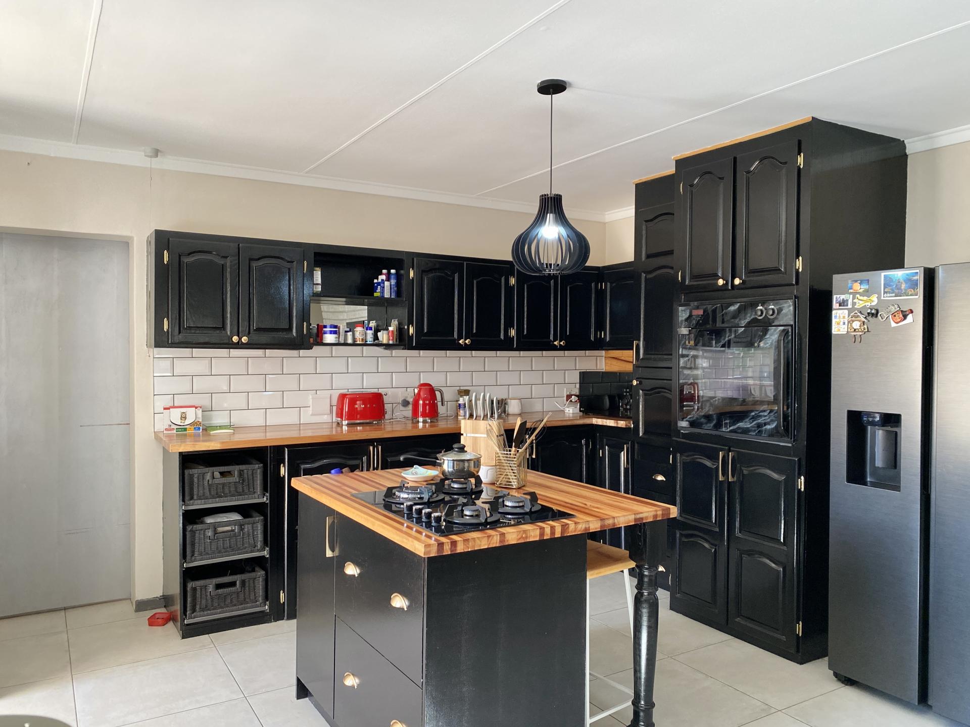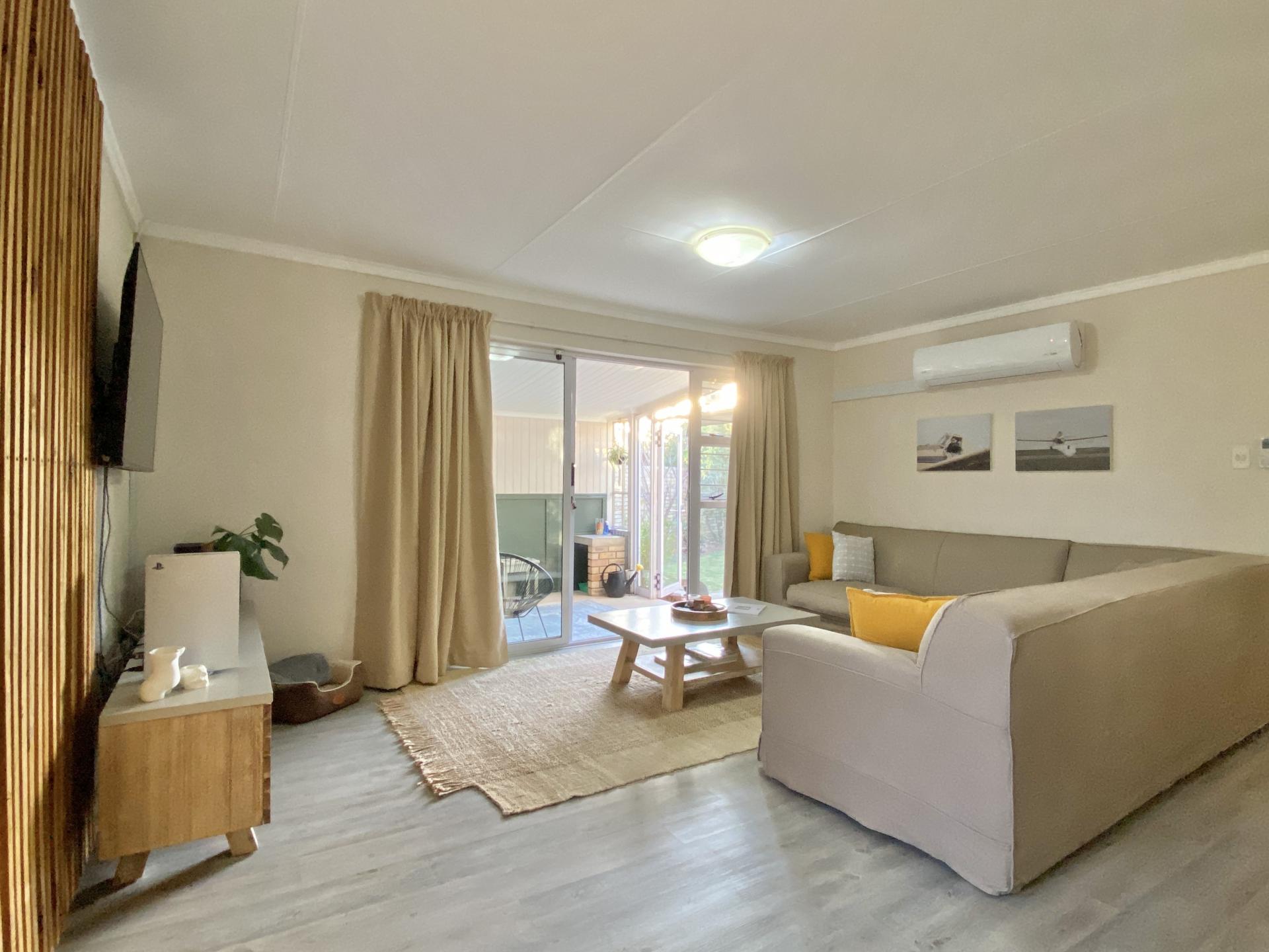 The kitchen, dining- and living room are semi-open plan, creating a lovely flow throughout the house. Adjacent to the kitchen is a neat laundry/scullery with all the necessary fittings. From the living room, an intimate sun lounge welcomes you to the manicured, water-wise garden.