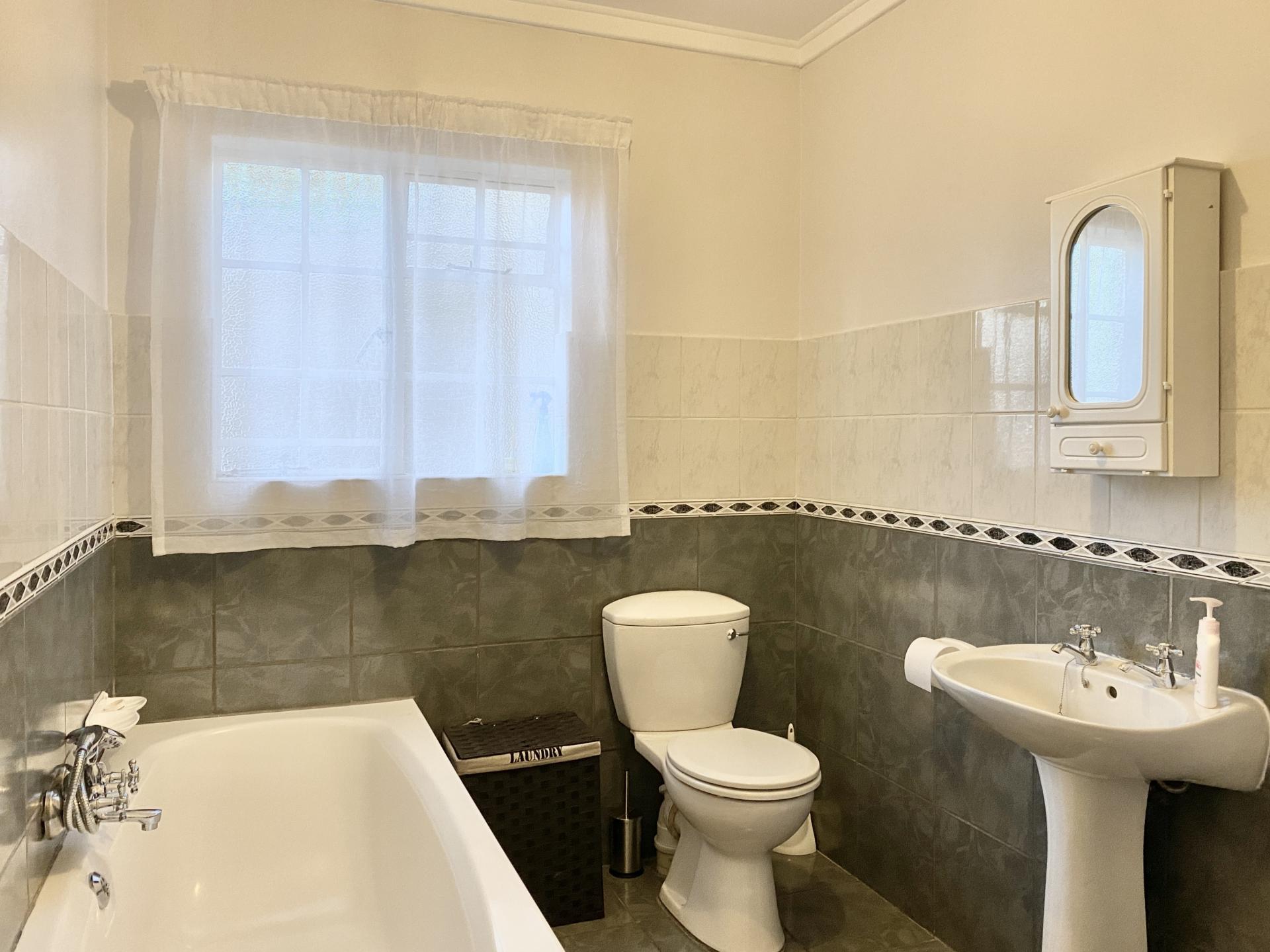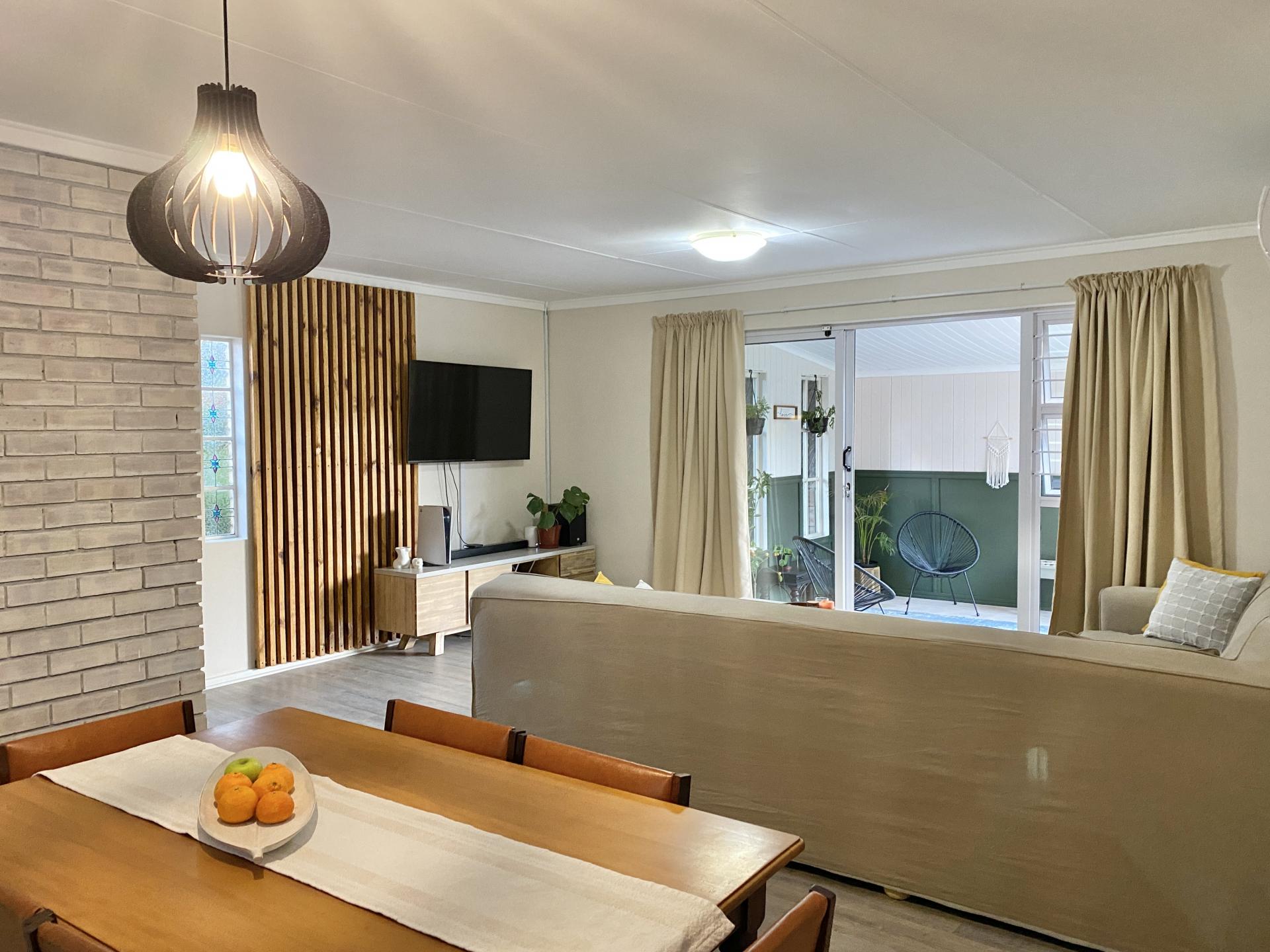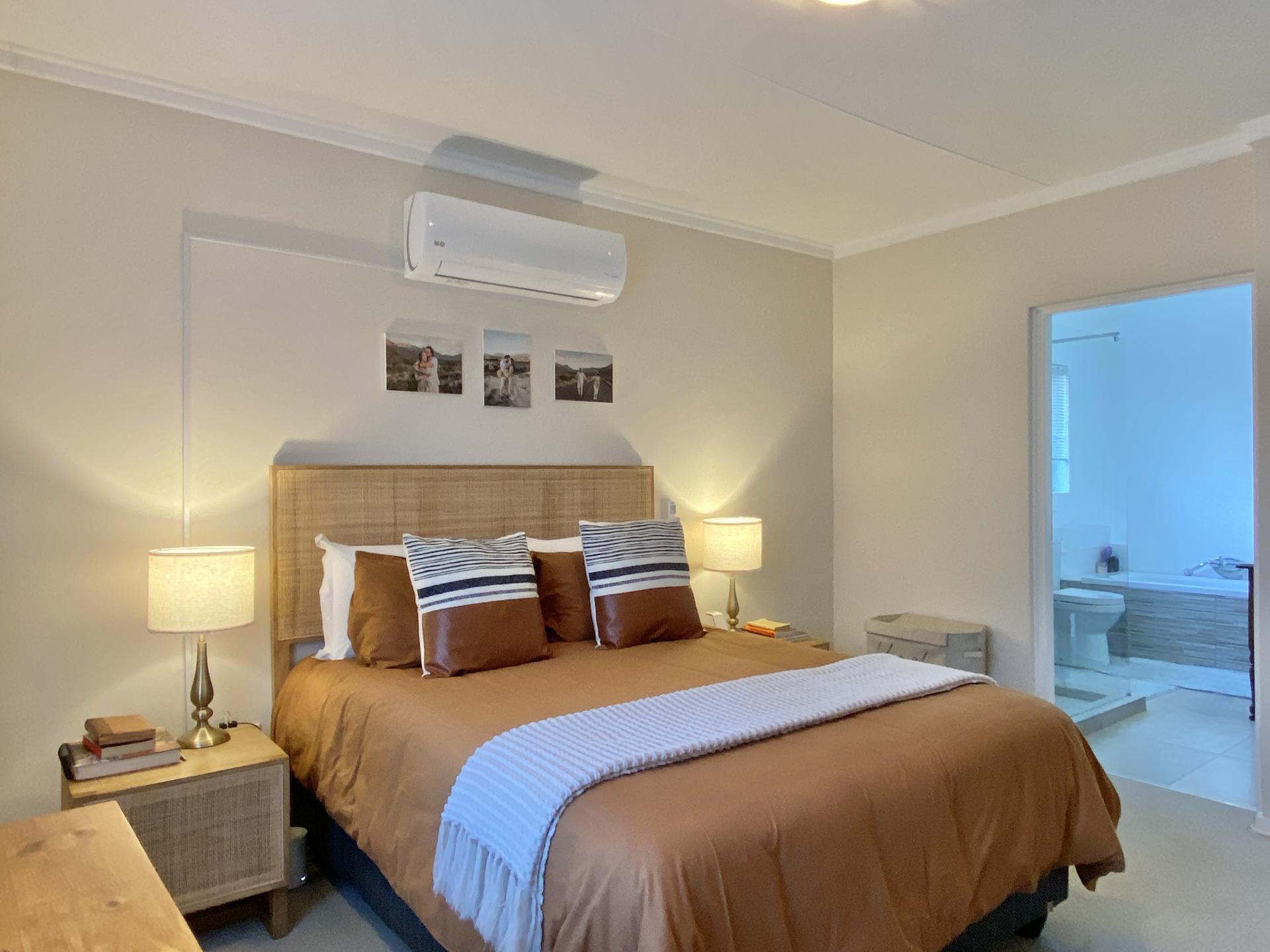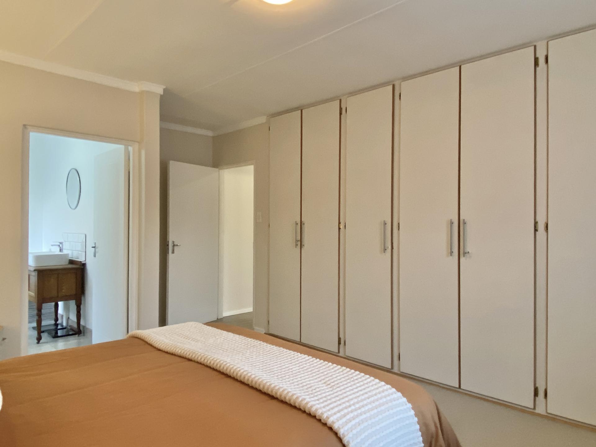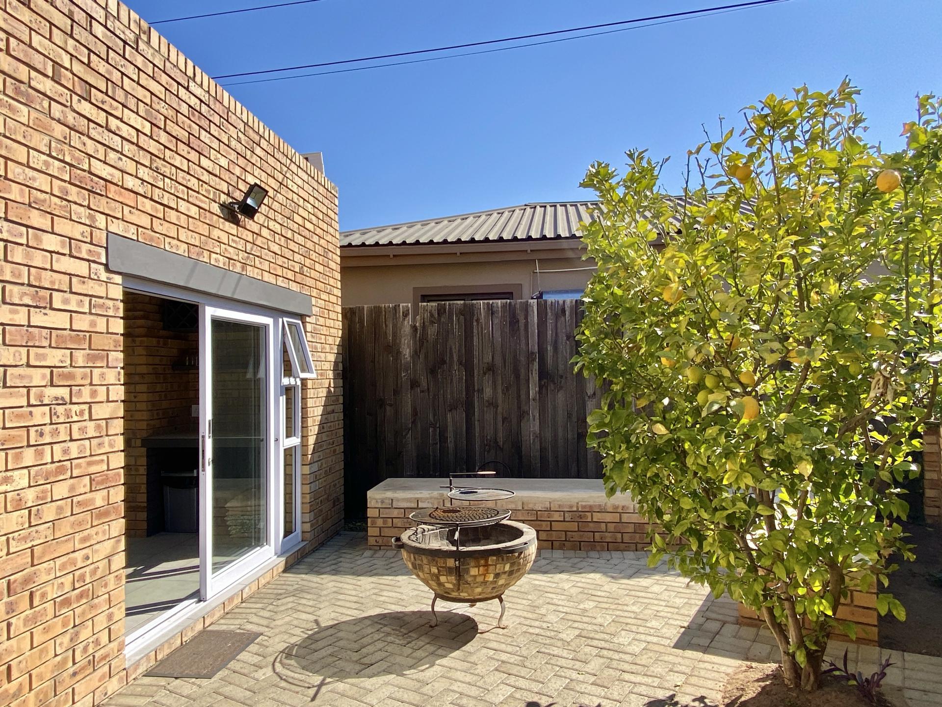 The kitchen, dining- and living room are semi-open plan, creating a lovely flow throughout the house. Adjacent to the kitchen is a neat laundry/scullery with all the necessary fittings. From the living room, an intimate sun lounge welcomes you to the manicured, water-wise garden.