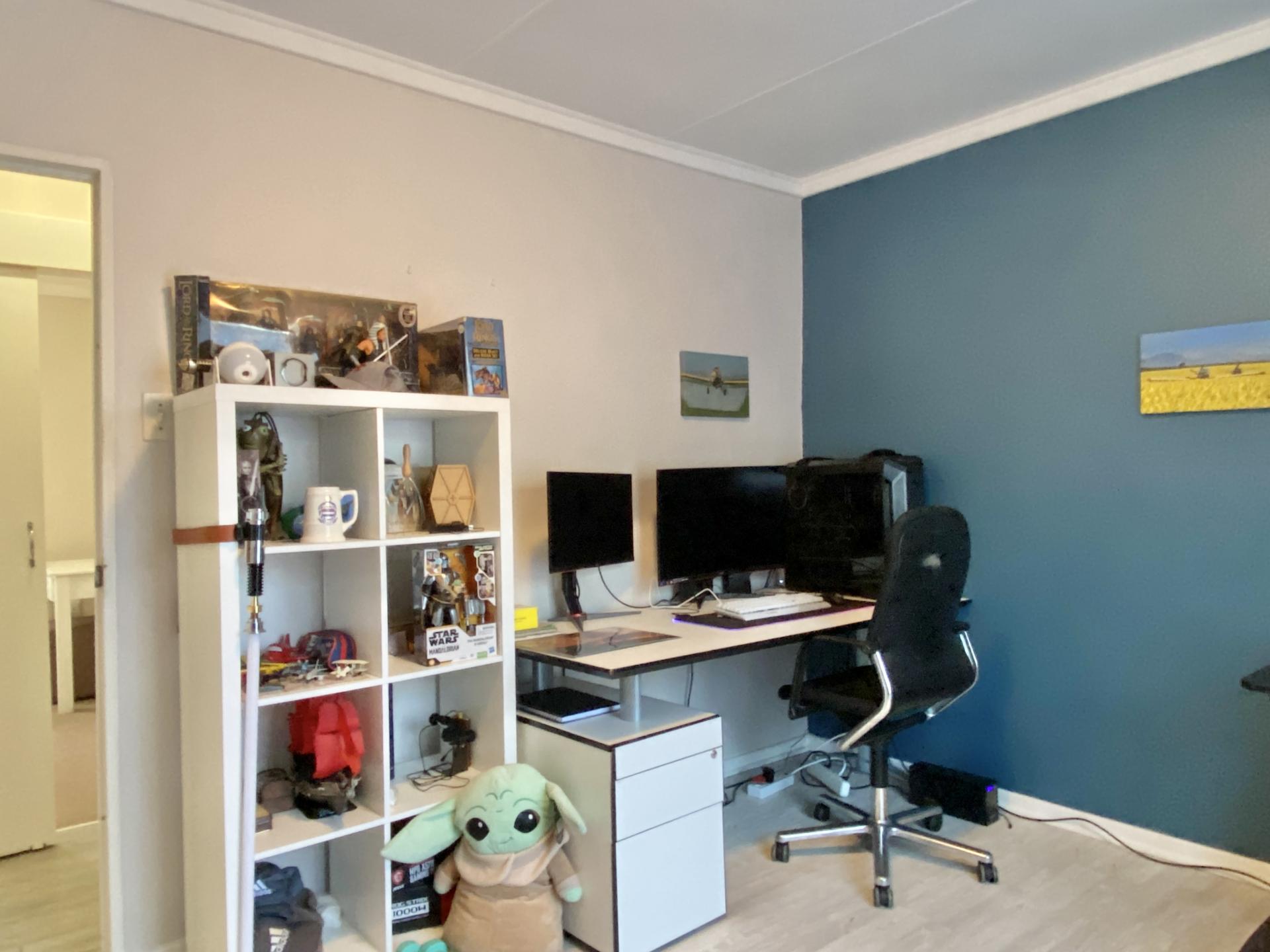 The spacious main bedroom has ample built-in cupboards and features a renovated modern full en-suite bathroom. The second bedroom has built-in cupboards with fitted carpets, and the third bedroom very neat and currently used as an office. The second bathroom is fitted with a basin, toilet and bath.