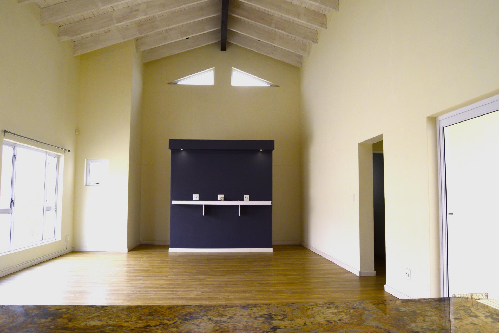 The open-plan living area with dramatic high truss ceilings immediately sets the tone - bright, airy, and welcoming.