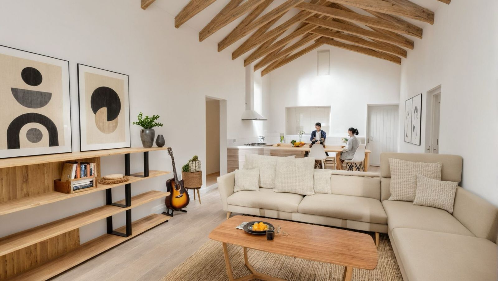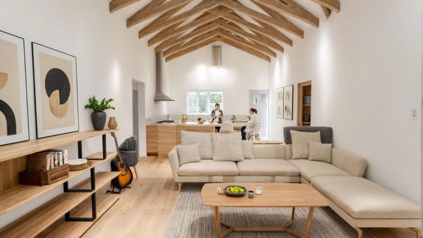 ✔ Striking high-volume ceilings with exposed wooden trusses