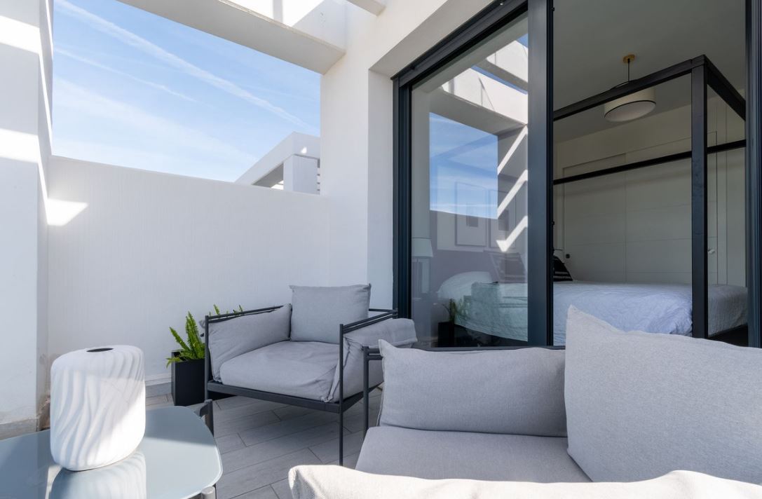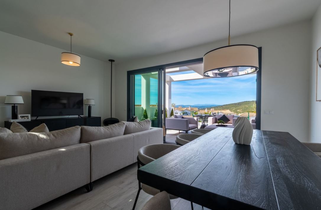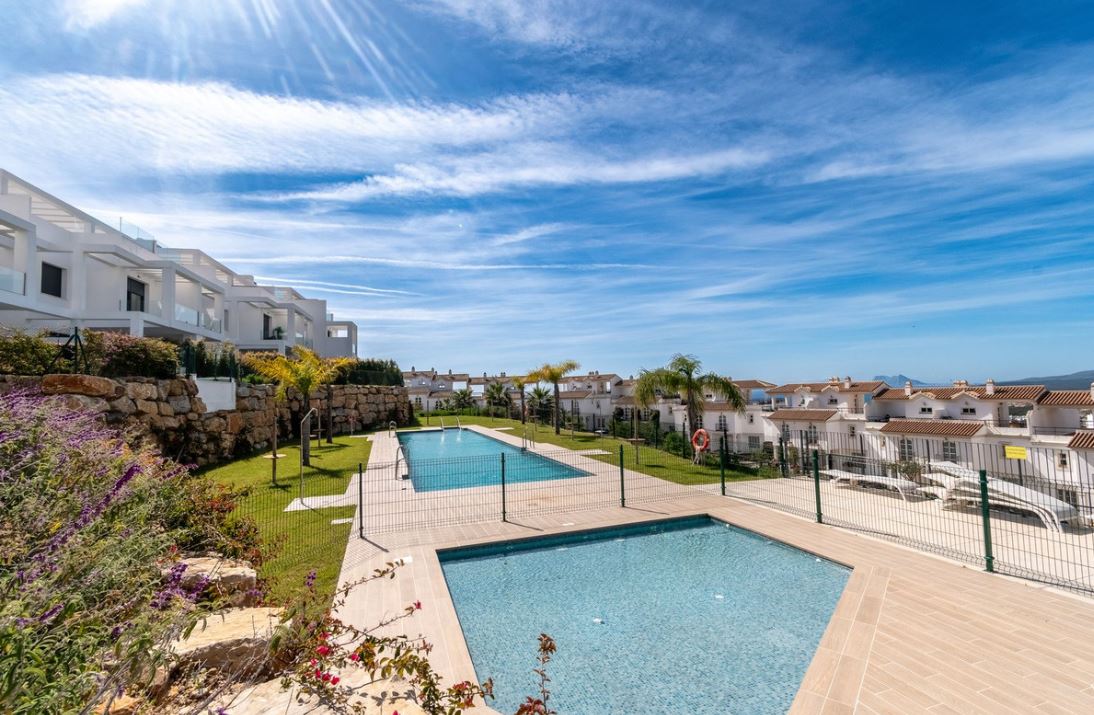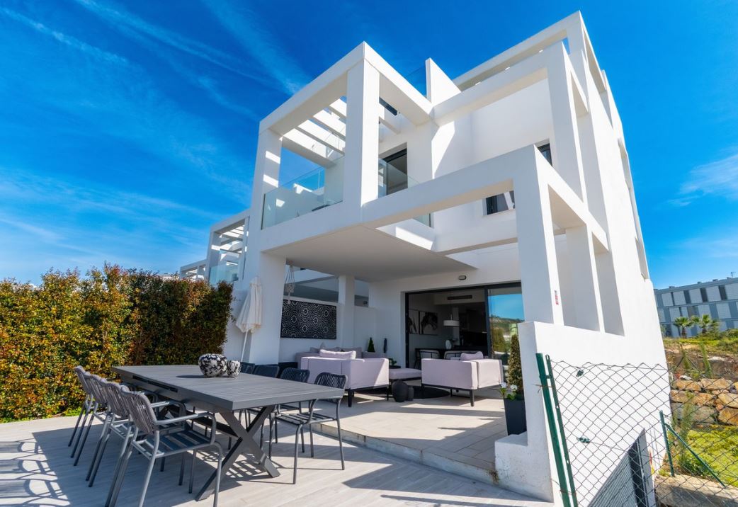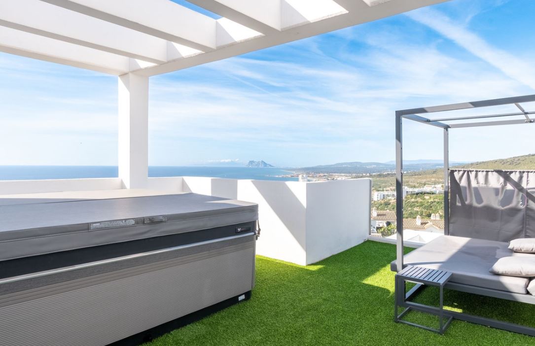 Beautifully furnished 3-bedroom semi-detached house with panoramic sea views, private garden, rooftop jacuzzi, modern open-plan living, and access to pools and paddle court in a gated community near Sotogrande and La Duquesa.