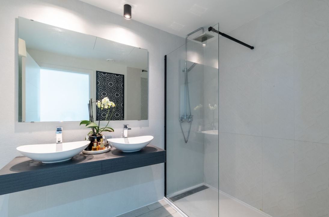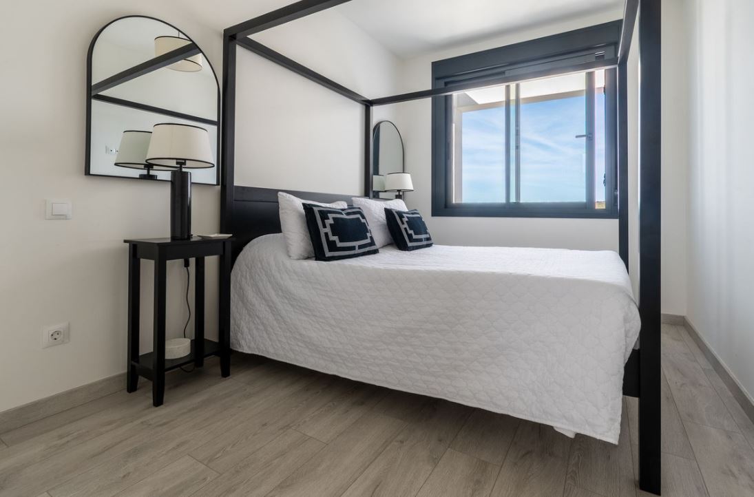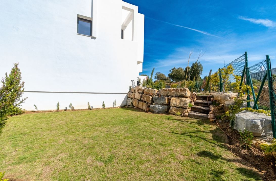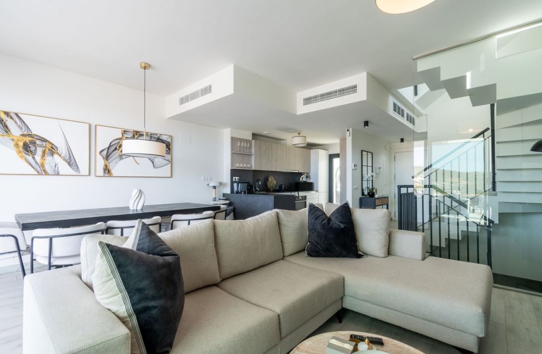 Beautifully furnished 3-bedroom semi-detached house with panoramic sea views, private garden, rooftop jacuzzi, modern open-plan living, and access to pools and paddle court in a gated community near Sotogrande and La Duquesa.