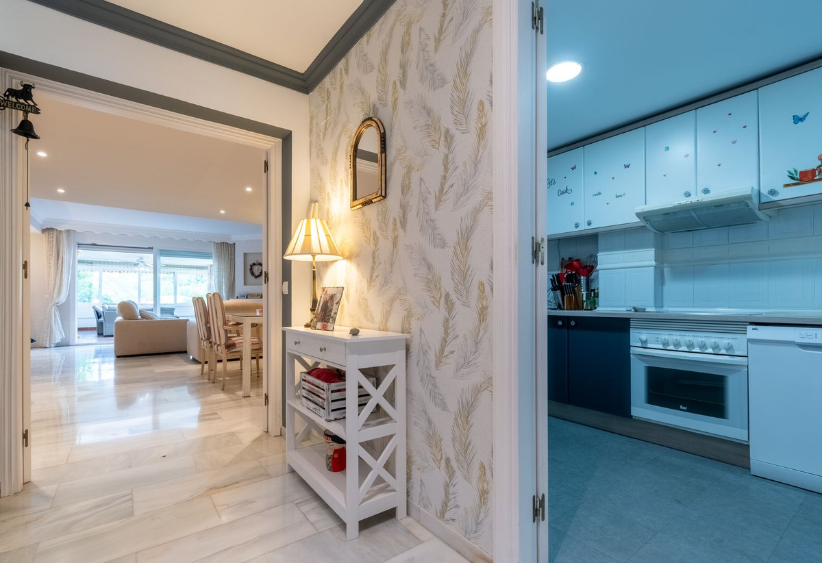 In addition to the solarium, there is a 30 m² enclosed winter terrace with views of La Concha, the communal swimming pool, and a lush pine grove. The property includes both a private underground parking space and an exterior parking area.