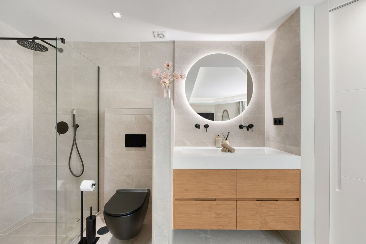 Boasting 235 square meters of space, including 165 square meters of refined interiors and 70 square meters of terrace, the property provides a rare sense of privacy in a prime location. The open-plan living area on the first floor includes a stylish kitchen equipped with Siemens appliances and an island perfect for entertaining. A guest toilet and a bedroom with an en-suite on this level enhance functionality and accessibility.