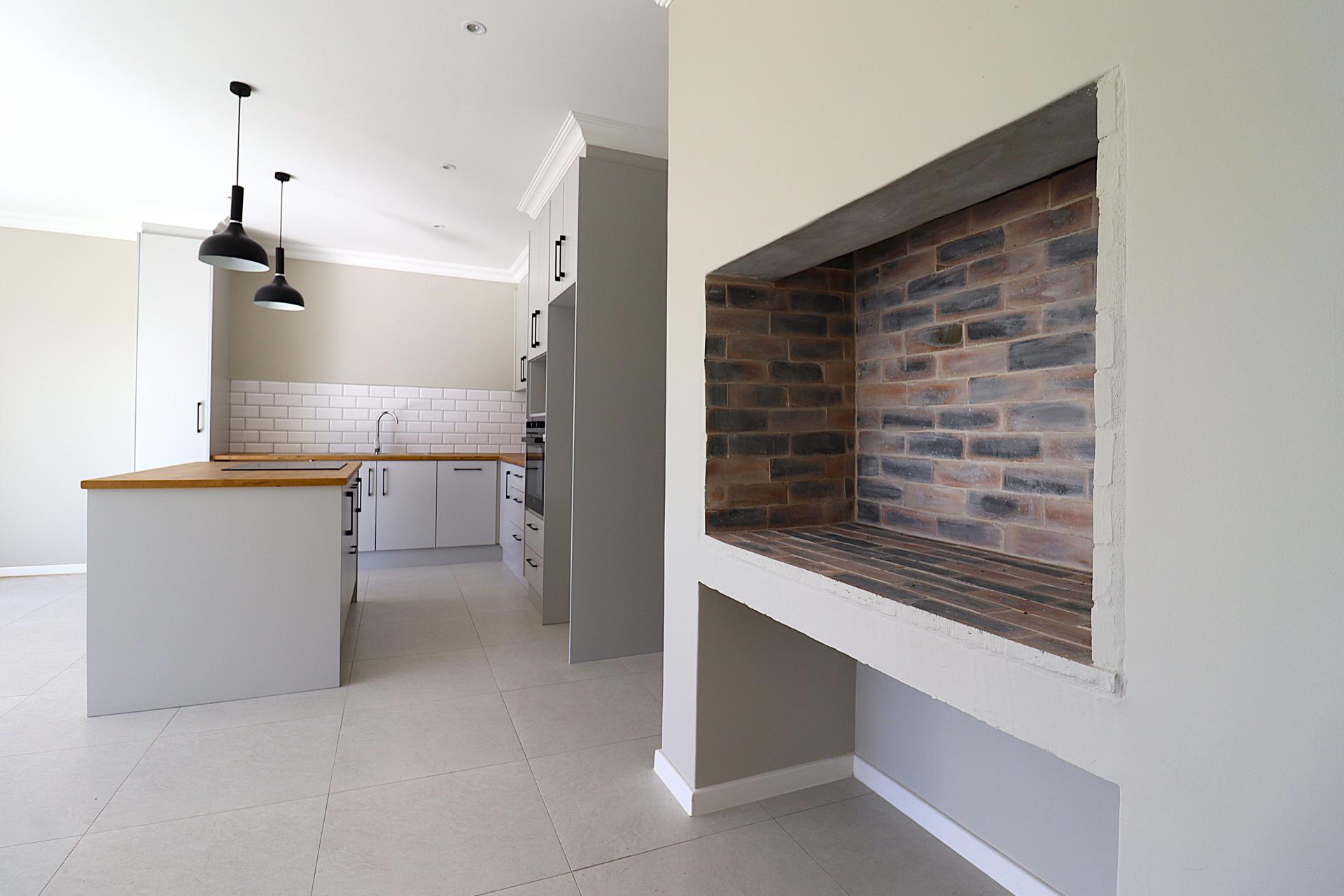 Inside, an open-plan kitchen with ample built-in cupboards, a stove, and an oven flows seamlessly into the lounge and dining area.