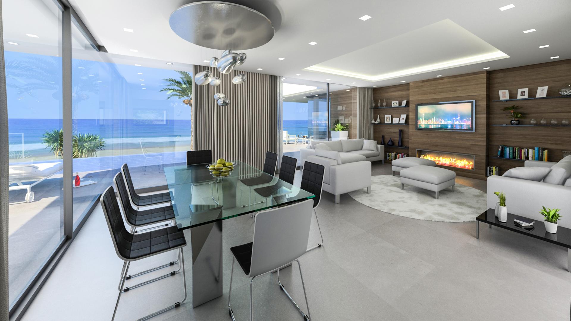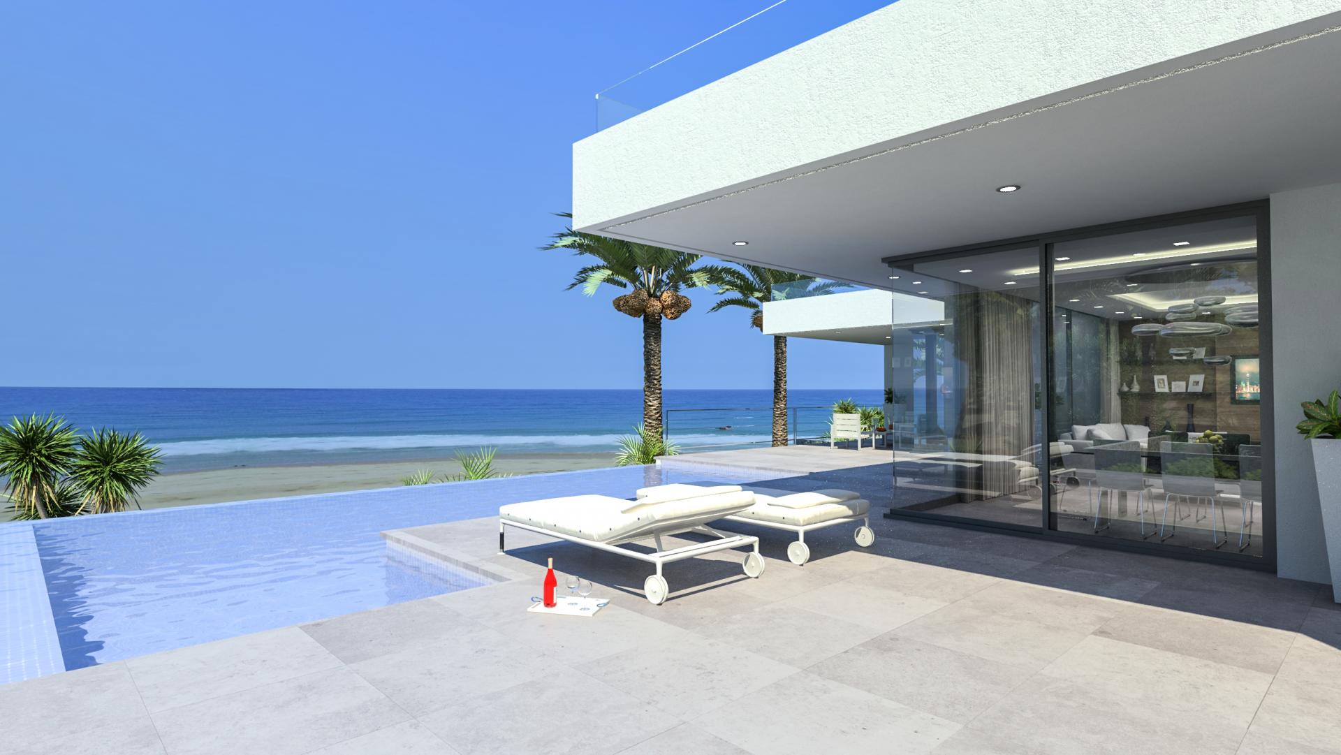 PROPERTY DETAILS Consisting of 3 bedrooms 4 bathrooms in a modern contemporary design with large expanses of glass to maximise the front-line beach location and sea views. The main level offers open concept living to include lounge with wall mounted fire, dining area and high spec fully fitted kitchen with integrated appliances and central island with hob, suspended overhead ceiling extractor and a casual dining/breakfast area perfect when cooking for the family or casual entertaining, areas that open out to open and covered terraces for alfresco dining and relaxing on this level there is also a guest toilet and a guest bedroom with ensuite with access to a private terrace leading the pool, an internal staircase from the entrance hall leads to the upper level consisting of two bedrooms both with ensuite which includes the large master bedroom suite, both of which enjoy the large private terrace from which to enjoy the fabulous beach and sea views.