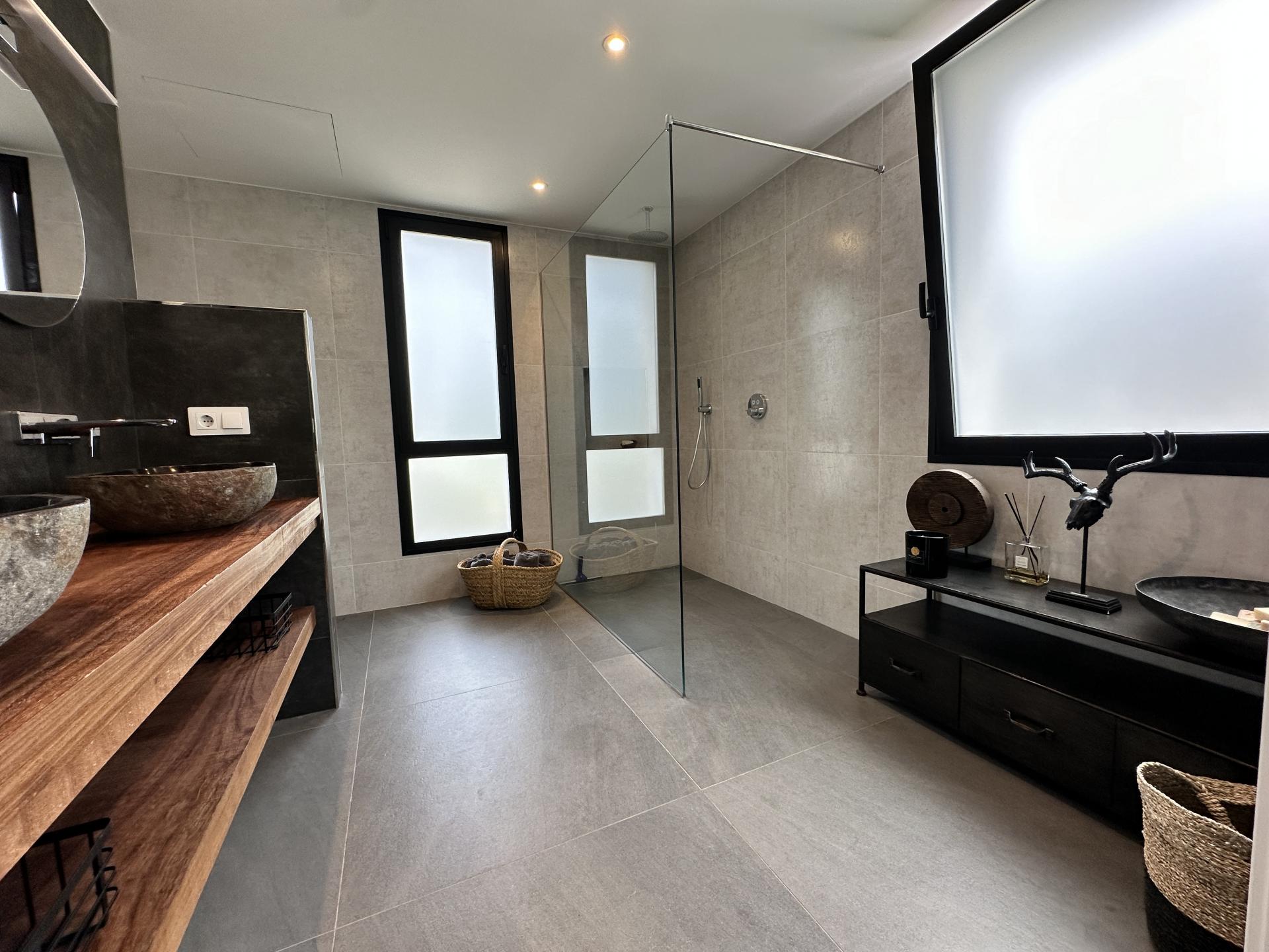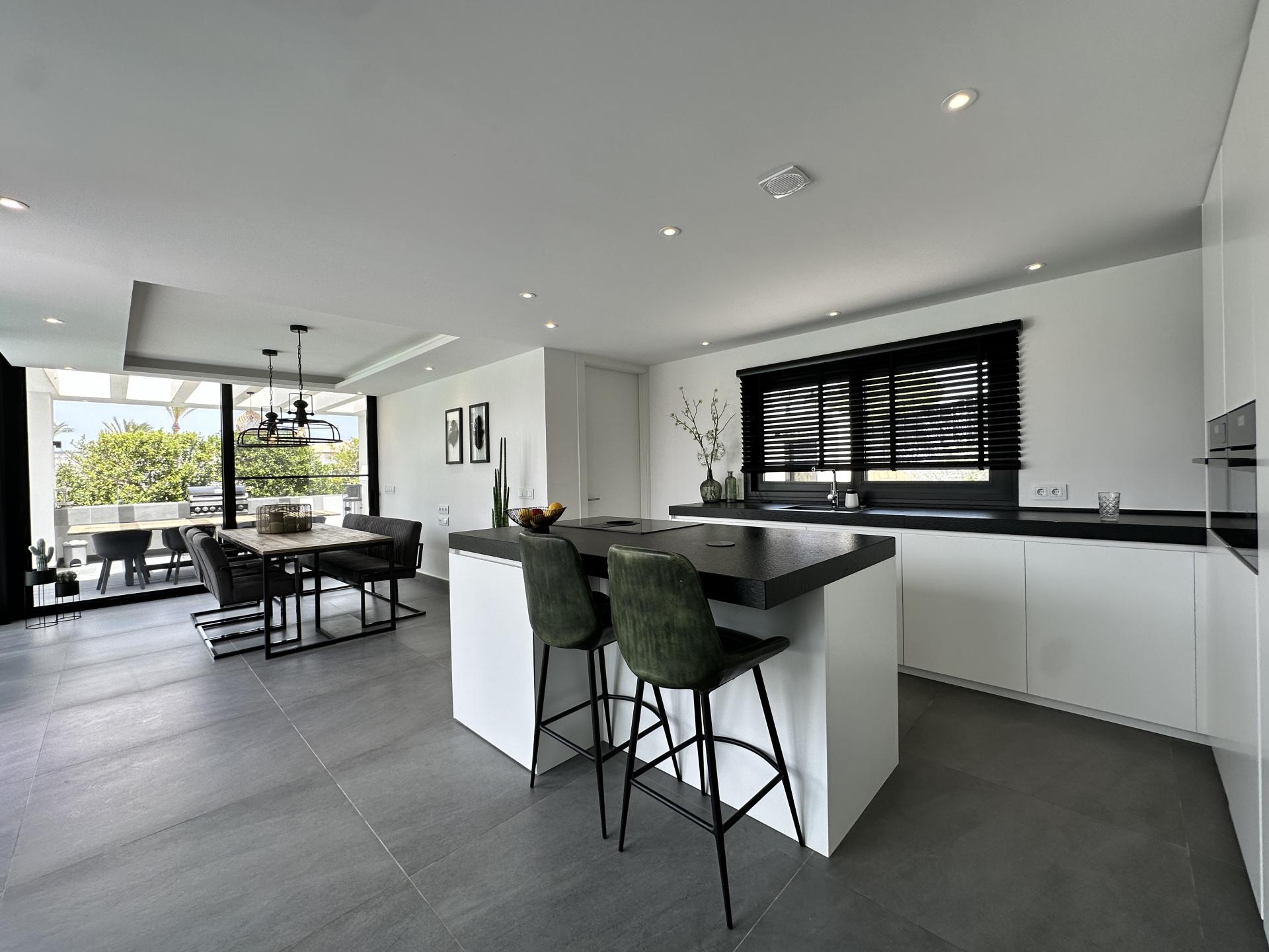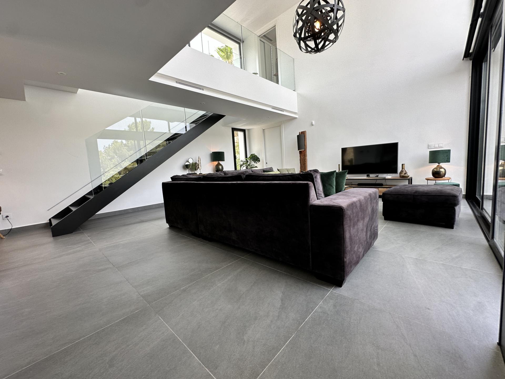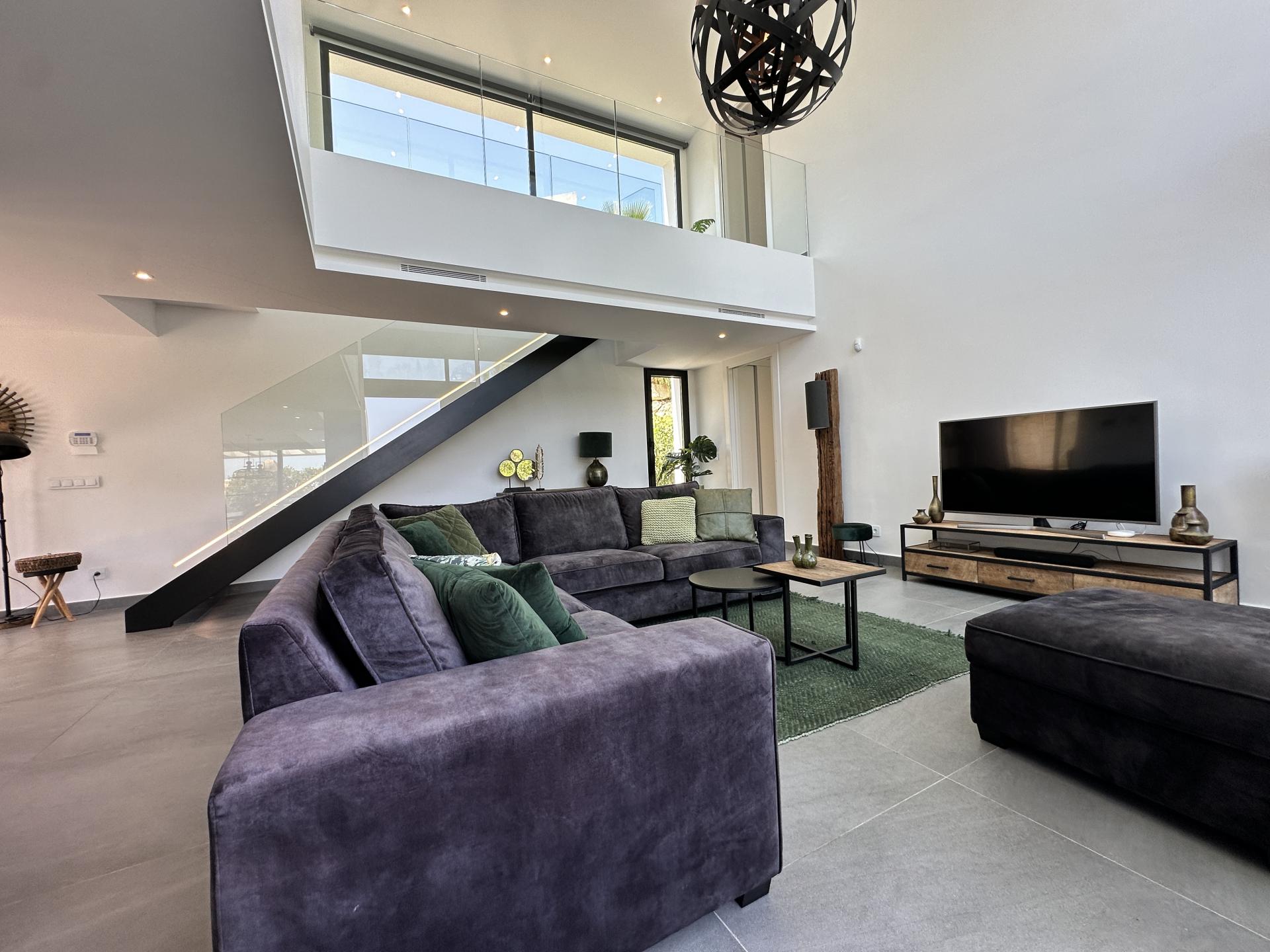 PROPERTY DETAILS This luxurious villa is built over two levels and offers spacious accommodation designed for modern living. The welcoming entrance leads into the double-height open plan living area, which includes a lounge, formal dining area, and a modern equipped kitchen with a counter island with hob and casual dining/breakfasting seating. This area opens to the outside pool, terracing, and summer kitchen, allowing for seamless indoor-outdoor living. There is also a separate utility/laundry room off the kitchen and a guest toilet.