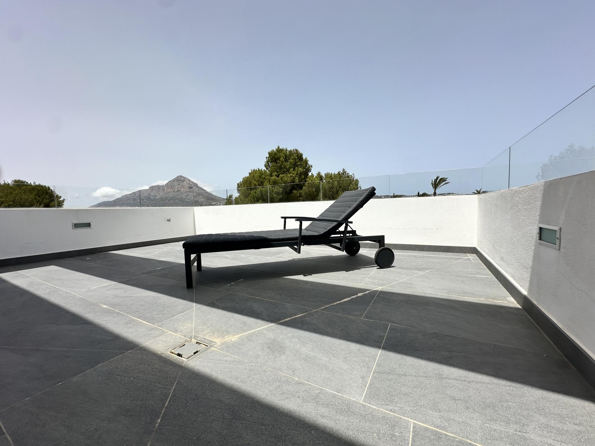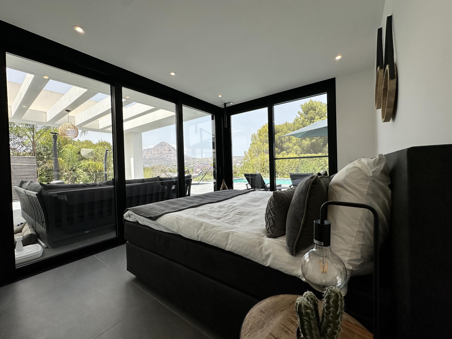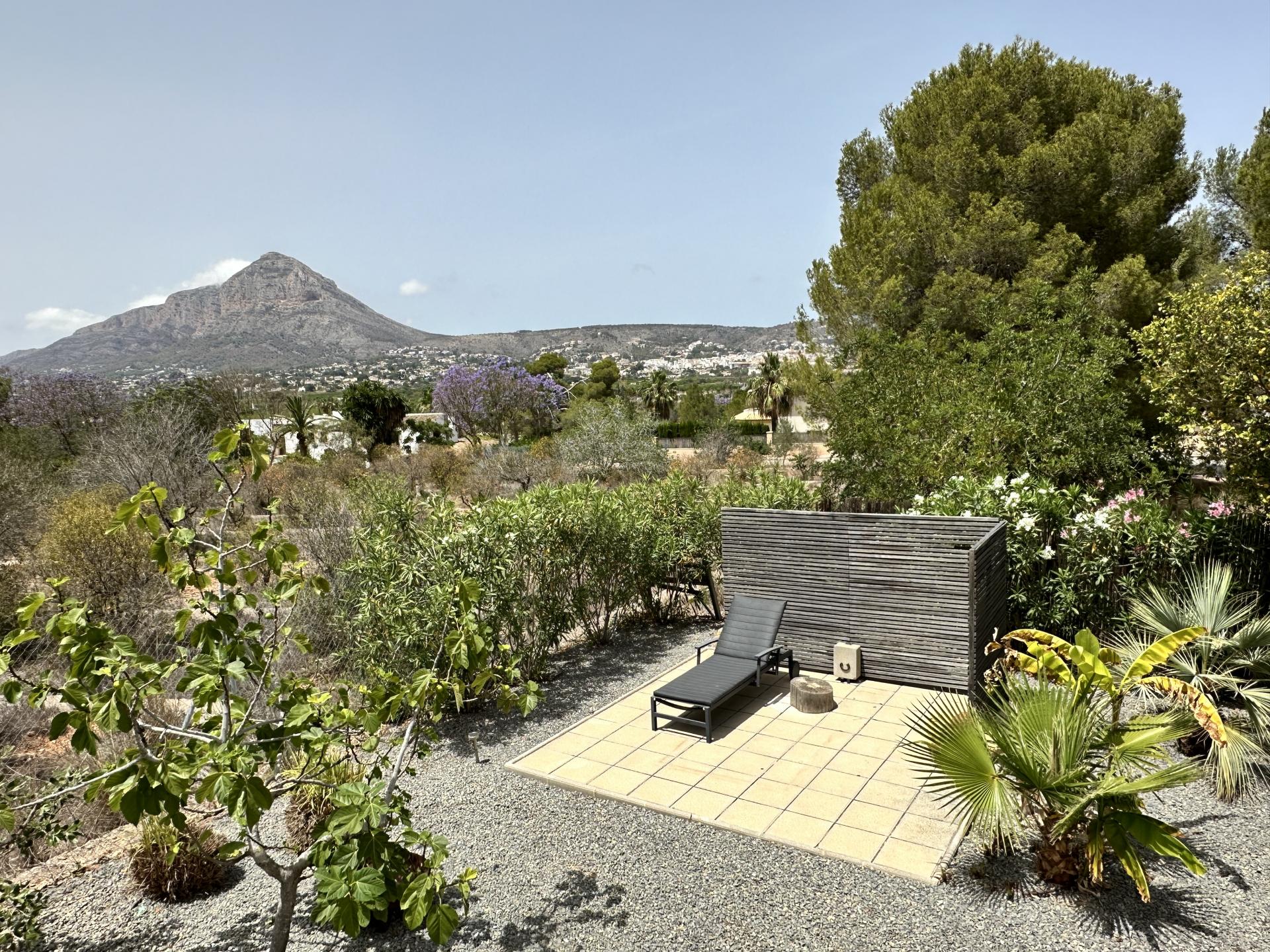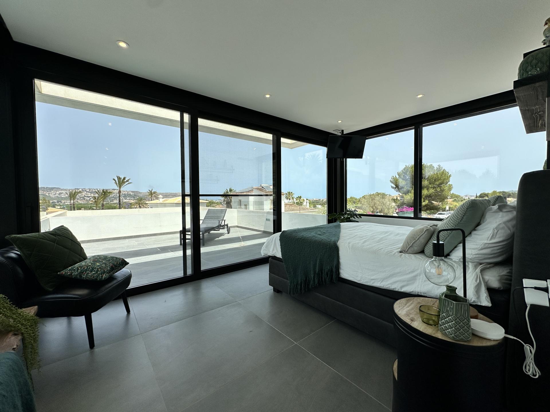 The villa boasts three bedrooms in total. On the main level, there is an ensuite guest bedroom which opens to the pool and terracing. The upper level features two additional ensuite bedrooms, including the master suite, which has a private terrace with open views of the Montgo mountain, Cap San Antonio, and the Mediterranean Sea.