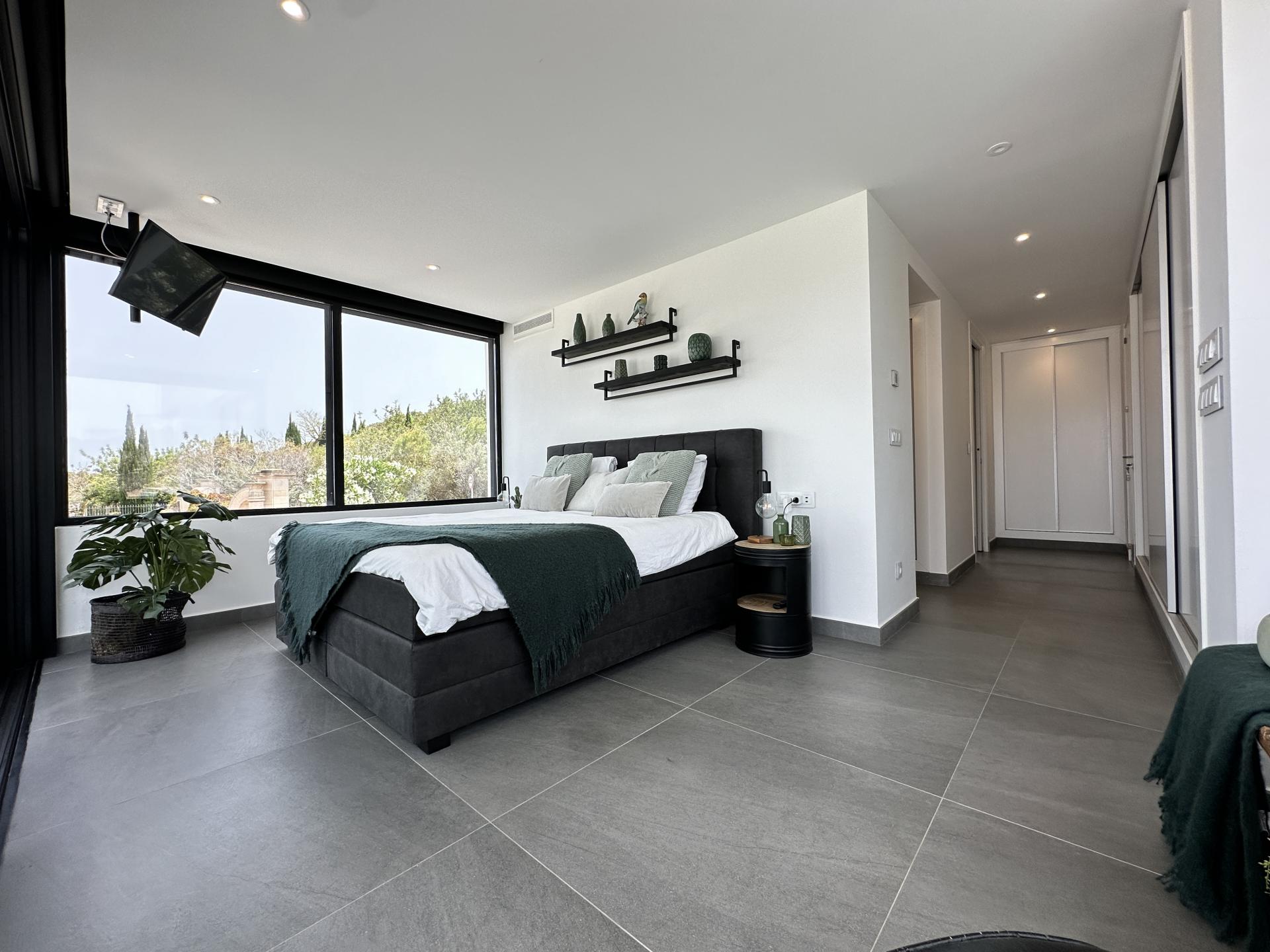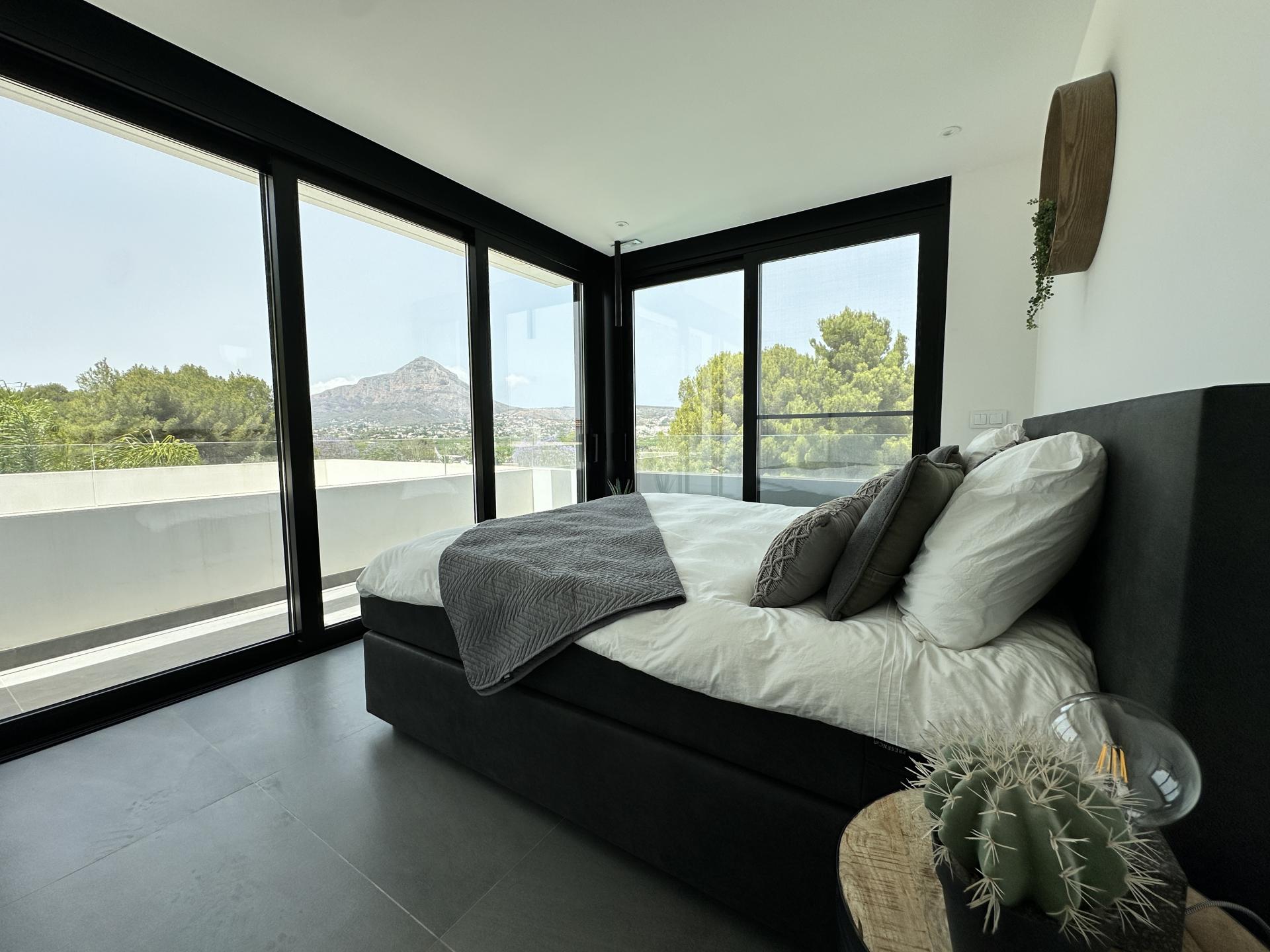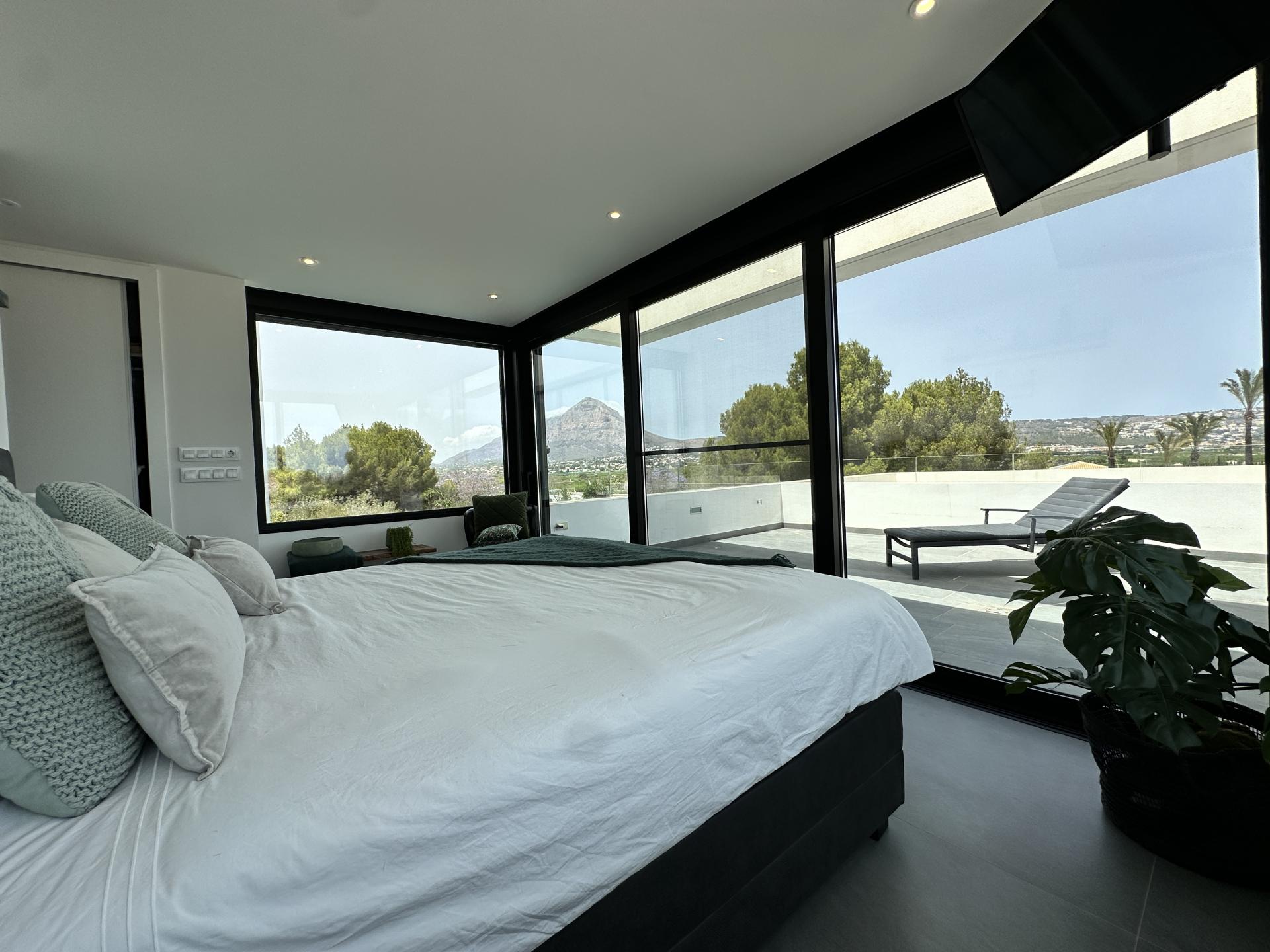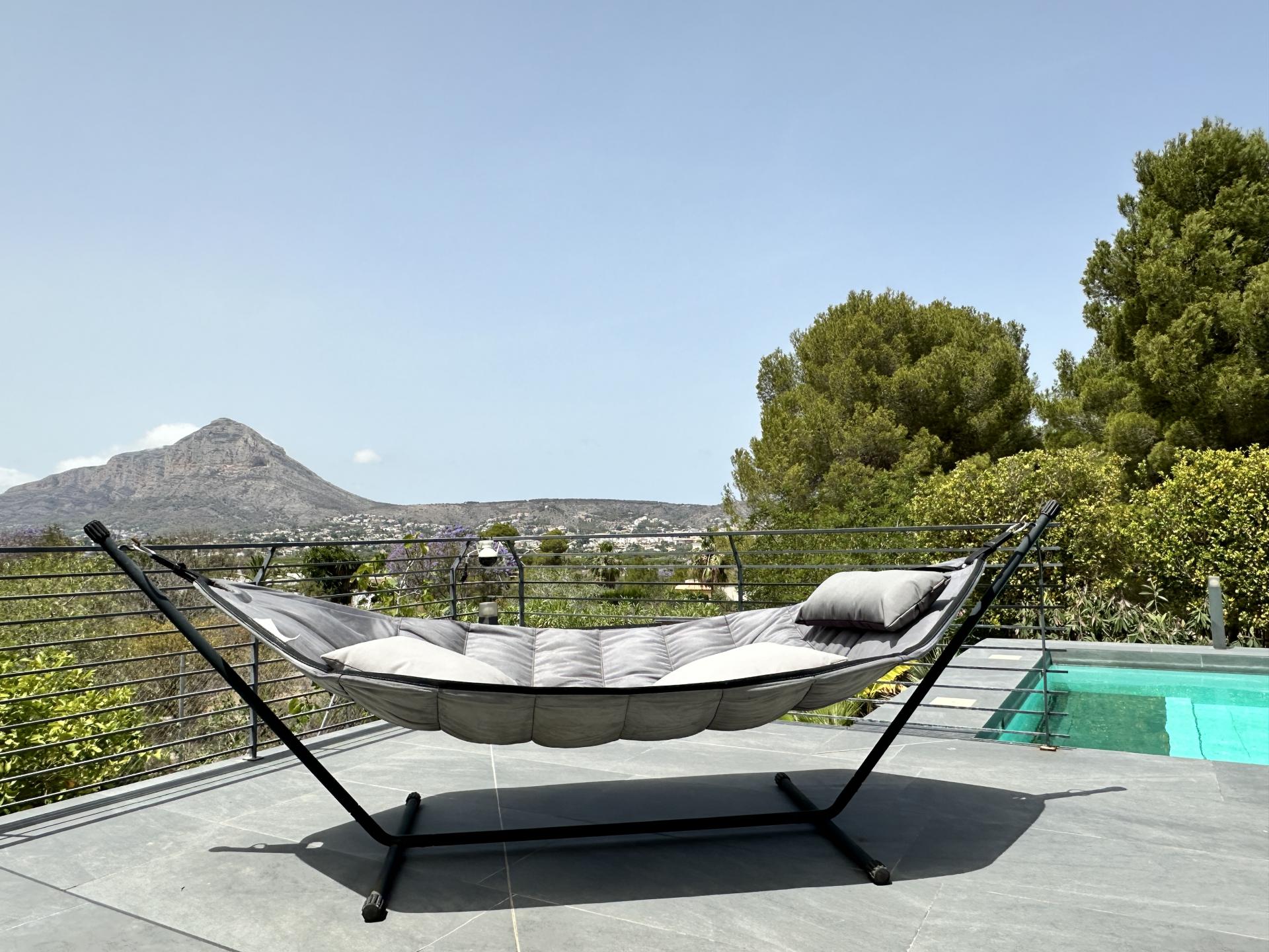 The villa boasts three bedrooms in total. On the main level, there is an ensuite guest bedroom which opens to the pool and terracing. The upper level features two additional ensuite bedrooms, including the master suite, which has a private terrace with open views of the Montgo mountain, Cap San Antonio, and the Mediterranean Sea.