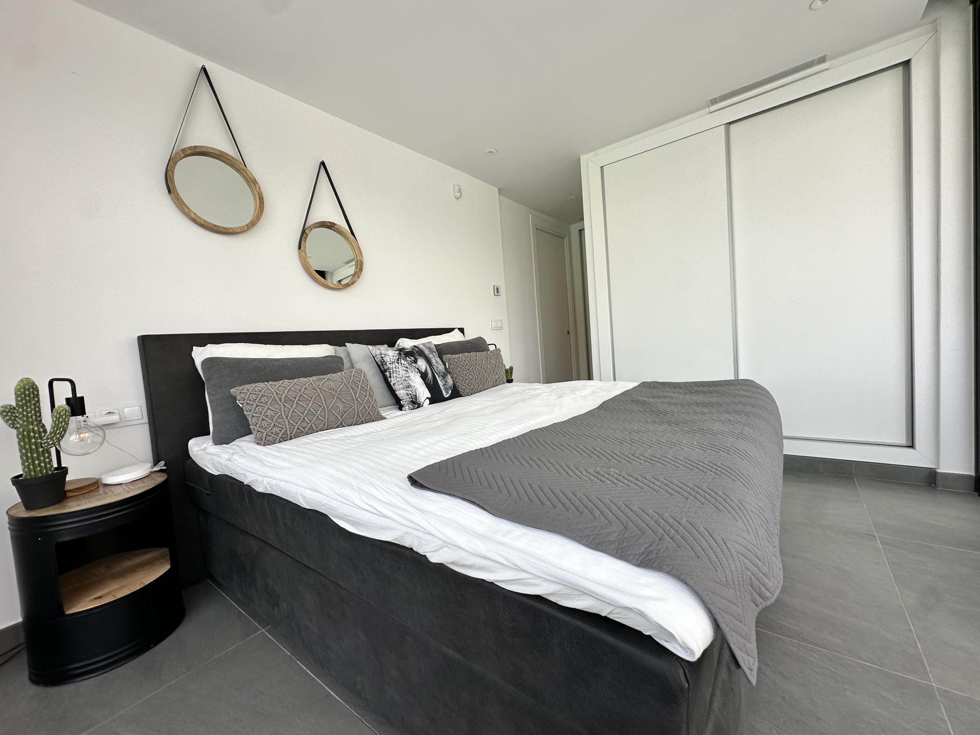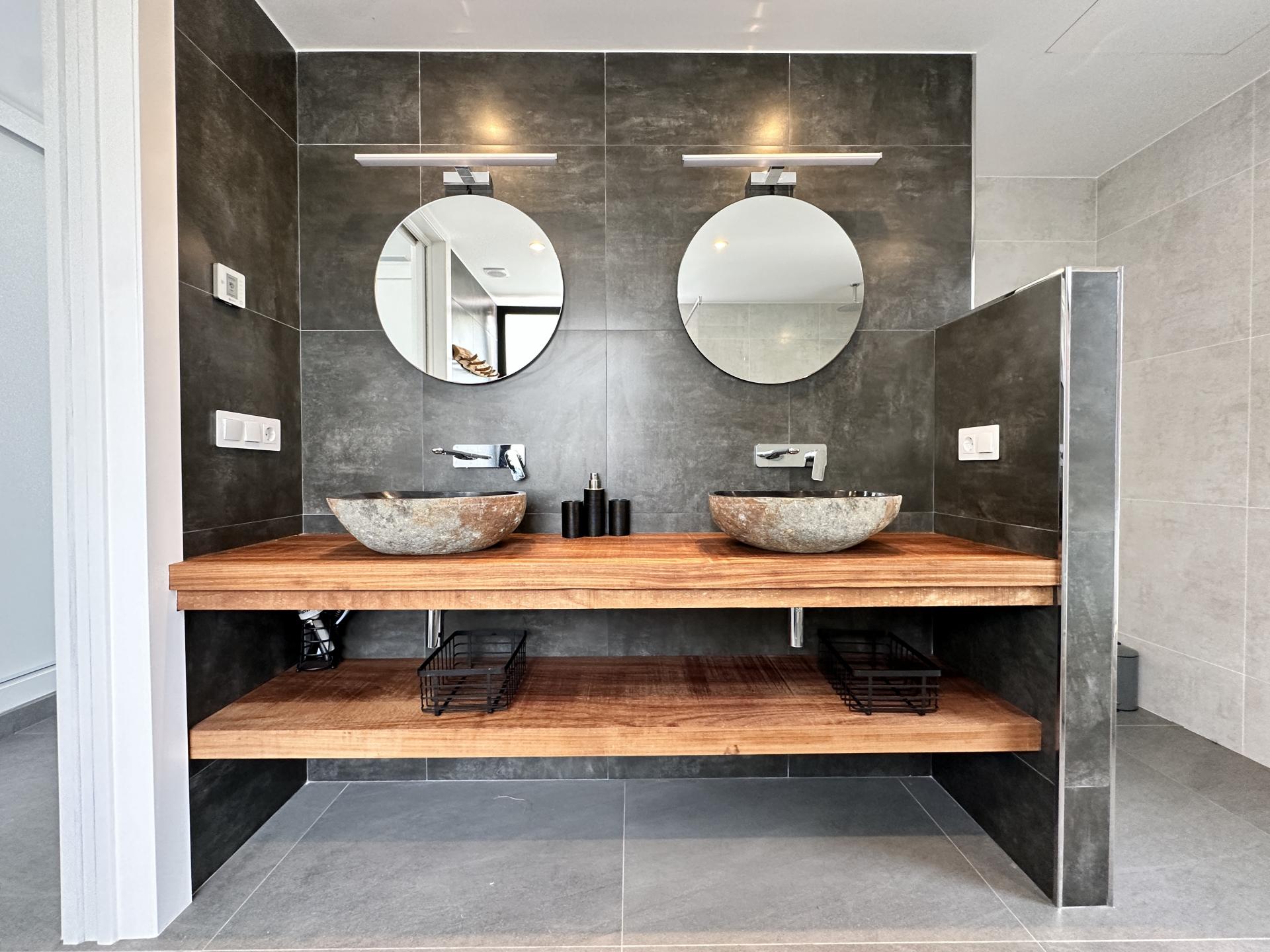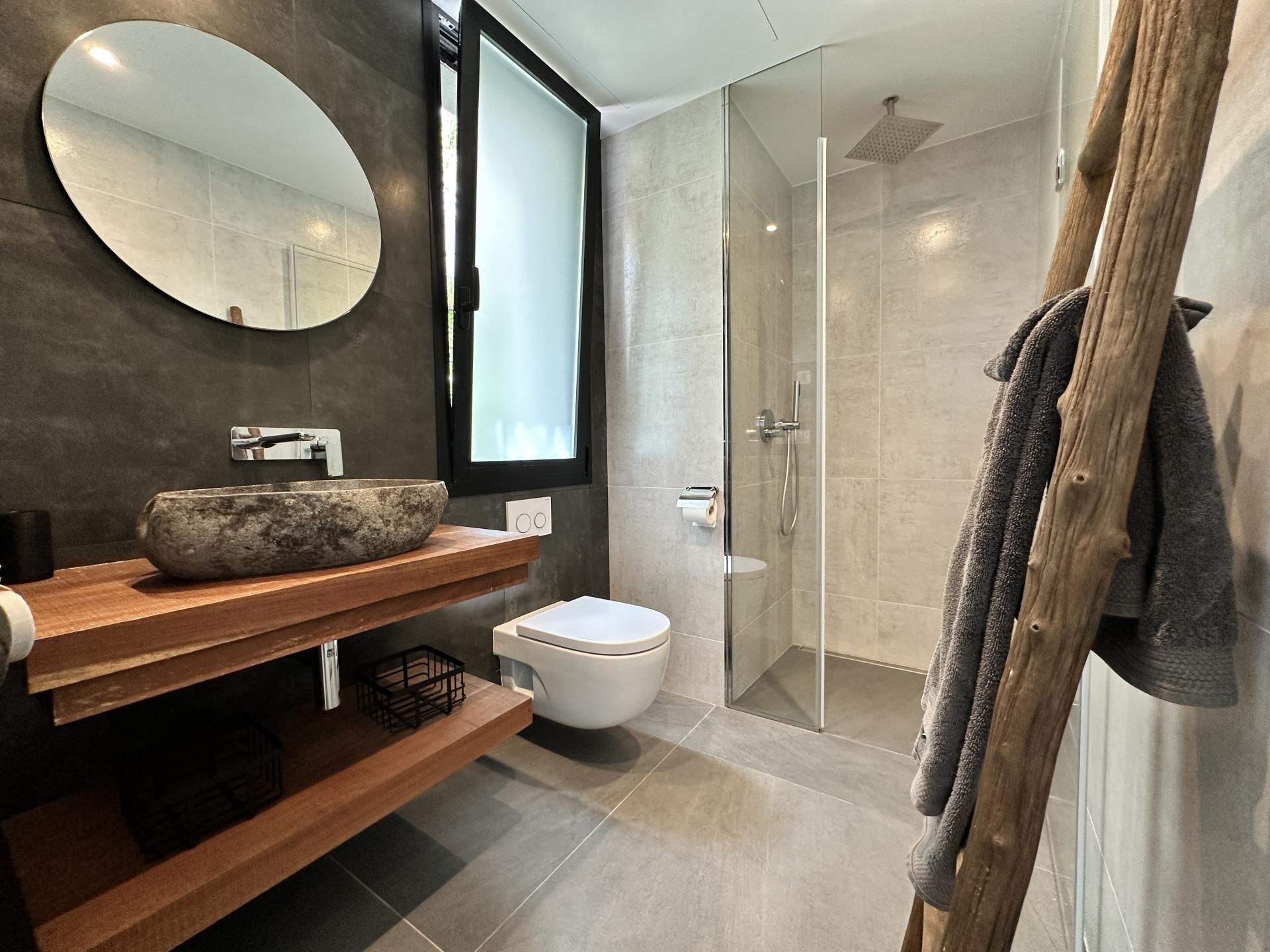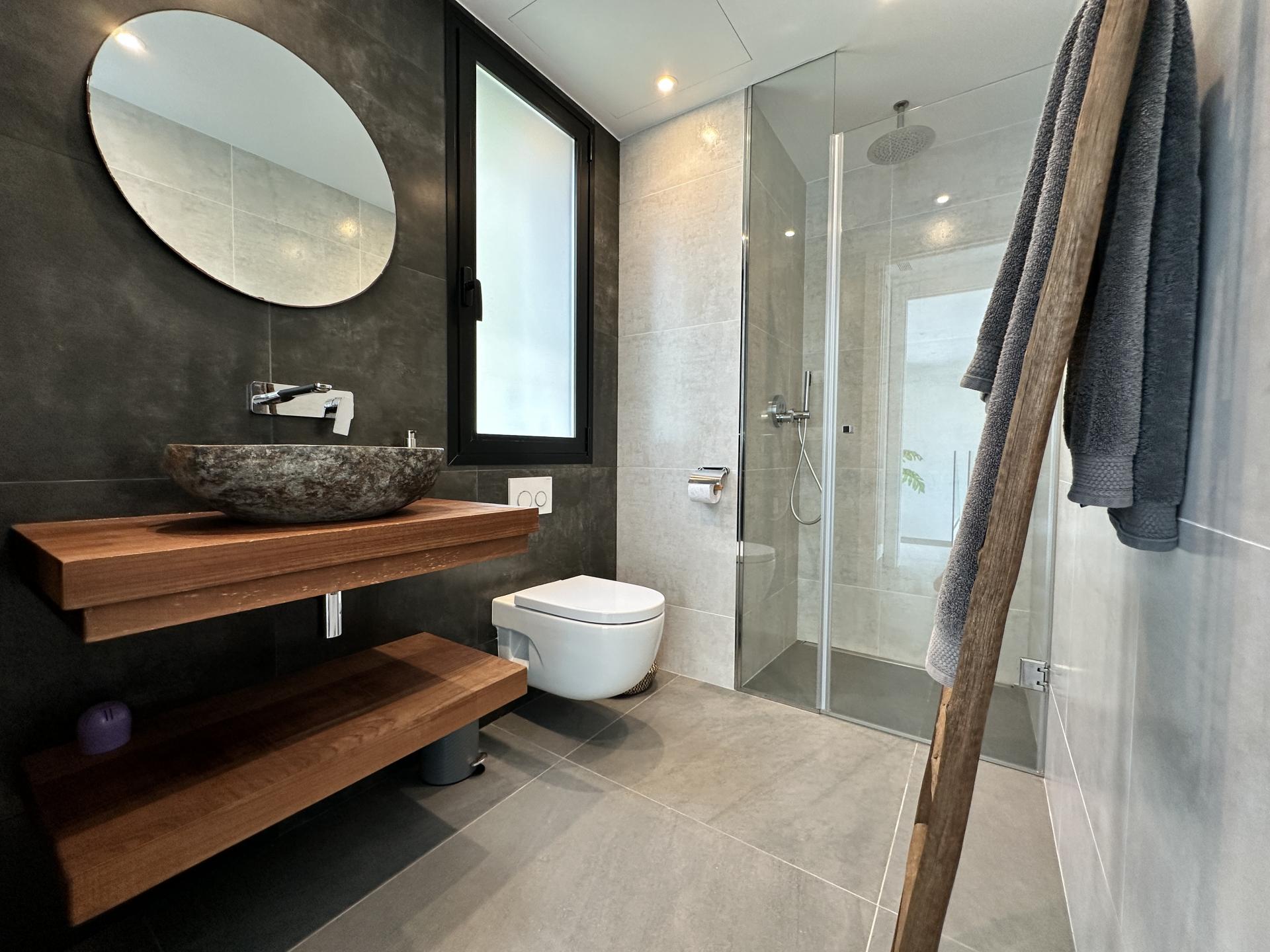 The villa boasts three bedrooms in total. On the main level, there is an ensuite guest bedroom which opens to the pool and terracing. The upper level features two additional ensuite bedrooms, including the master suite, which has a private terrace with open views of the Montgo mountain, Cap San Antonio, and the Mediterranean Sea.