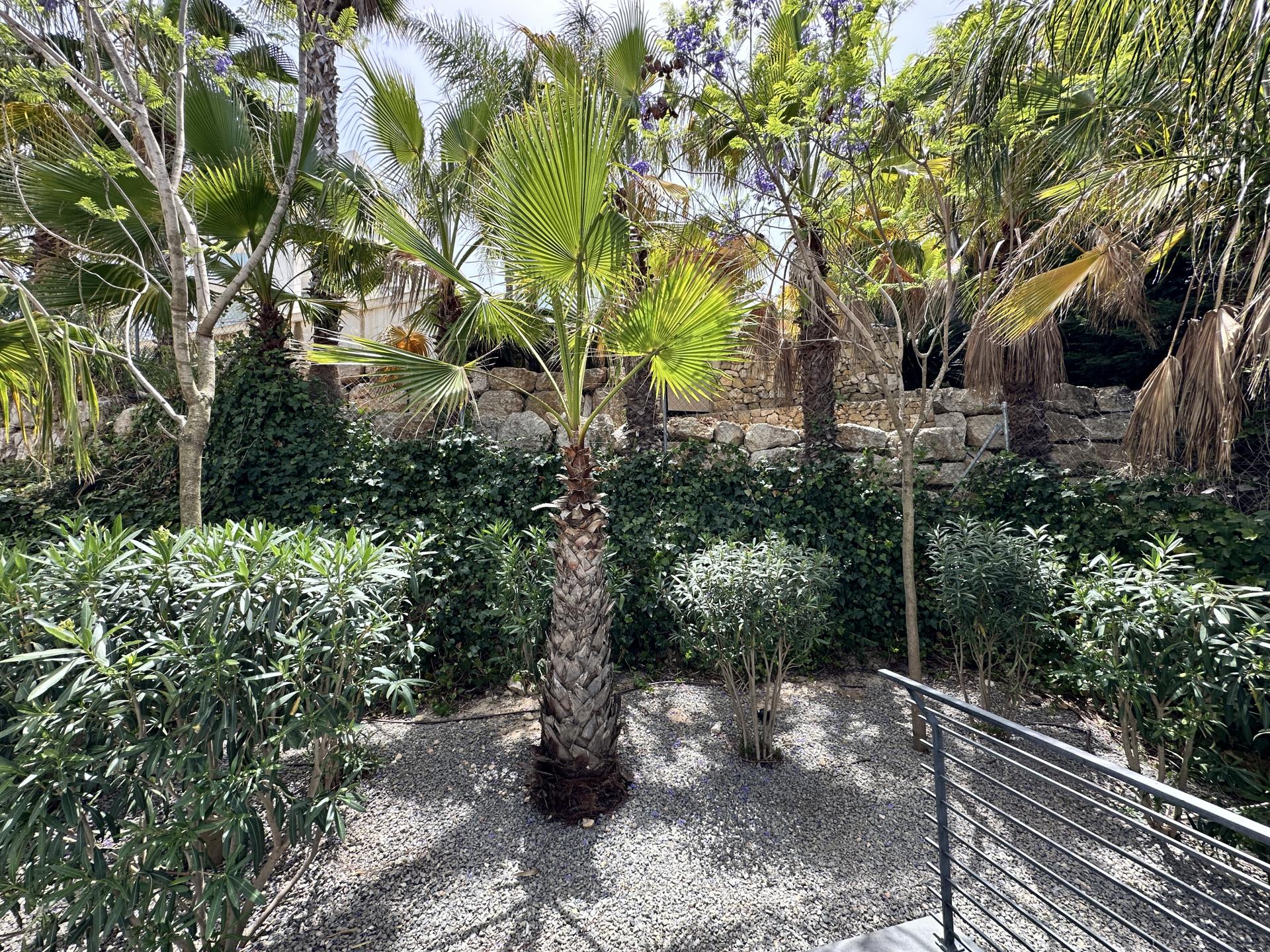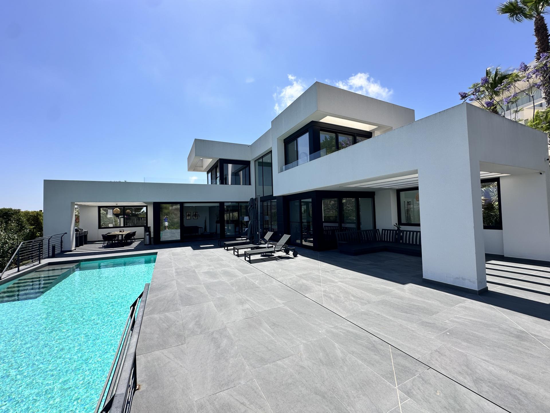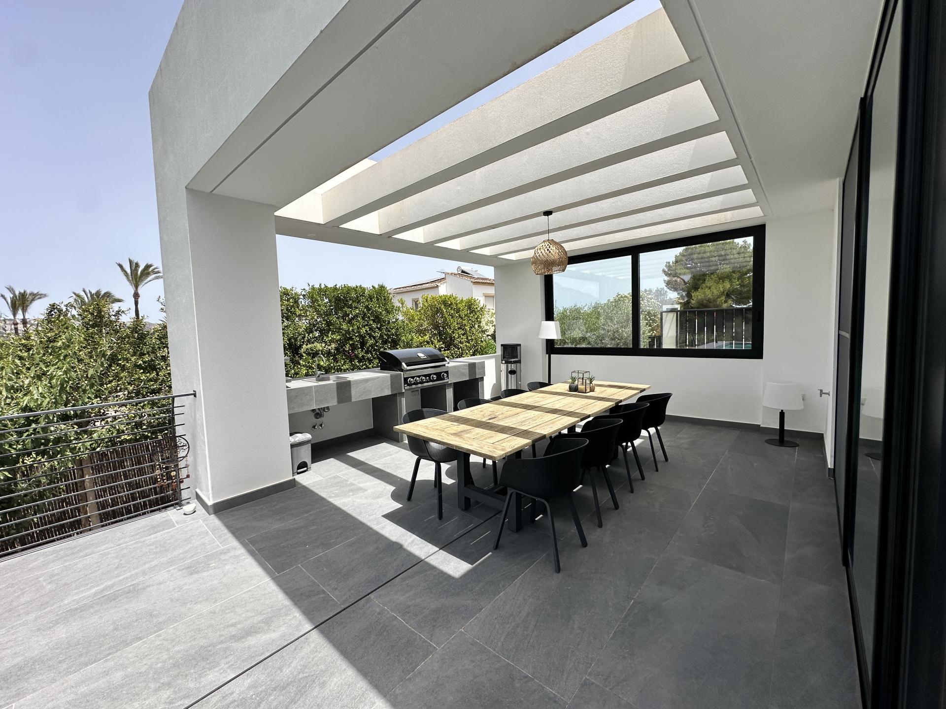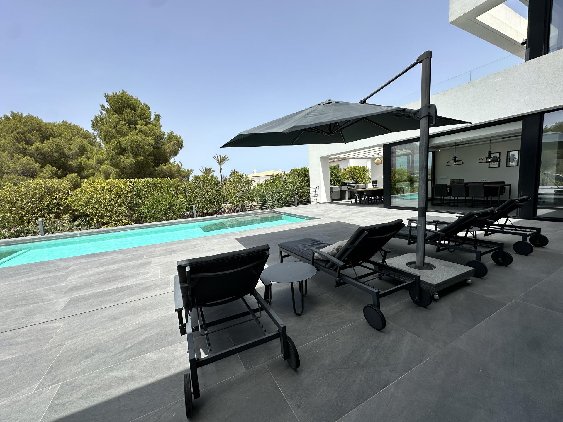 The exterior spaces complement the modern interior, featuring an infinity pool, ample open terracing, and two pergola areas, including the summer kitchen with a BBQ and a chillout lounge, perfect for entertaining. The low-maintenance landscaped Mediterranean garden includes an olive tree, palm trees, various shrubs, and a terrace patio area for relaxation.