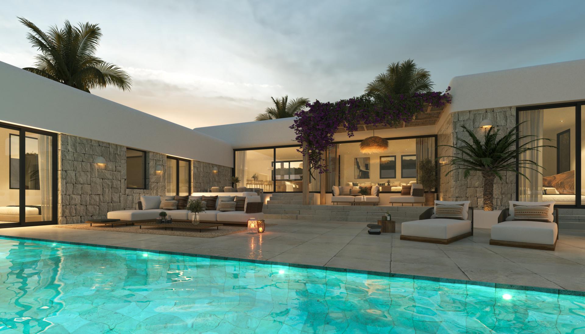 PROPERTY AT A GLANCE This stunning villa, under construction, is a beautiful blend of Mediterranean and Ibizan architectural styles, designed as a single-story, south-facing home. Just a 10-minute drive from the main beach area of Javea, this villa is perfectly situated in a fashionable beach resort with the trendy, upmarket Arenal Beach and promenade. Arenal Beach is a stunning sandy bay, adorned with palm trees and play areas for children, and lined with a variety of restaurants offering local, international, and fine dining options, as well as bars, discotheques, and boutiques. Javea Golf Course is also conveniently close by.