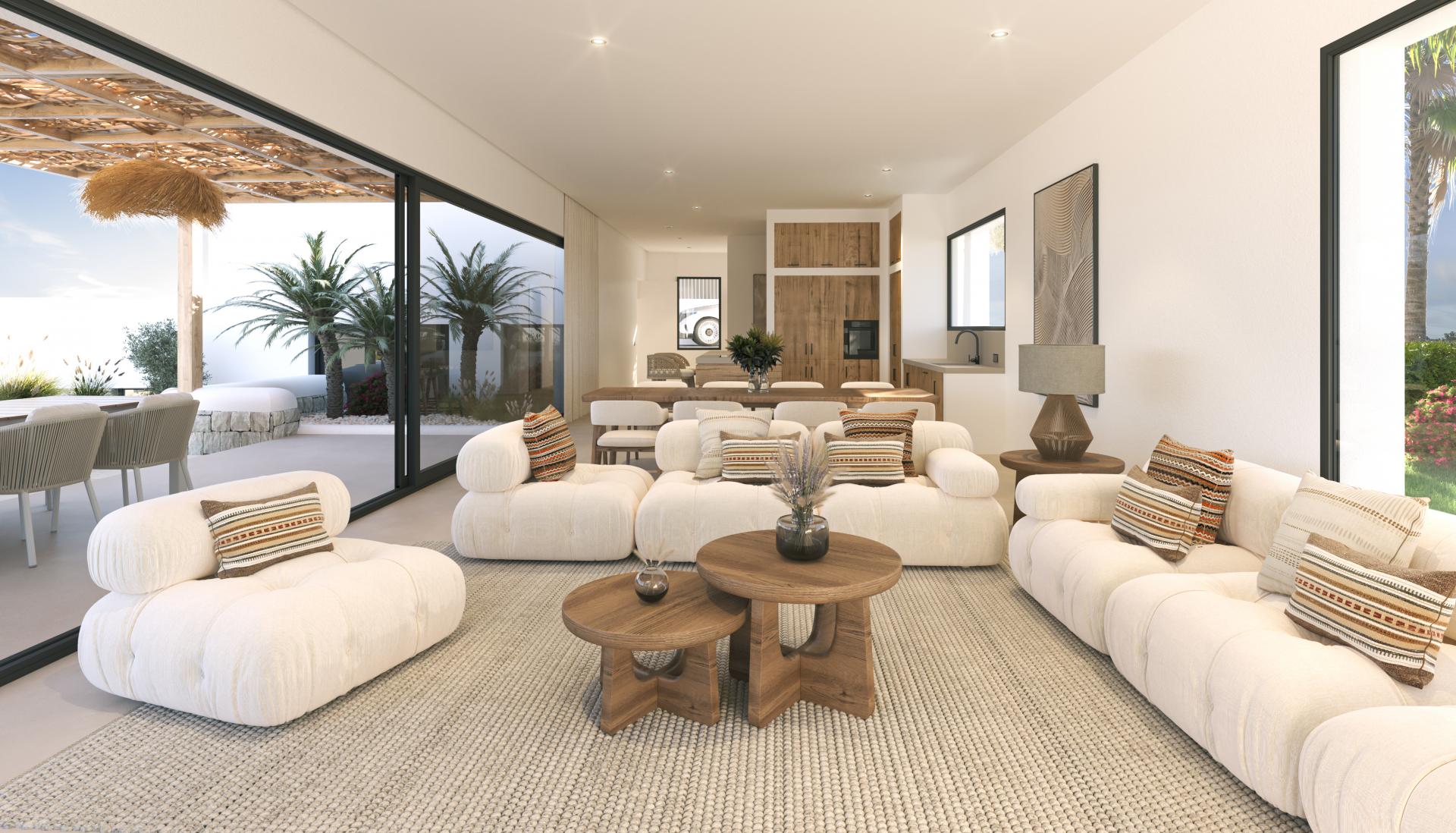The open-concept living area includes a spacious lounge with a formal dining area and an Ibizan style kitchen, featuring a counter island with a hob for food preparation, plus bar stool seating for more casual dining or breakfast. Ideal for families or entertaining, the kitchen layout allows the chef of the house to engage with guests while cooking. Large glass expanses open to the outdoor area, creating a seamless indoor-outdoor living experience.