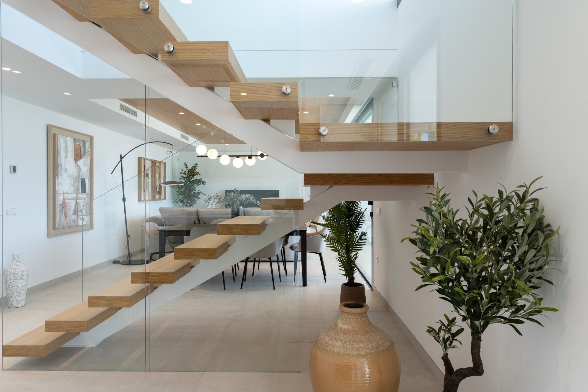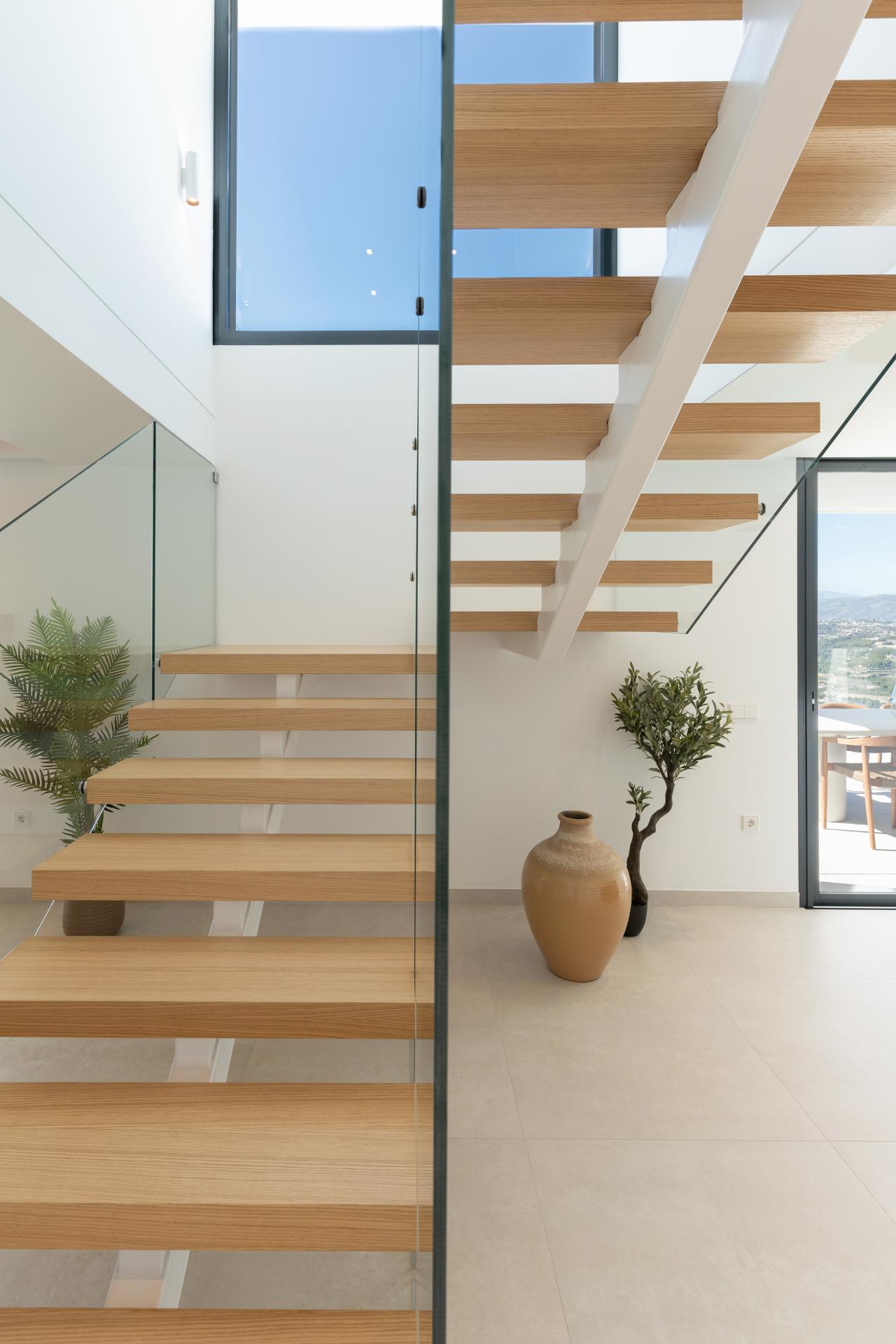 PROPERTY DETAILS Sea Views and Sophisticated Design This newly built, key-ready villa perfectly embodies the Mediterranean lifestyle with its open, airy design and seamless indoor-outdoor flow. The villa spans several floors, showcasing a masterful use of space, light, and premium materials. Upon entering the home via the upper floor, you're greeted by a welcoming hall featuring a stunning floating staircase and a double-height ceiling that emphasises the villa’s modern architectural flair. This entrance hall acts as a central axis, splitting the villa into two wings while offering a glimpse of the luxurious spaces that await.