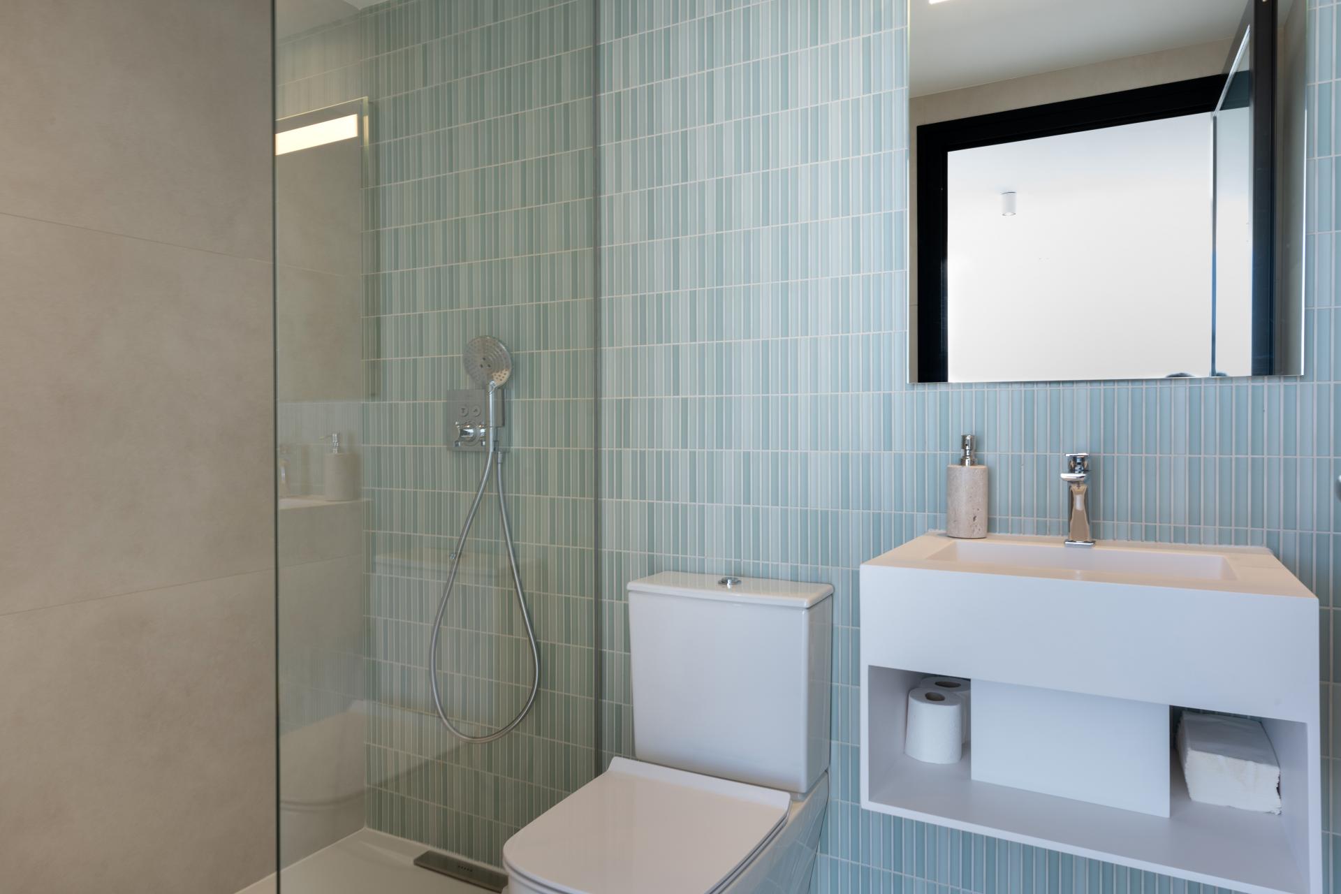 Upper Floor: Bedrooms and Privacy Retreats The upper floor houses all three bedrooms, designed with comfort and privacy in mind. In one wing, you’ll find the expansive master suite, a bright, serene retreat featuring a private balcony with panoramic sea views. The master bedroom offers a spacious seating area, perfect for reading, relaxing, or sunbathing in complete privacy. The spectacular en-suite bathroom boasts elegant finishes and ample natural light. In the opposite wing, two additional bedrooms each come with their own ensuite bathrooms and share a large terrace. This shared outdoor space is ideal for sunbathing or enjoying peaceful moments with beautiful views of the surrounding landscape.