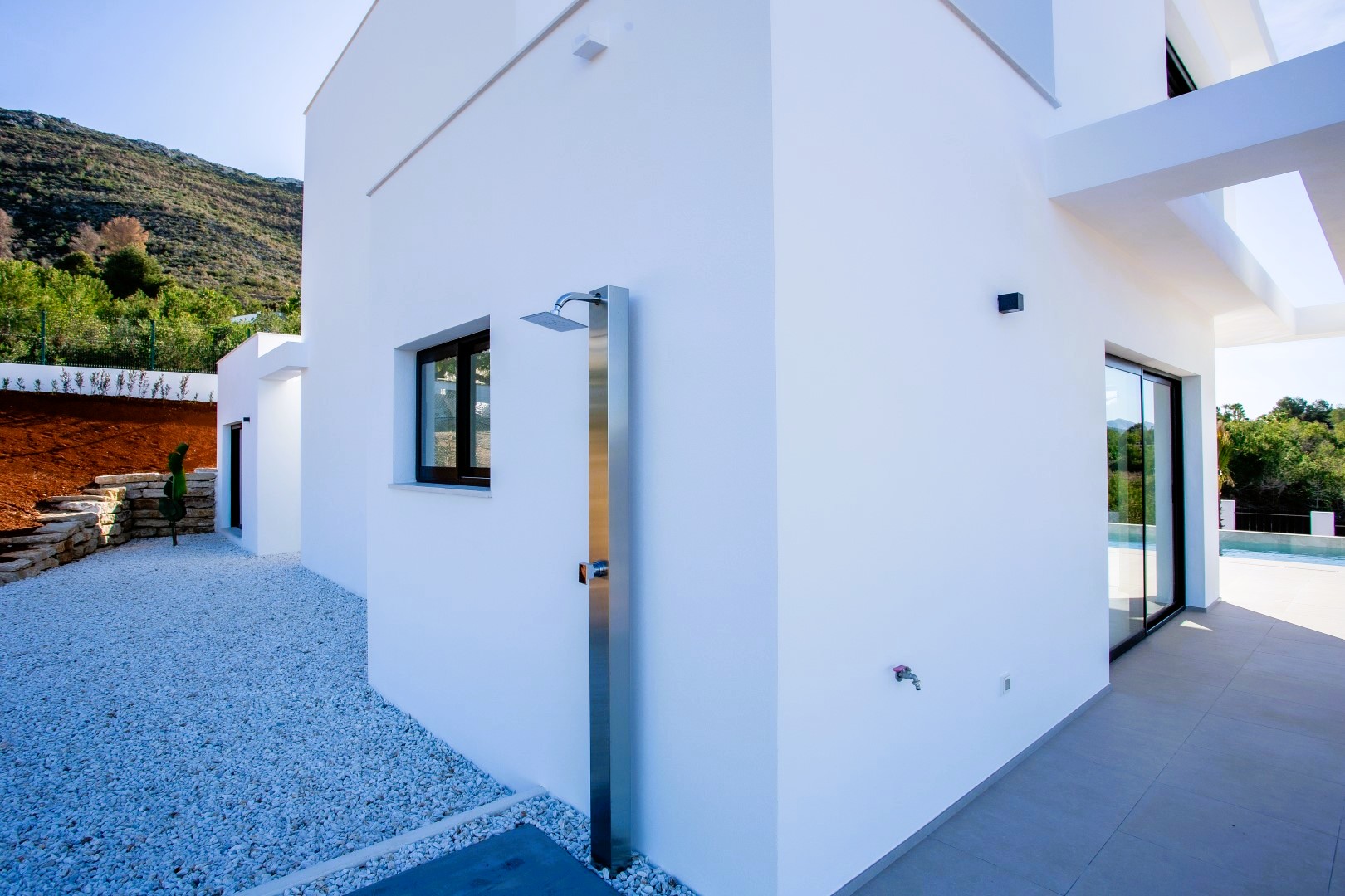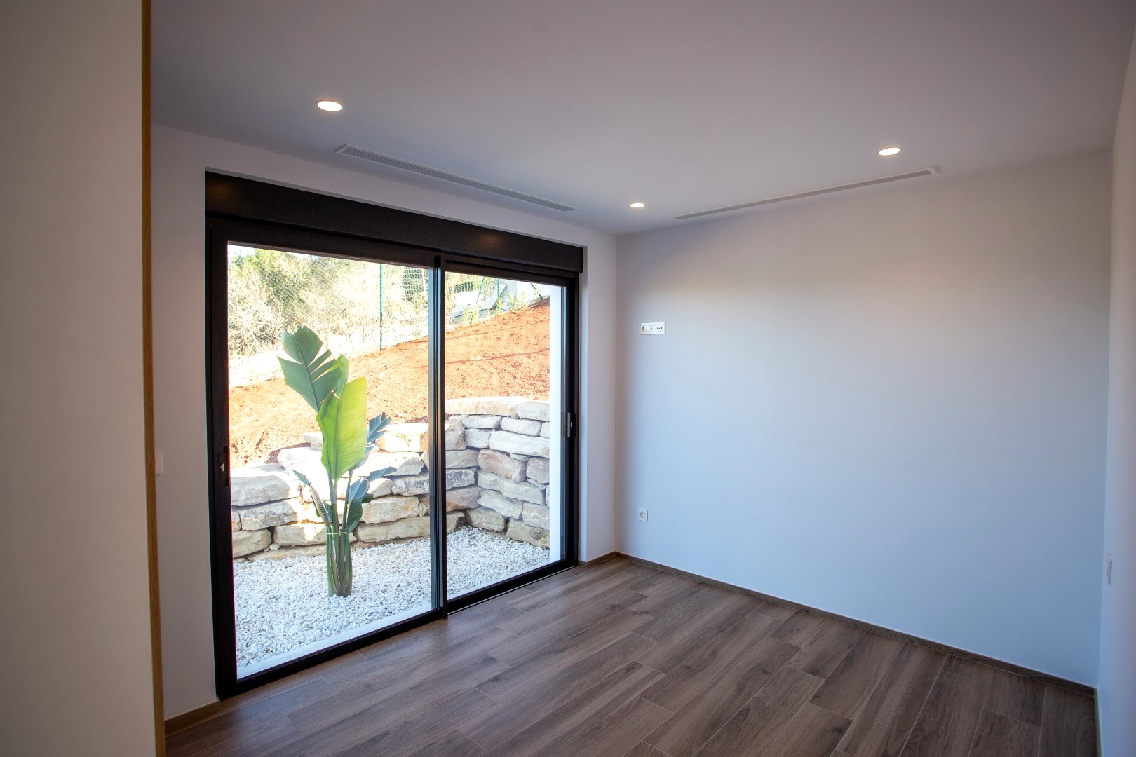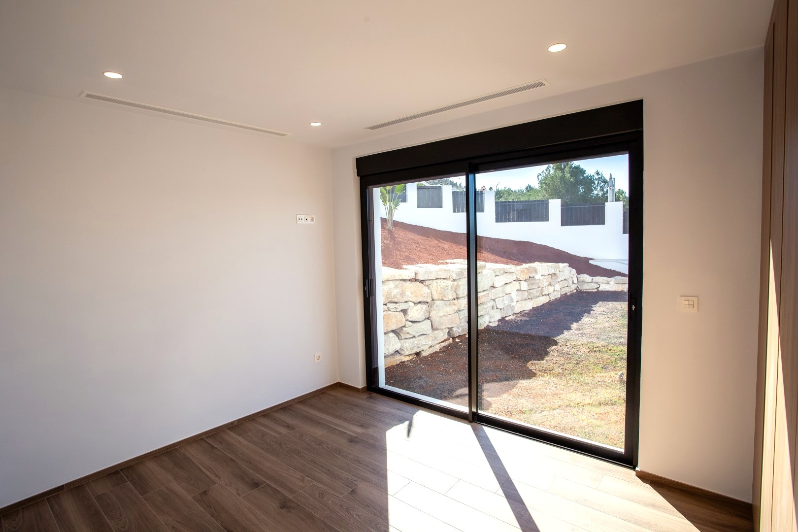 PROPERTY DETAILS The villa features three spacious bedrooms: two situated on the ground floor and a master suite on the upper level. The master suite boasts a private terrace with breath-taking views of the valley and the iconic Montgó mountain. The open-plan kitchen is fully equipped with modern appliances, including a refrigerator-freezer, oven, microwave, dishwasher, and vitro-ceramic cooktop, and it includes a pantry. The kitchen seamlessly flows into the living and dining areas, highlighted by high ceilings and expansive windows that invite abundant natural light into the space.