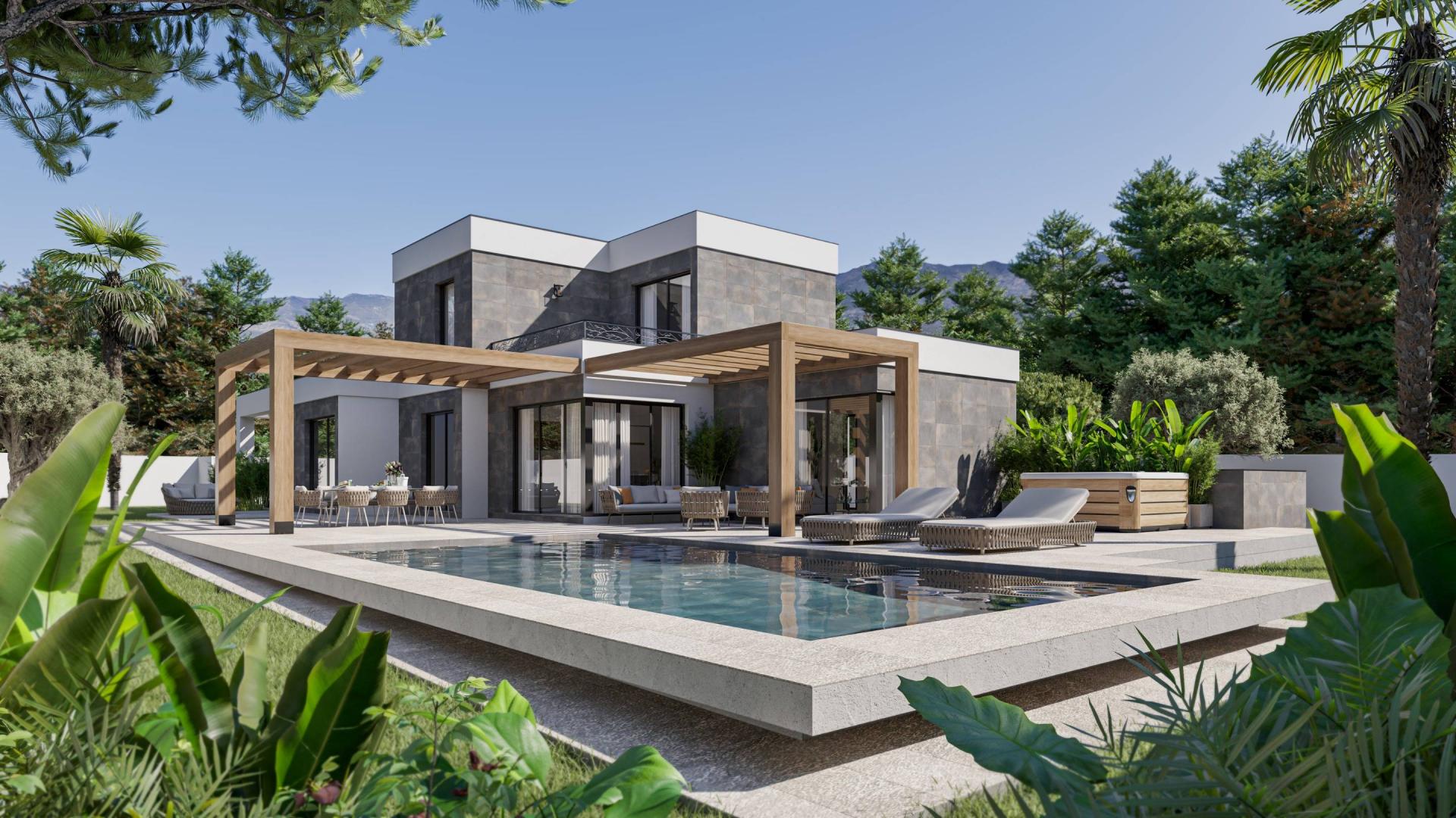 PROPERTY AT A GLANCE A rare fusion of cutting-edge architecture, sustainable technology, and Mediterranean lifestyle, this newly built A++ energy efficiency villa offers a serene sanctuary designed for the future. South-facing and bathed in natural light, the residence captures seamless indoor-outdoor living through expansive glass façades that open to landscaped gardens, a striking pool, and shaded pergolas.