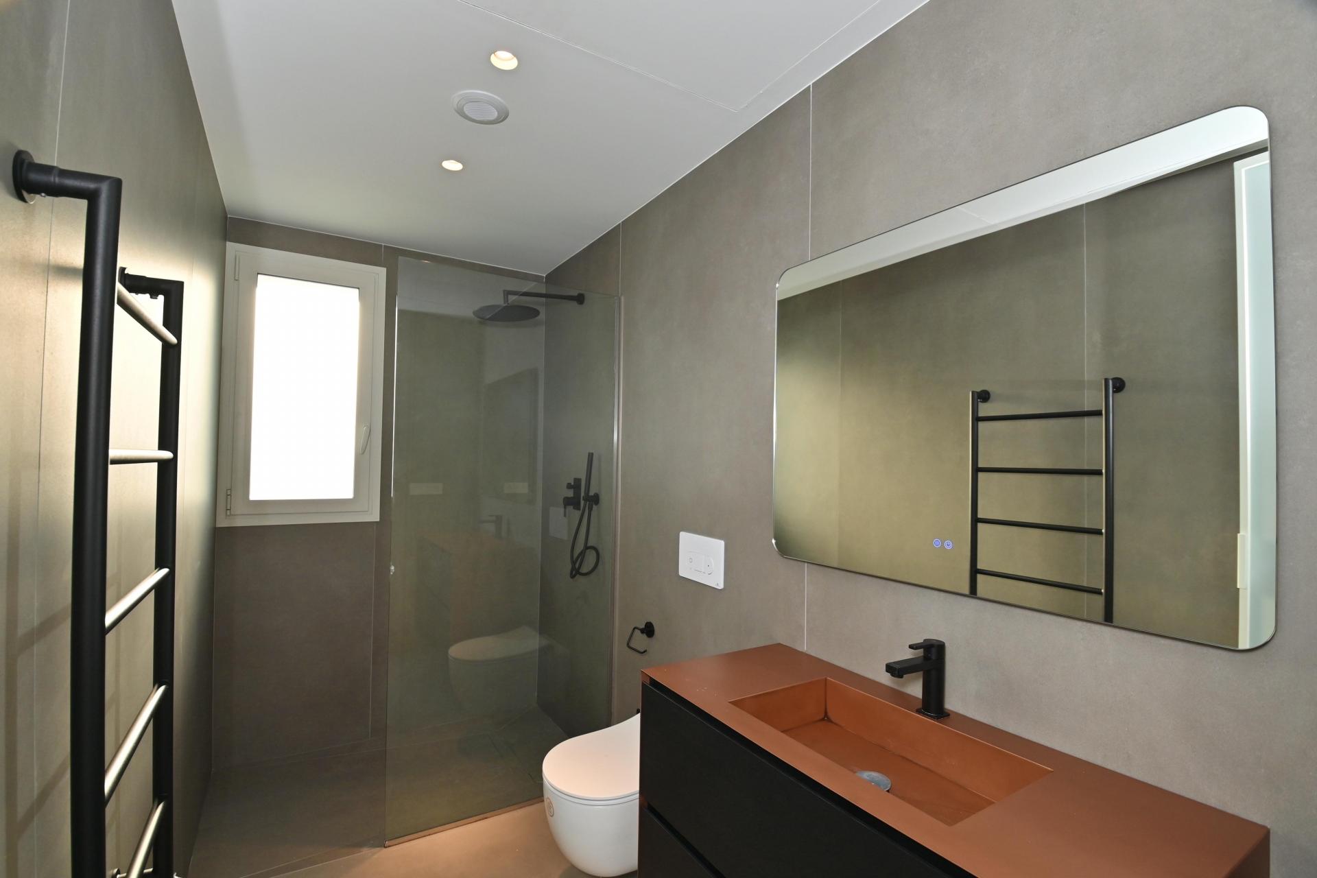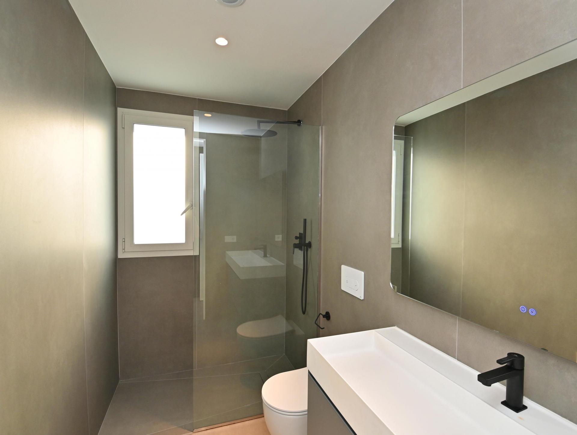 Luxury Bedrooms with Panoramic Views The upper level is dedicated to relaxation, offering two beautifully appointed ensuite bedrooms with private access to the upper terrace. The master suite is a true sanctuary, featuring dual-aspect glass expanses. The ensuite bathrooms are modern with walk-in showers, and stylish vanity units with natural wood accents. From this level, an external staircase leads to the rooftop terrace, where vistas stretch across the coastline, capturing the beauty of Moraira and the Peñón de Ifach.