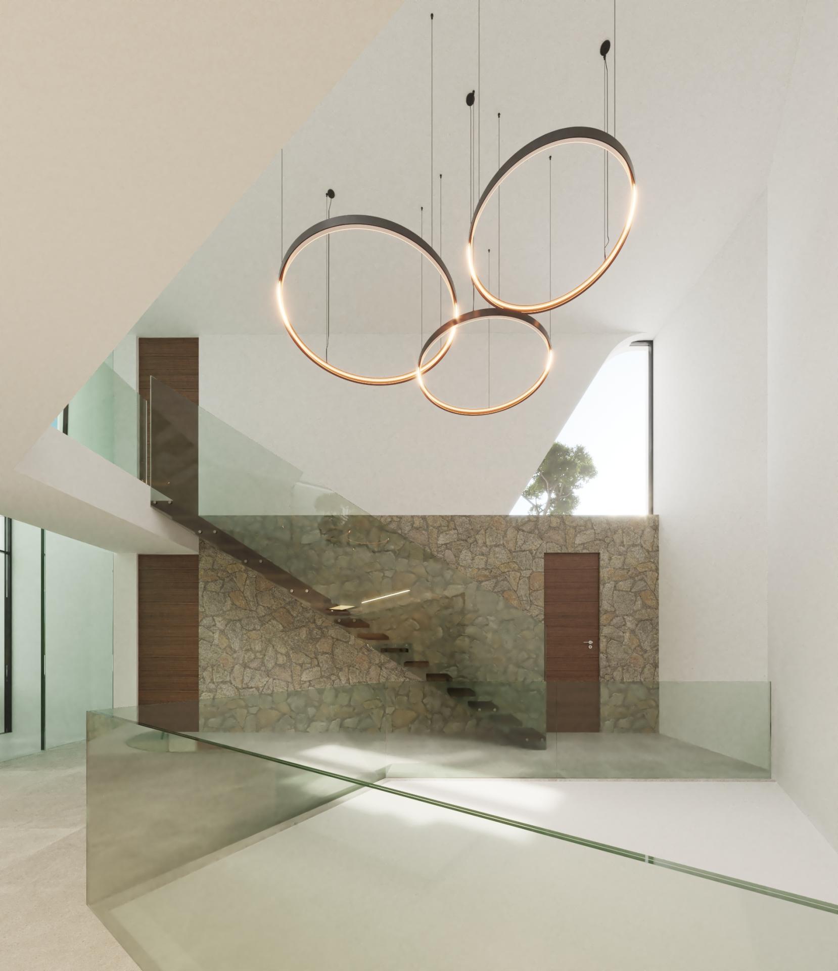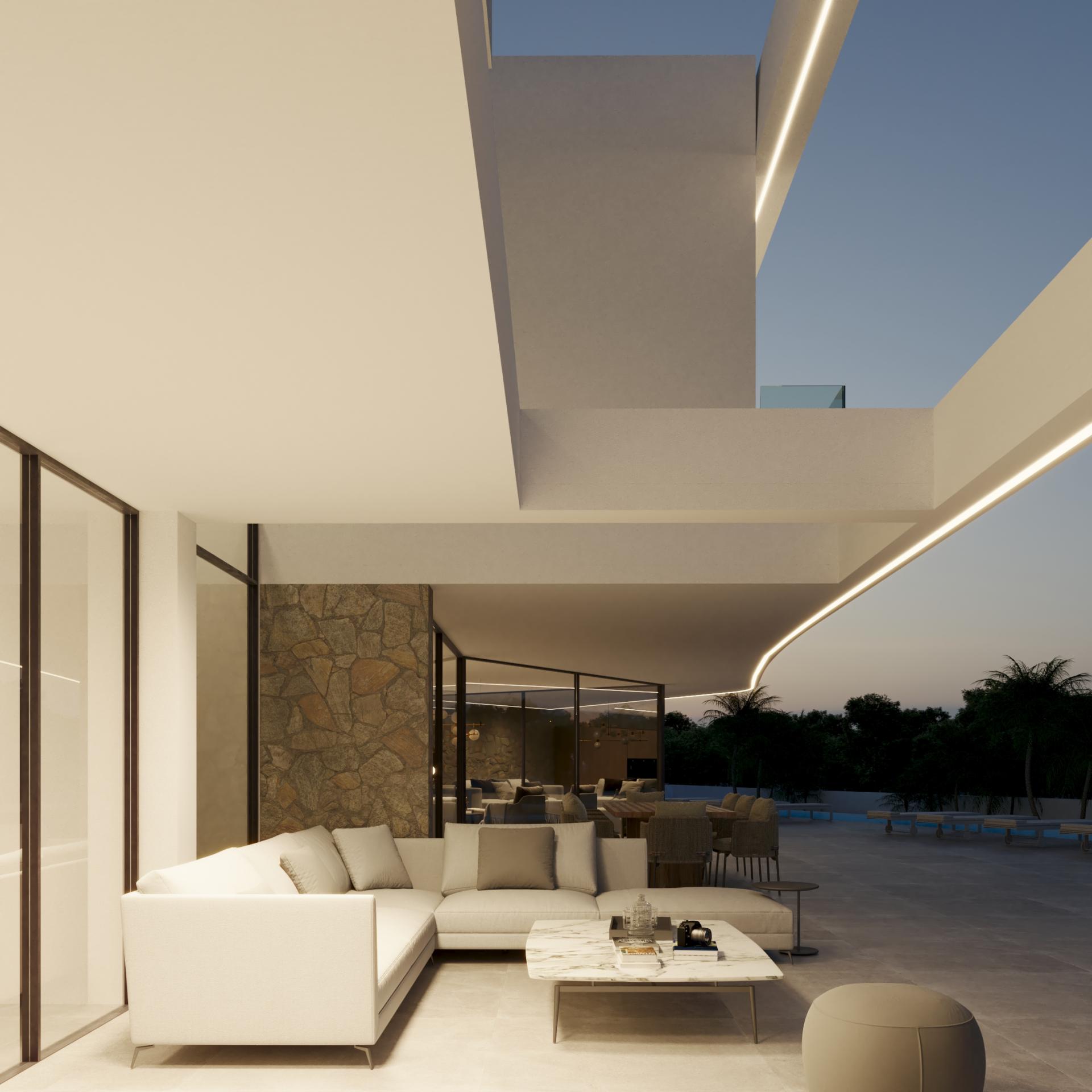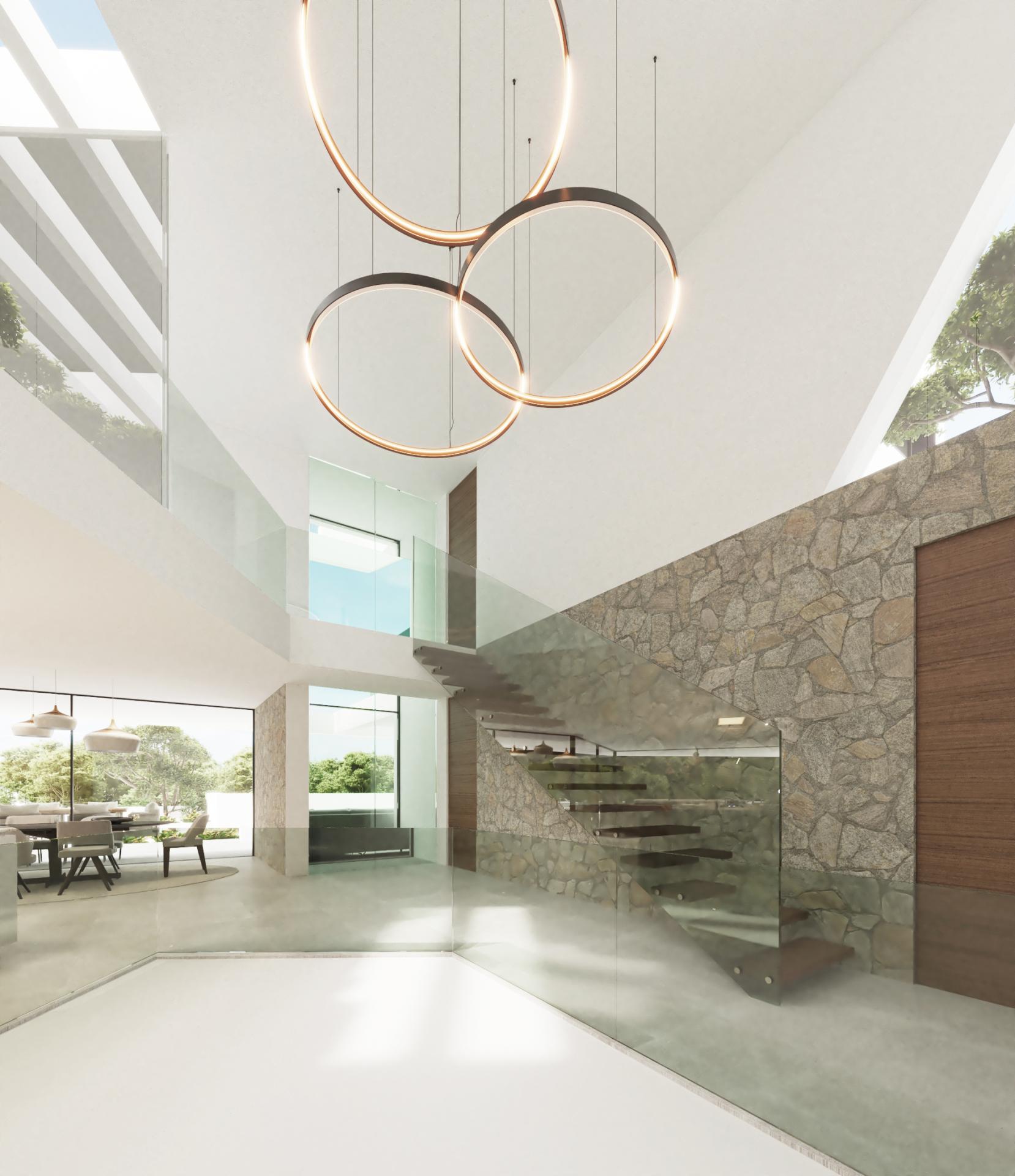 PROPERTY DETAILS Architecture & Design This villa is a striking fusion of Mediterranean warmth and cutting-edge design. Its façade, clad in premium natural stone and high-end finishes, exudes elegance while expansive windows invite natural light deep into the home. A central English patio brings serenity and connection to nature, balancing sophistication with tranquillity.