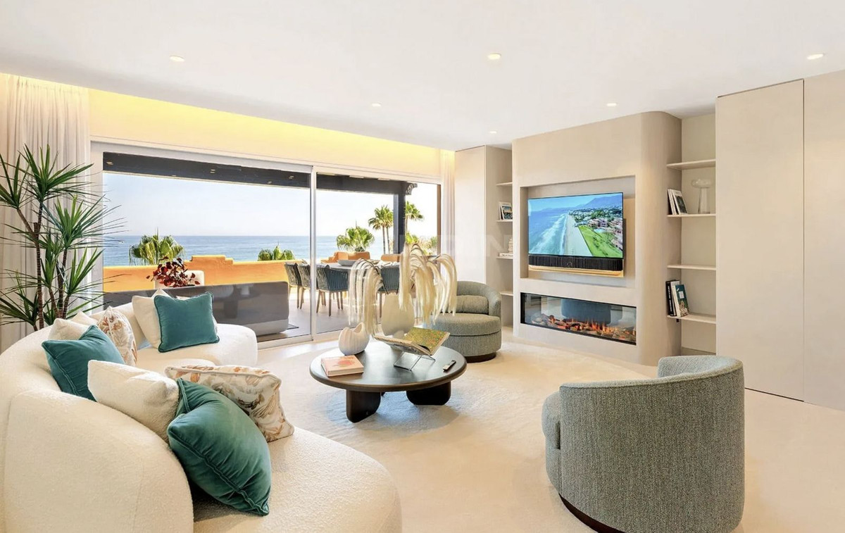 A stunning fully renovated 4-bedroom, 3-bathroom apartment offering refined coastal living in one of the most prestigious frontline beach communities on the New Golden Mile. This spacious 187m² residence features a bright open-plan layout, with a sleek designer kitchen equipped with premium German appliances, and luxurious touches including a Bang & Olufsen sound system, electric fireplace, and freestanding bathtub.