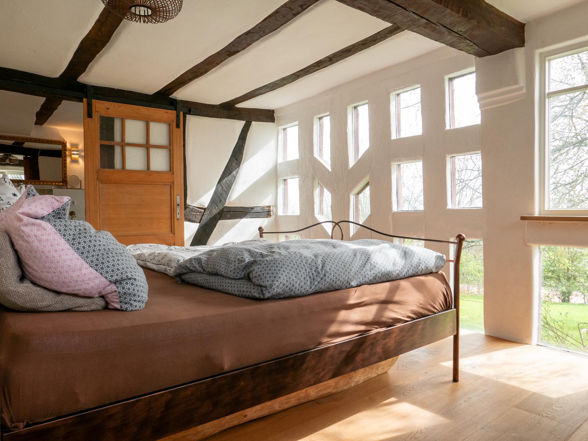 On the ground floor, you'll find the first bedroom, ideally suited as a master bedroom. This bedroom, also with exposed timber framing, oak parquet flooring, and a nostalgic barn door leading to its own bathroom, benefits from a window front integrated into the timber frame, allowing natural light to grace the room attractively.