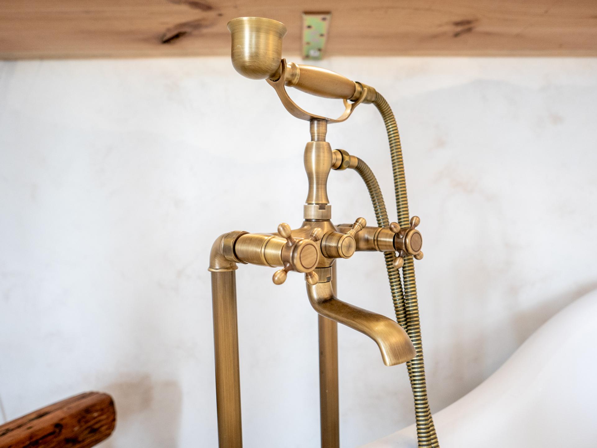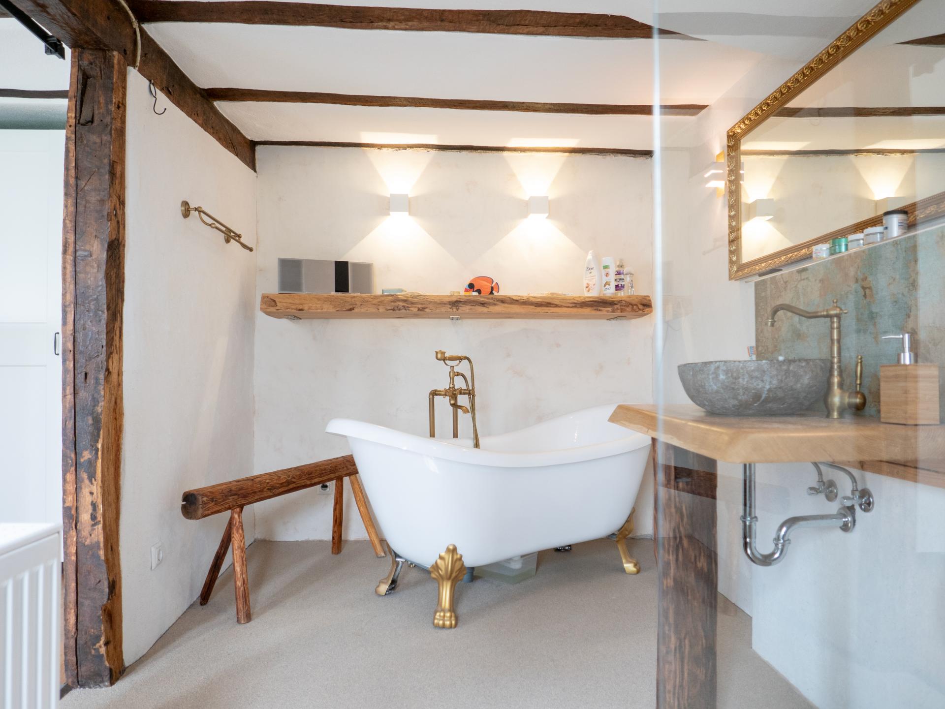 The adjacent daylight bathroom is a haven of relaxation, with a freestanding vintage bathtub and a walk-in shower, both adorned with stylish brass fixtures. The handcrafted solid wood vanity with natural stone sink and bespoke tile work adds a unique touch to the space.