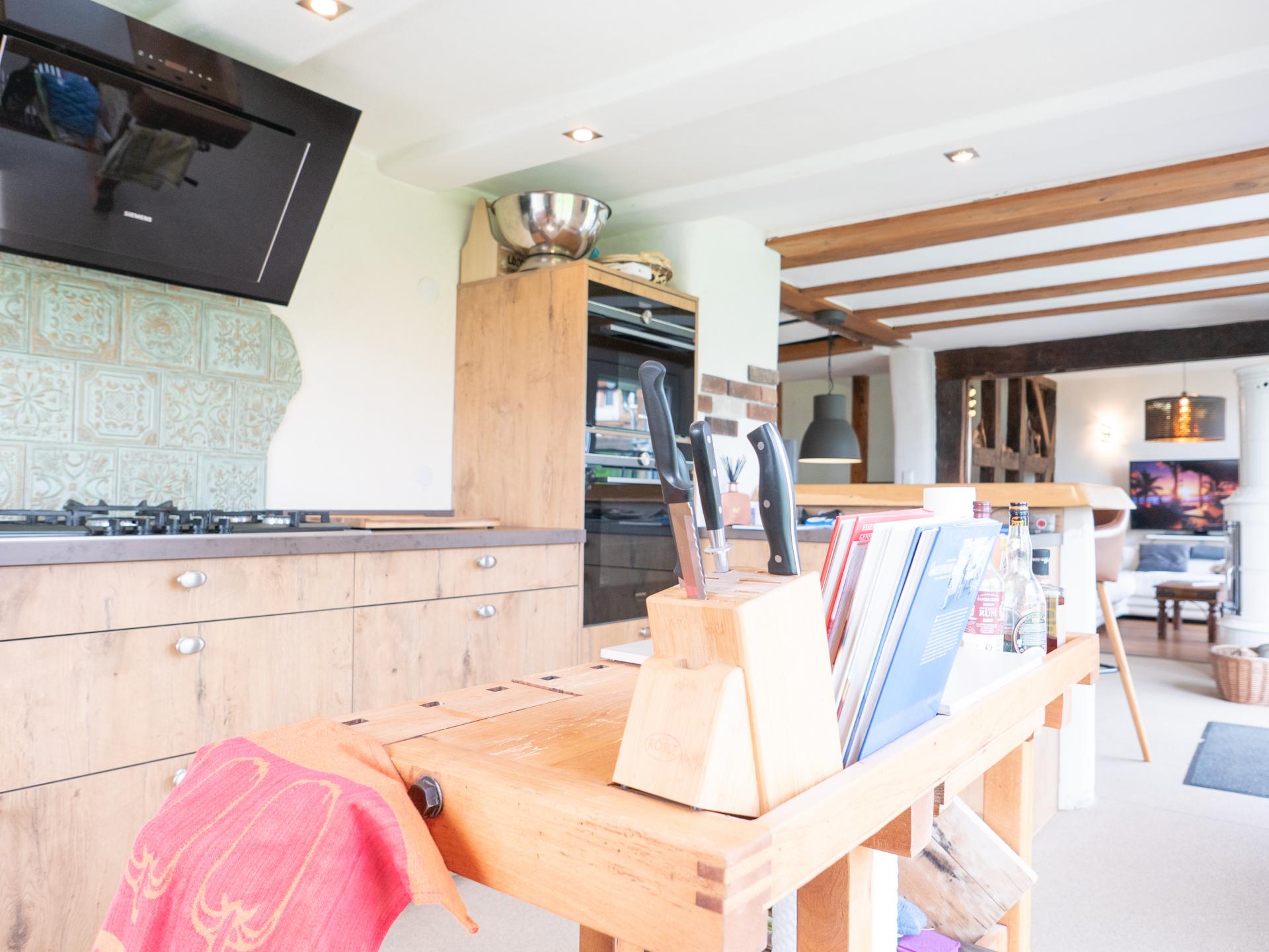 The adjoining open kitchen area is the heart of the home, equipped with a modern fitted kitchen featuring natural oak, creating a warm atmosphere. The solid wood breakfast bar invites shared coffee breaks, while the gas stove and high-quality "Siemens Studio Line" appliances perfectly support your culinary creations.