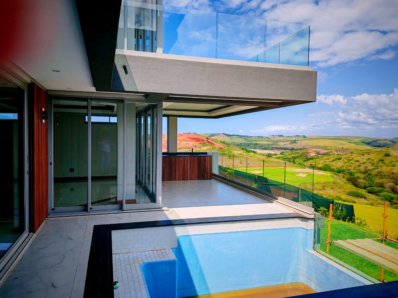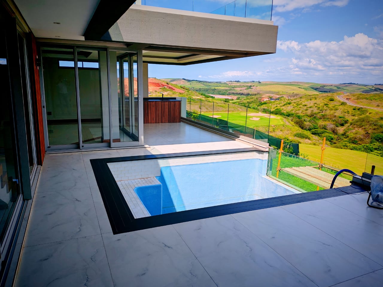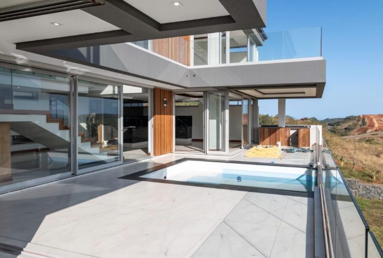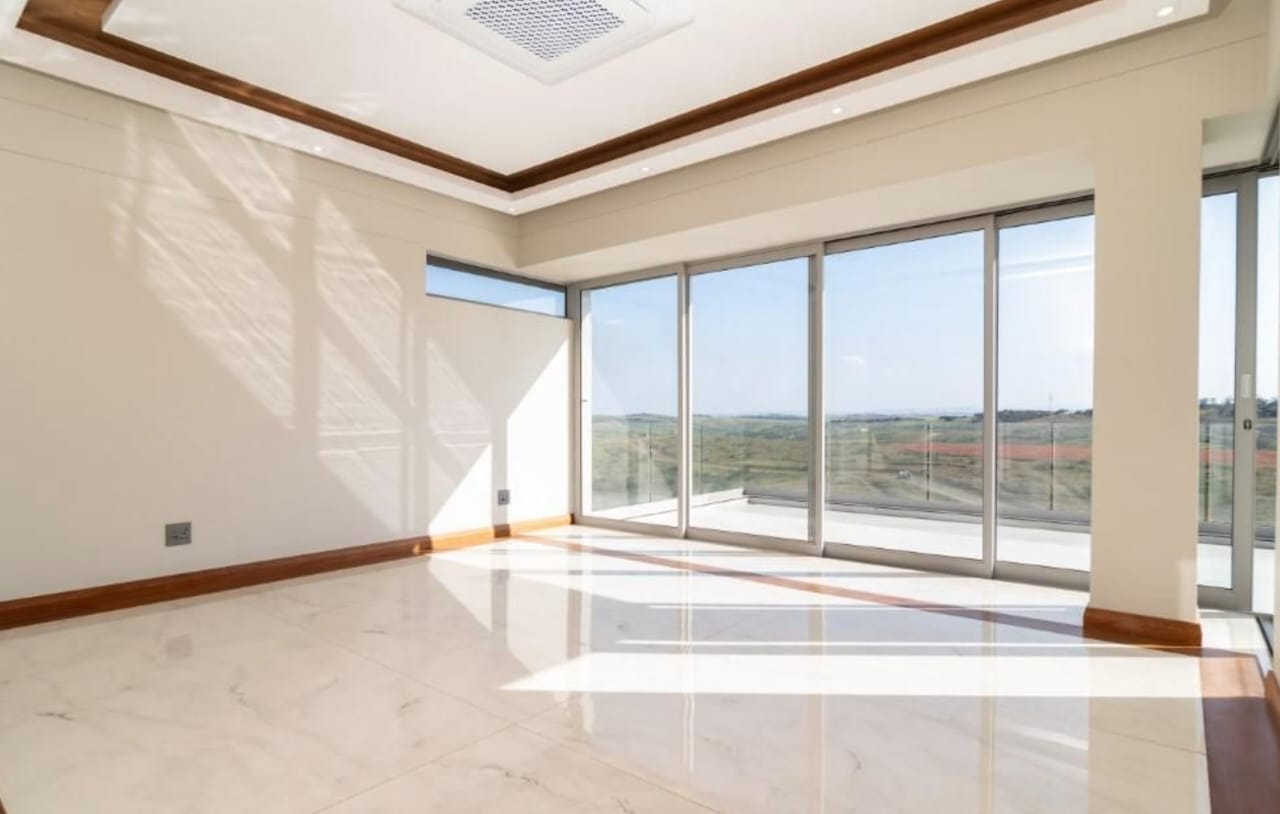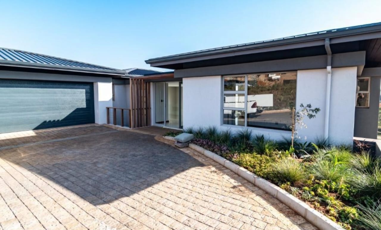 This new, modern, 4-bedroom, 4-bathroom house is an absolute delight. On entering, you are greeted by panoramic views over the Ernie Els Golf Course and greenbelt , seamlessly connecting outdoor and indoor living. The double volume design and floor to ceiling windows lead to a light and airy feel throughout.