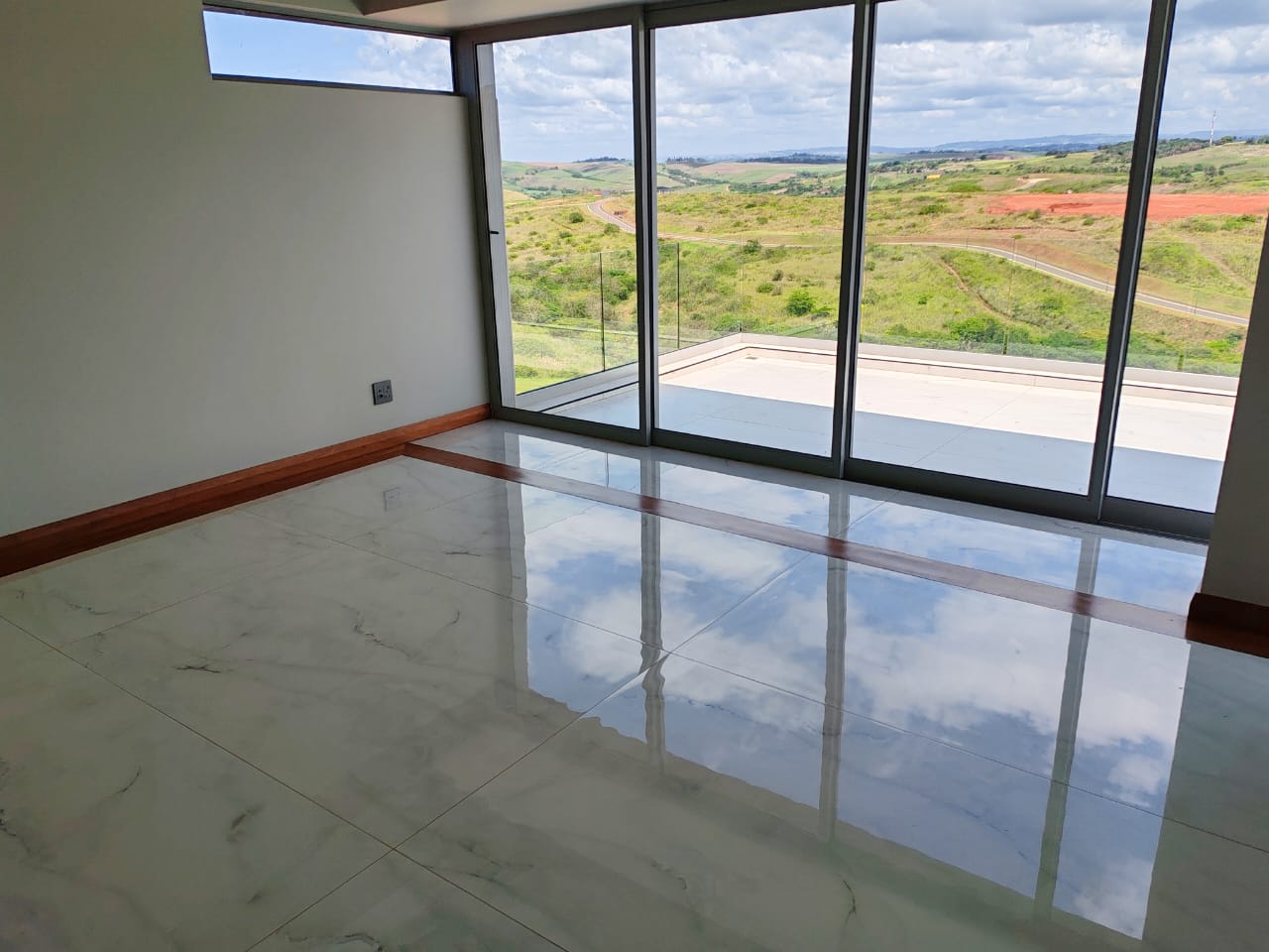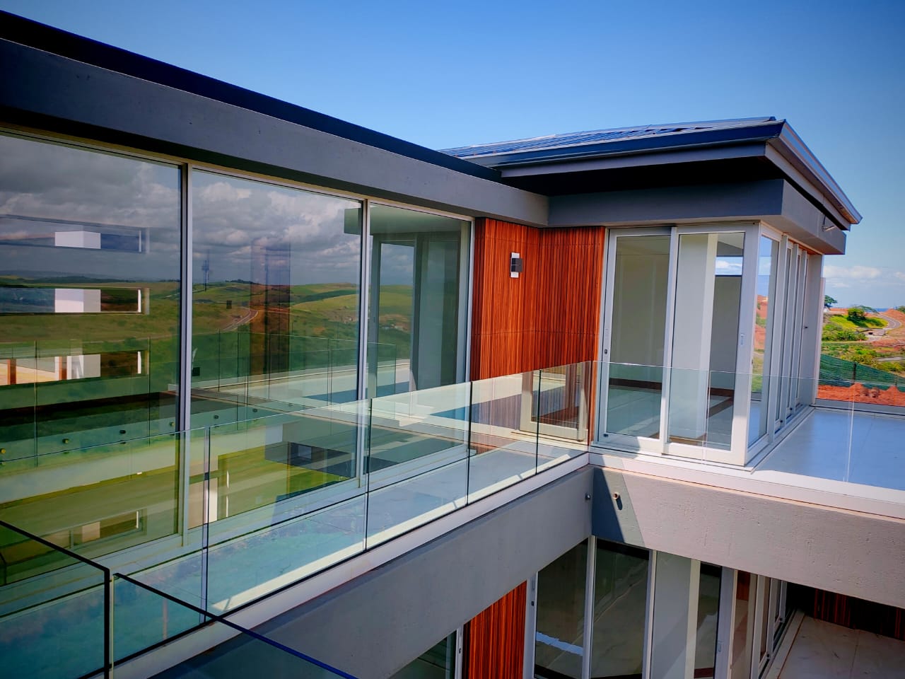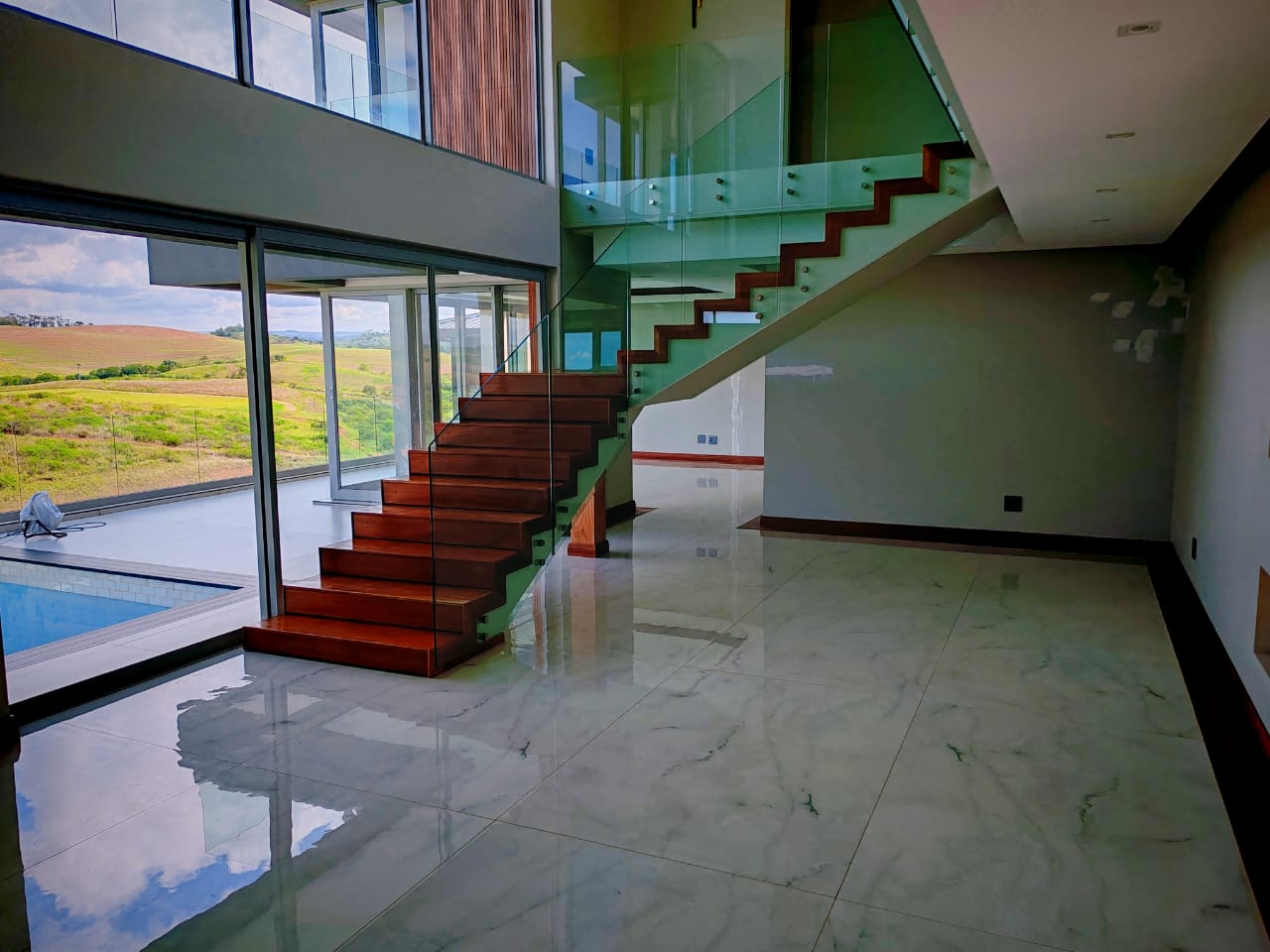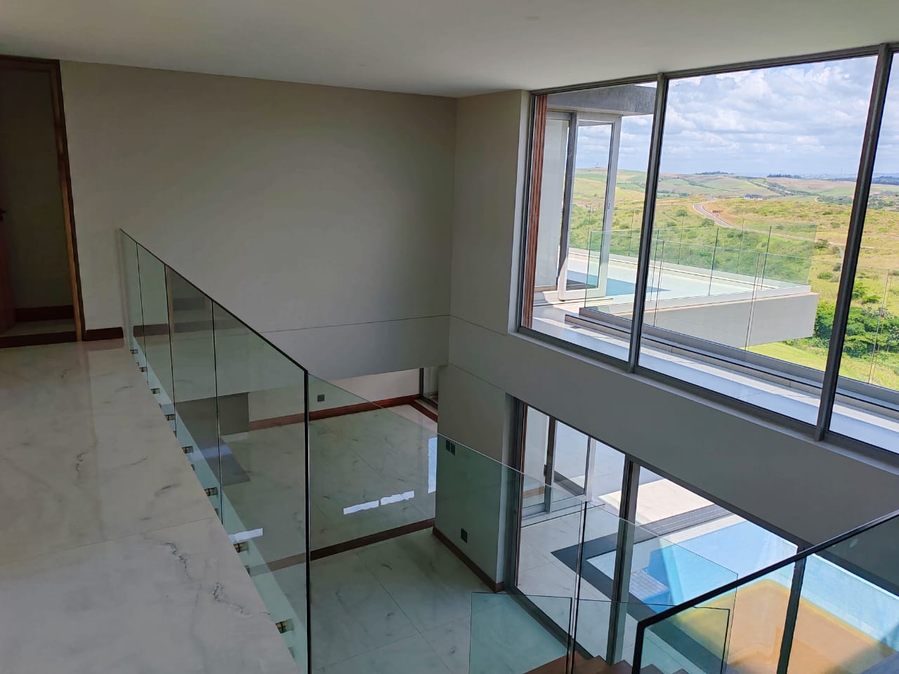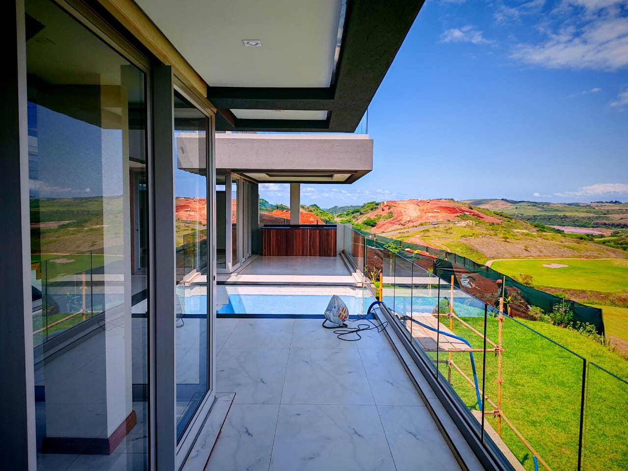 This new, modern, 4-bedroom, 4-bathroom house is an absolute delight. On entering, you are greeted by panoramic views over the Ernie Els Golf Course and greenbelt , seamlessly connecting outdoor and indoor living. The double volume design and floor to ceiling windows lead to a light and airy feel throughout.