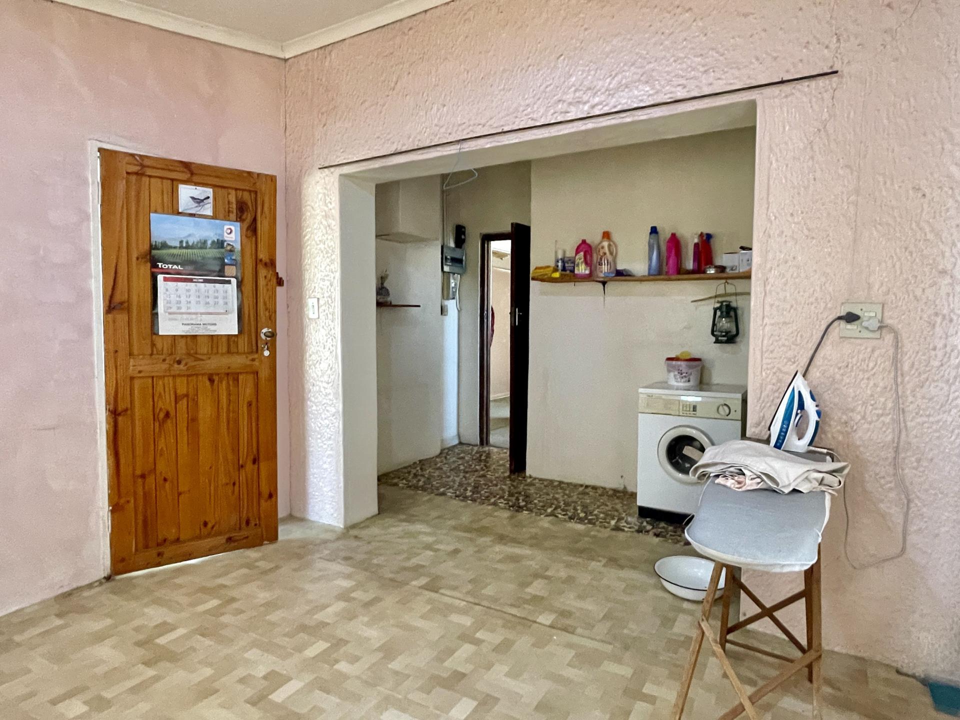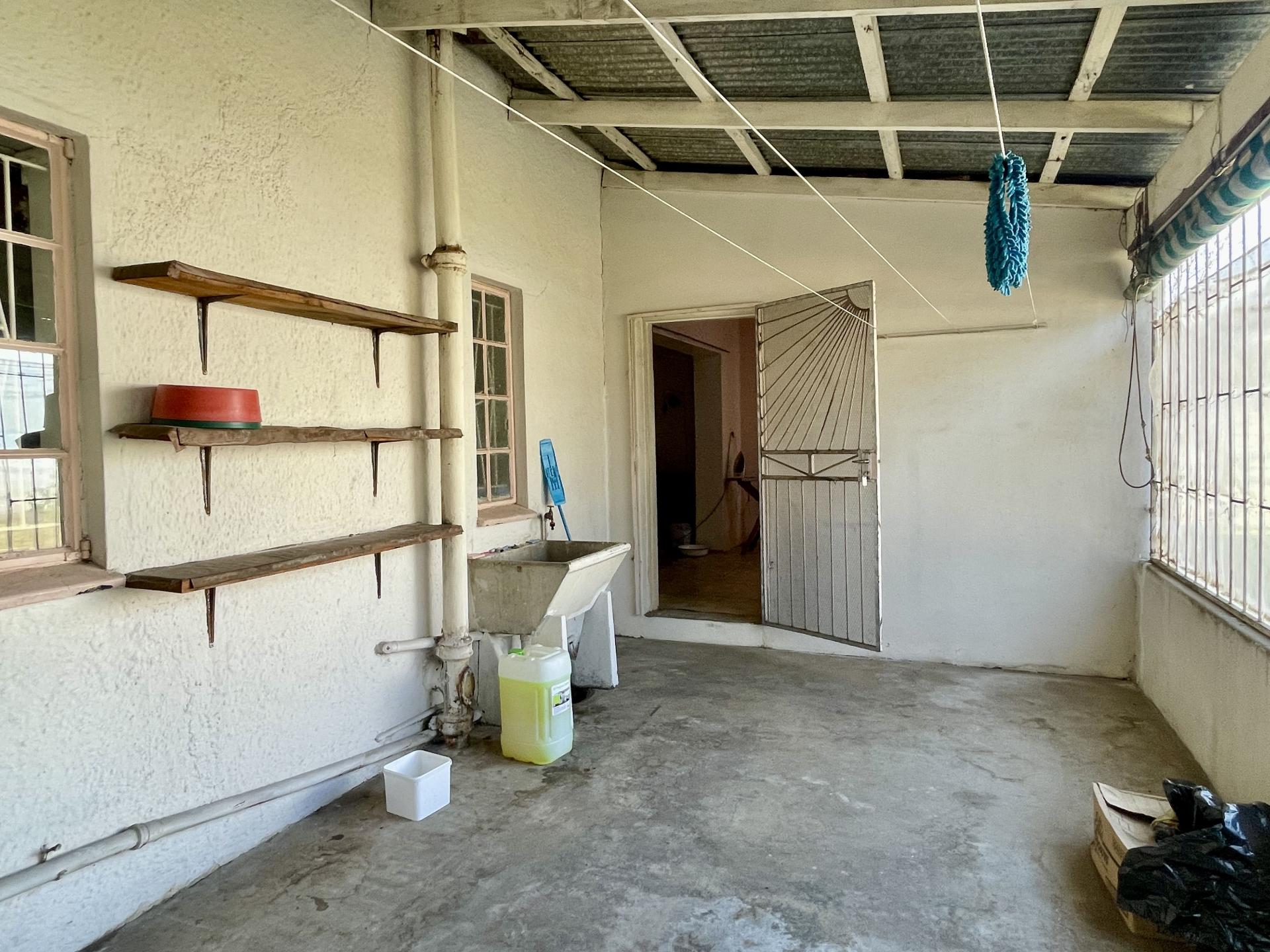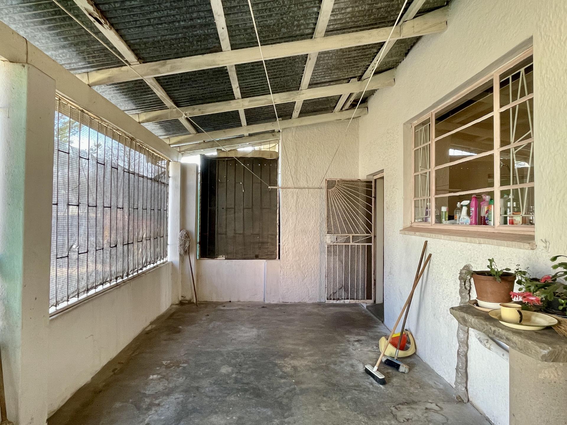 The property features an enclosed stoep with access to the laundry room, the kitchen, and another storeroom leading to the garden. The garden is extensive covering a total of 1735 square metres. Irrigation can be done from two water storage tanks fed by the gutters. The large yard provides ample parking space alongside two single garages, ensuring convenience and safety for residents and guests alike.