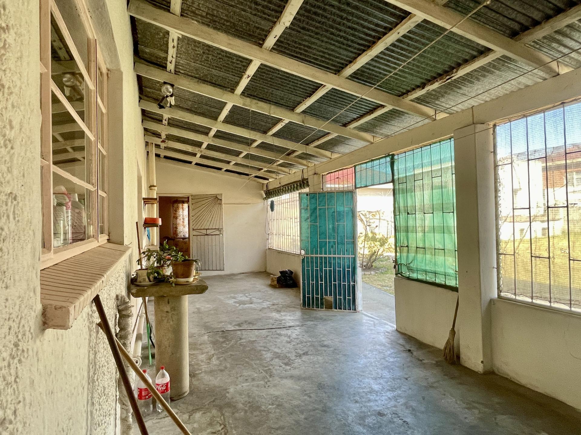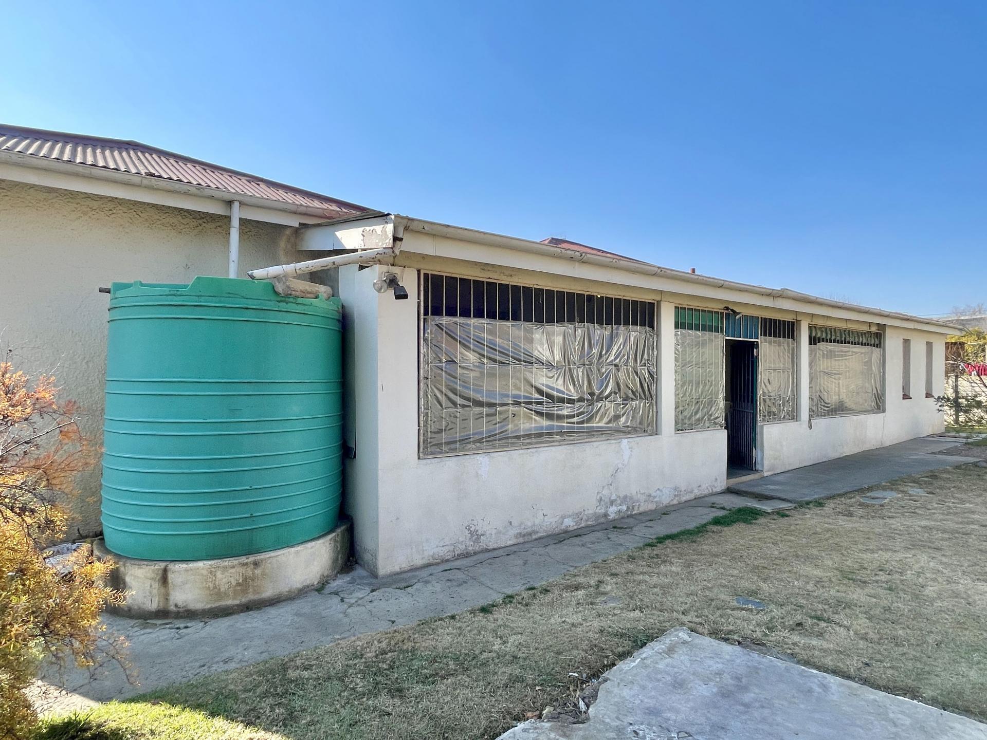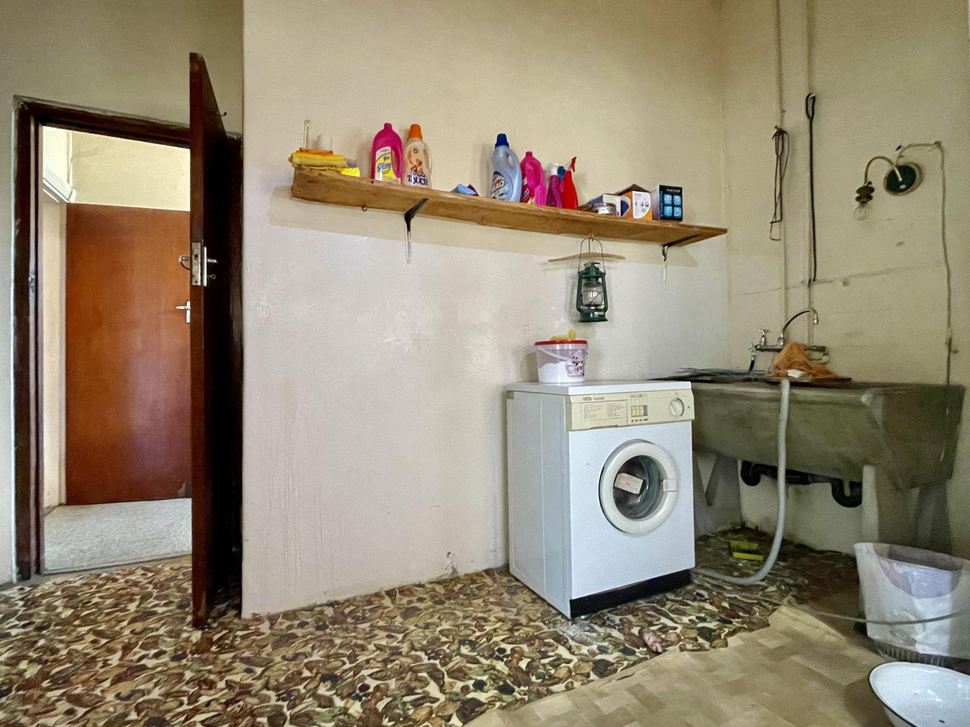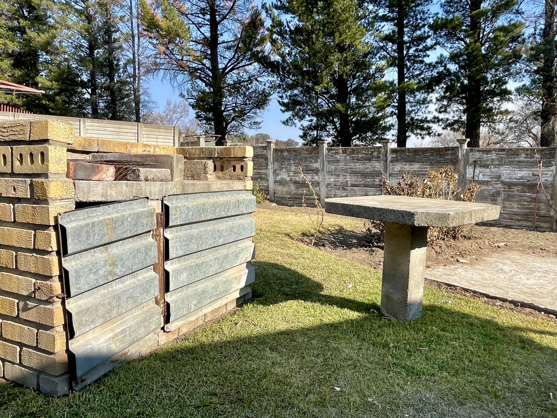 The property features an enclosed stoep with access to the laundry room, the kitchen, and another storeroom leading to the garden. The garden is extensive covering a total of 1735 square metres. Irrigation can be done from two water storage tanks fed by the gutters. The large yard provides ample parking space alongside two single garages, ensuring convenience and safety for residents and guests alike.