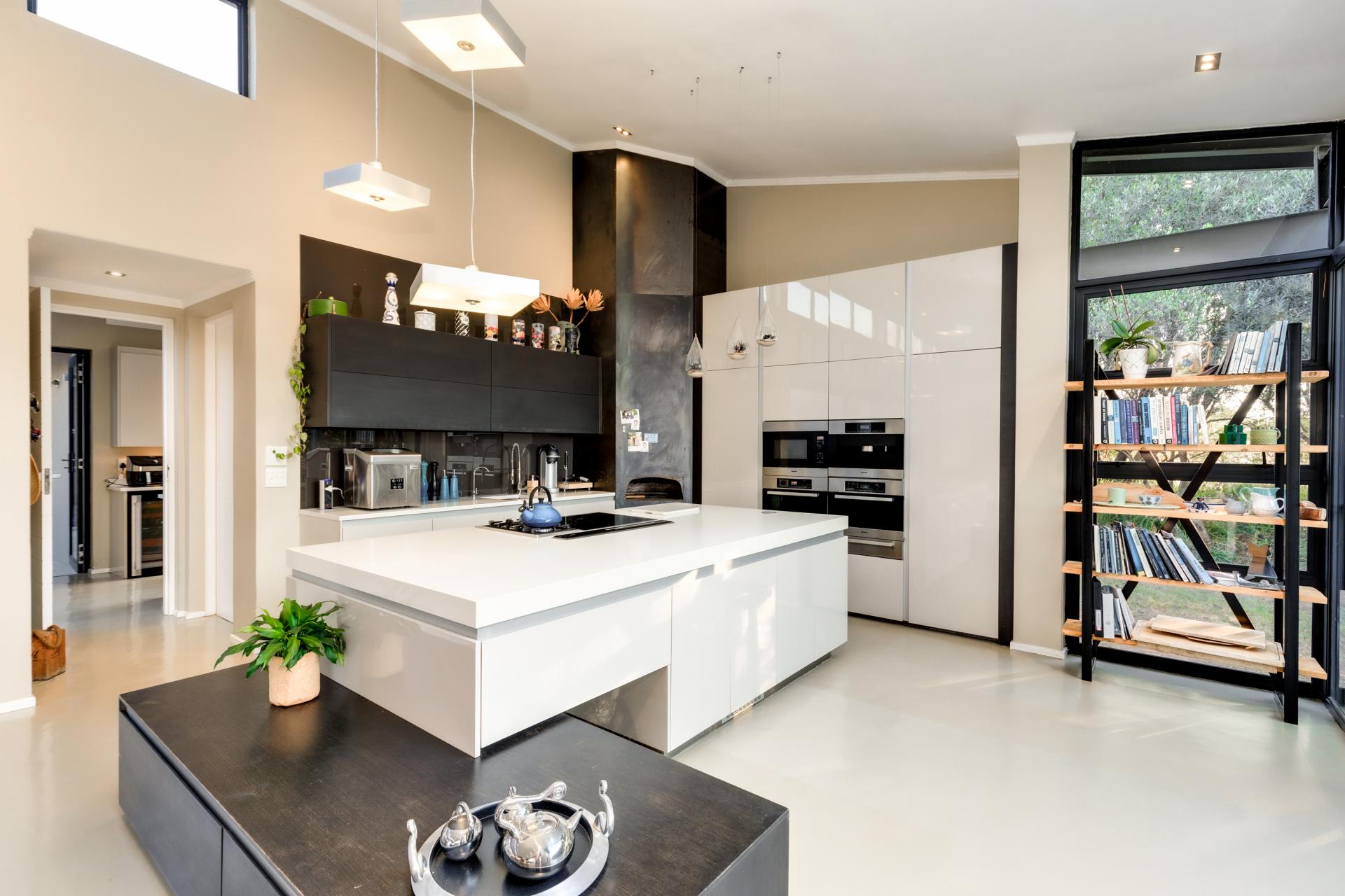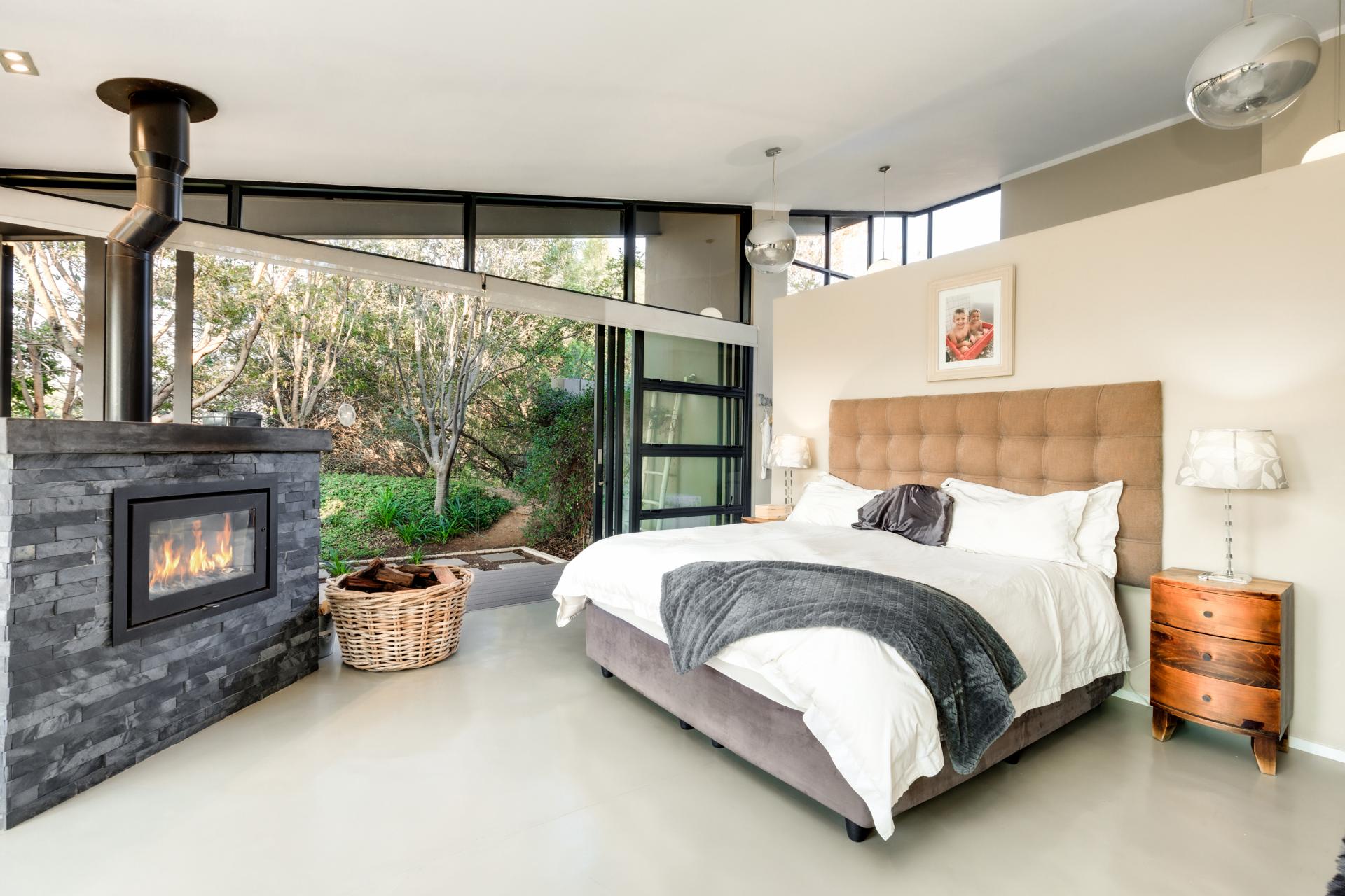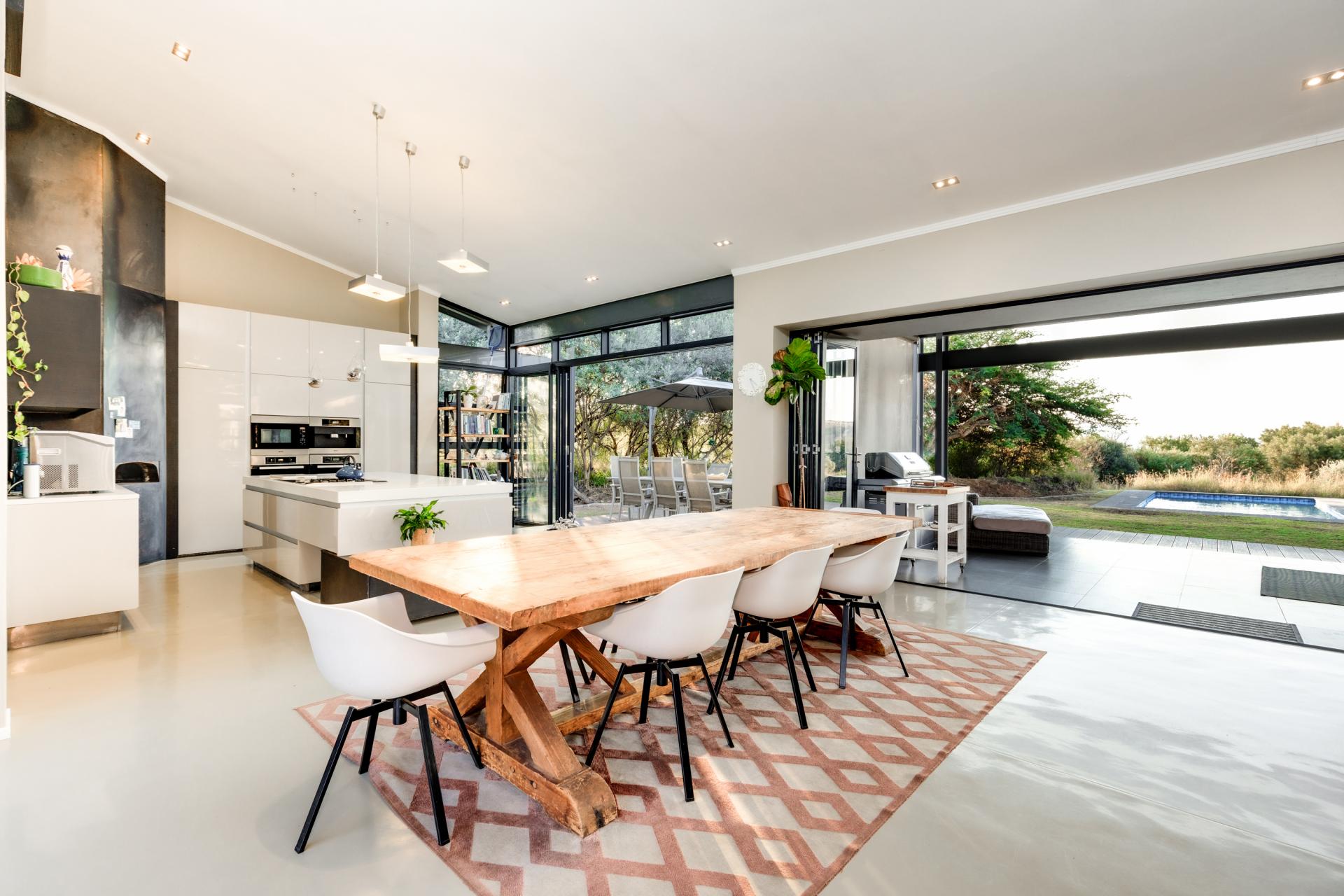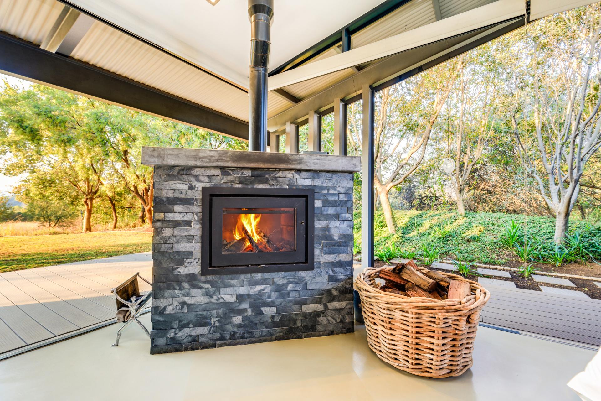 Set on one of the top 10 largest stands in Monaghan Farm, the 4-bedroom, 3-bathroom residence was designed for off-grid resilience and effortless indoor-outdoor flow. At the heart of the home is a bespoke Blu-Line kitchen, fully equipped with built-in Miele appliances, an integrated fridge/freezer, gas pizza oven, and both gas and induction hobs — for cooking during loadshedding. The living space is warmed by a massive Morso wood-burning fireplace (plus one in the master suite too), and the house is wired throughout for Wi-Fi, fibre, and sound. The home includes a large study/play area leading onto a central courtyard, a private staff suite with its own kitchenette and bathroom, and offers ample space for extended additions such as a studio, garage, or flatlet.