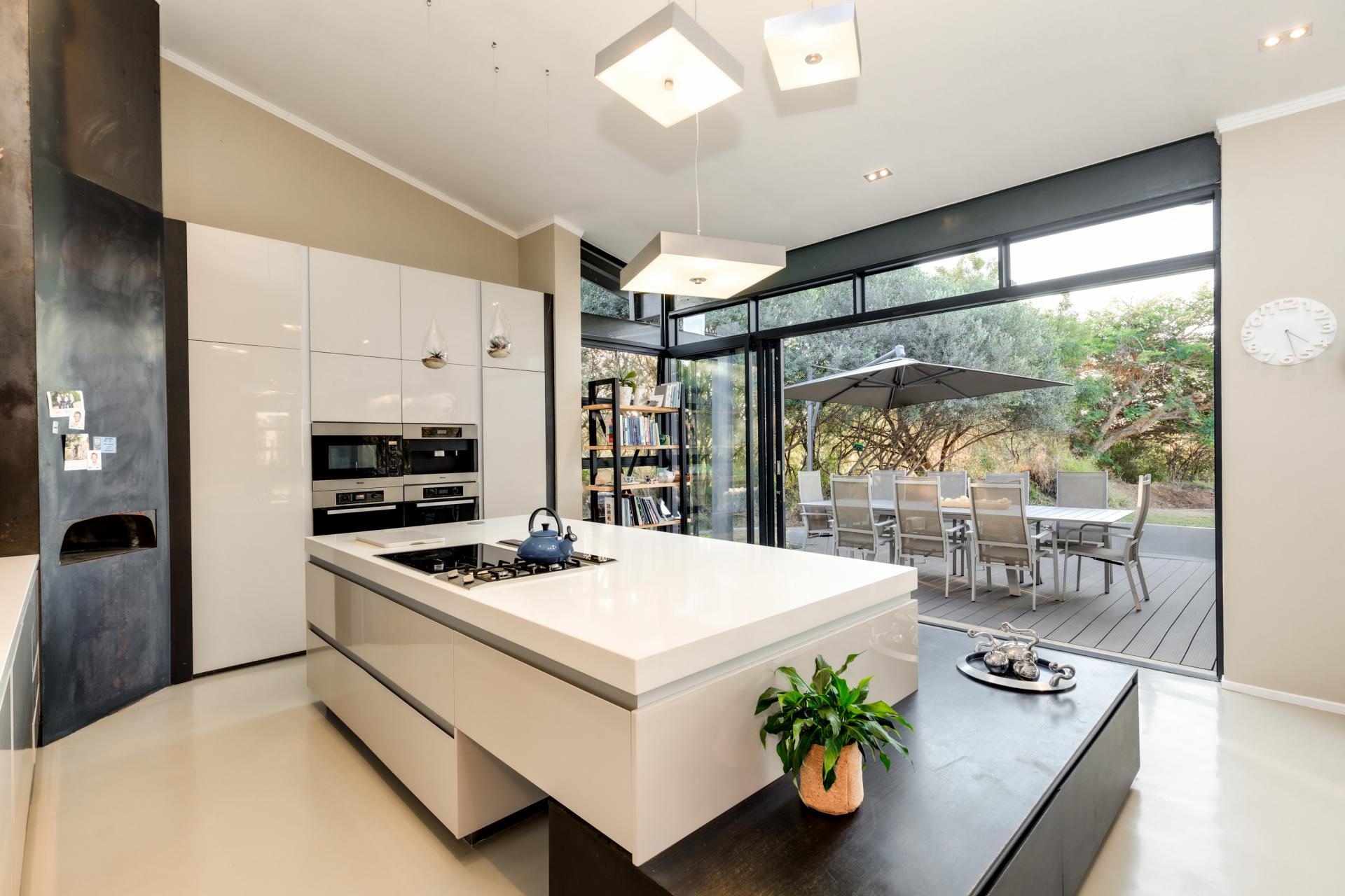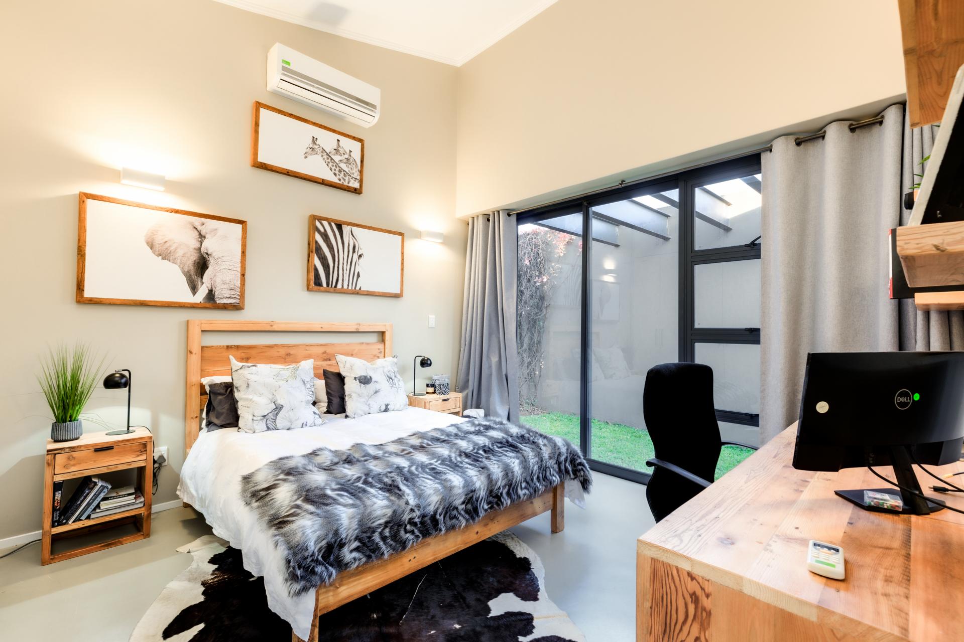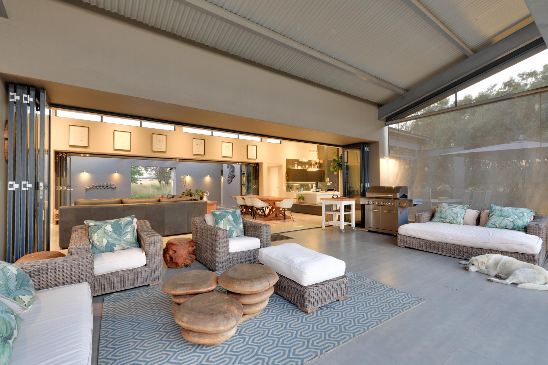 Set on one of the top 10 largest stands in Monaghan Farm, the 4-bedroom, 3-bathroom residence was designed for off-grid resilience and effortless indoor-outdoor flow. At the heart of the home is a bespoke Blu-Line kitchen, fully equipped with built-in Miele appliances, an integrated fridge/freezer, gas pizza oven, and both gas and induction hobs — for cooking during loadshedding. The living space is warmed by a massive Morso wood-burning fireplace (plus one in the master suite too), and the house is wired throughout for Wi-Fi, fibre, and sound. The home includes a large study/play area leading onto a central courtyard, a private staff suite with its own kitchenette and bathroom, and offers ample space for extended additions such as a studio, garage, or flatlet.