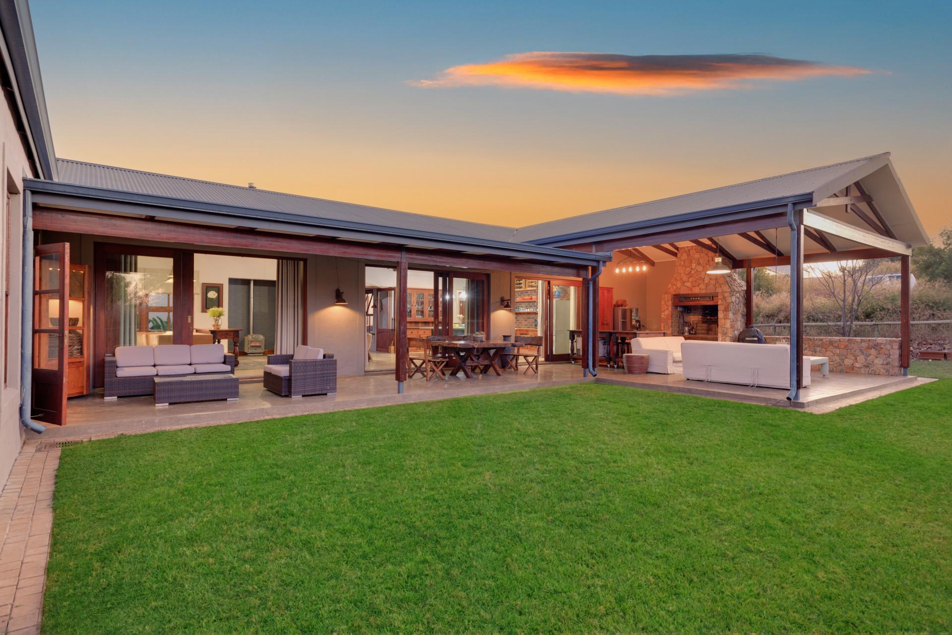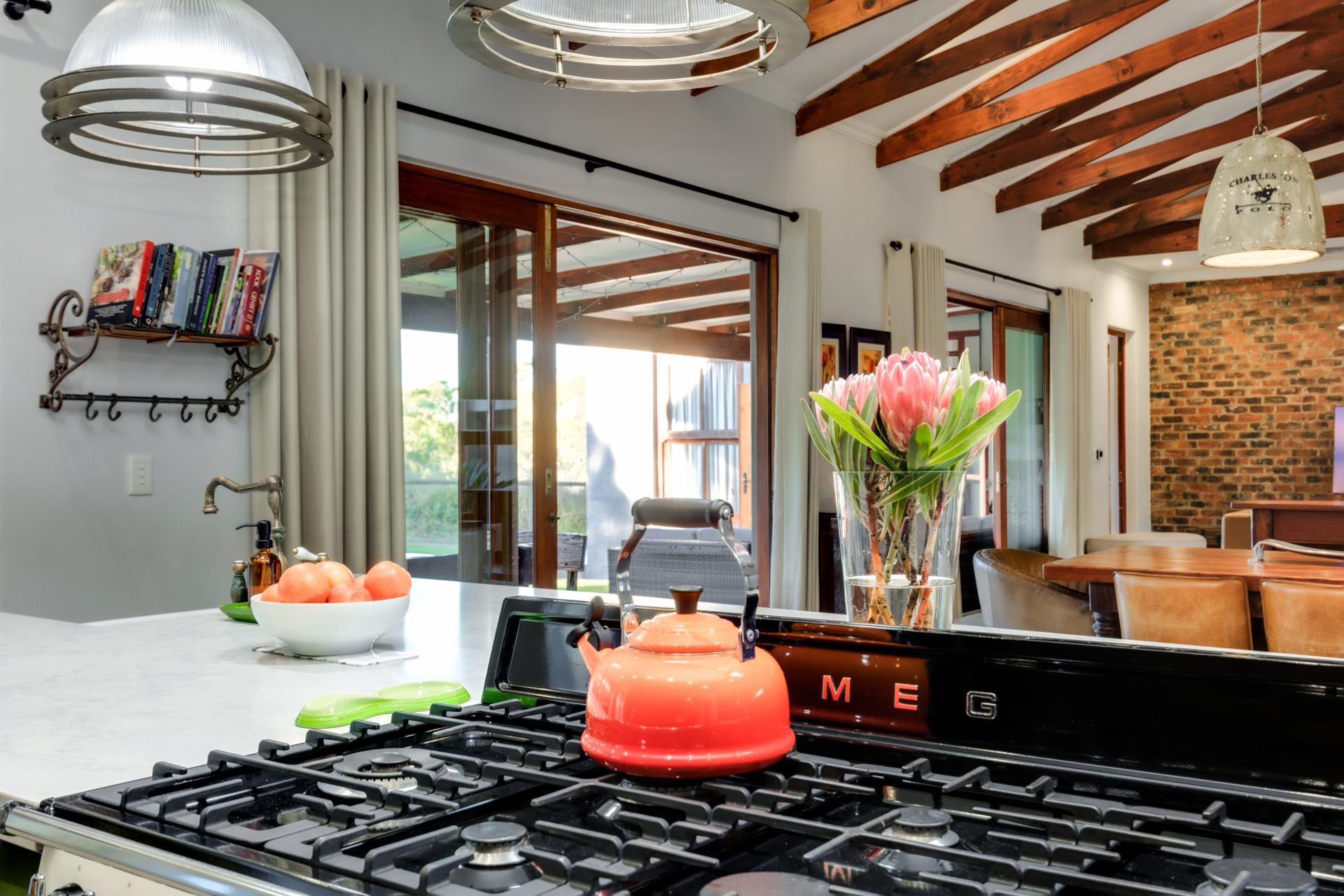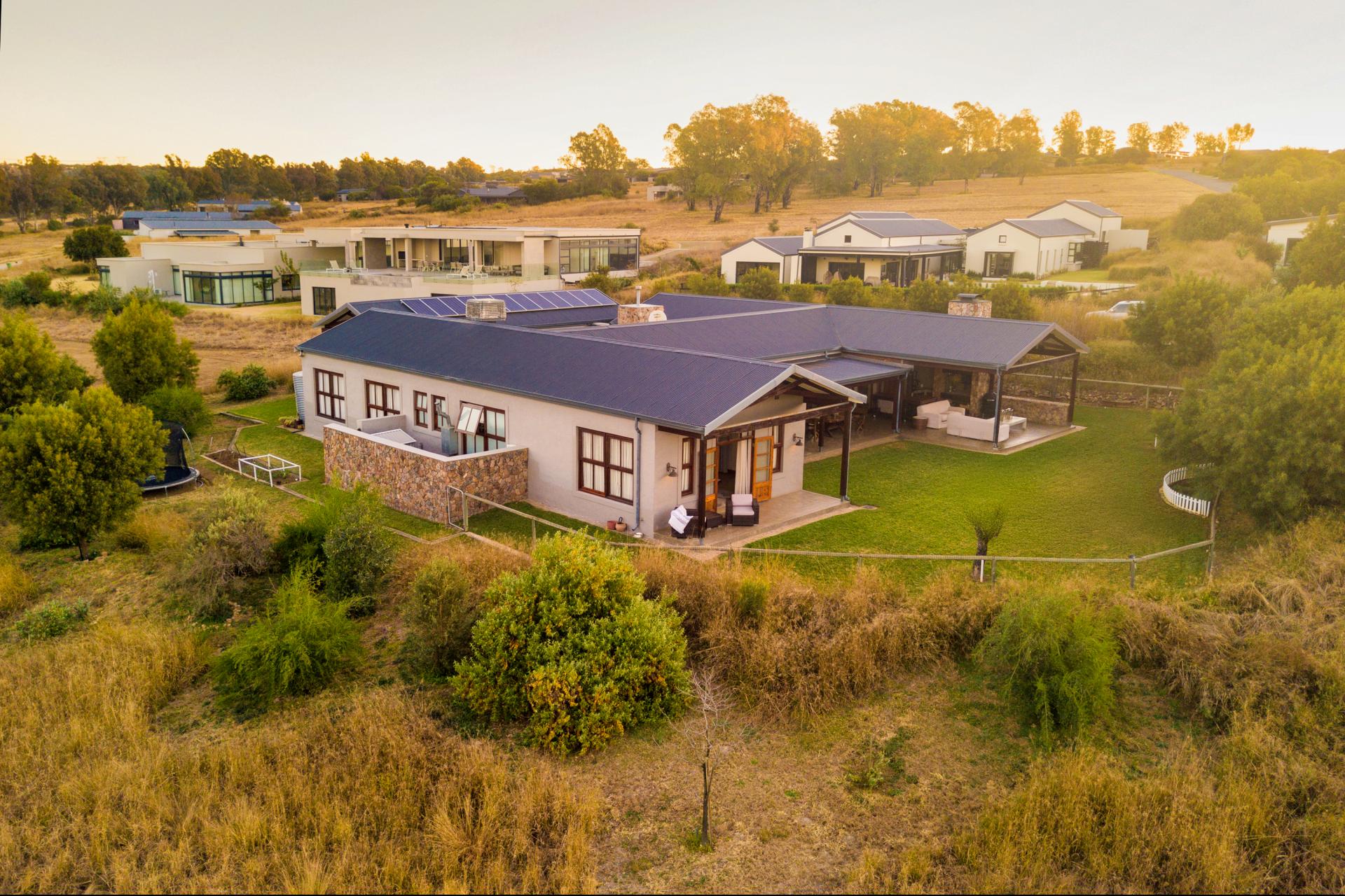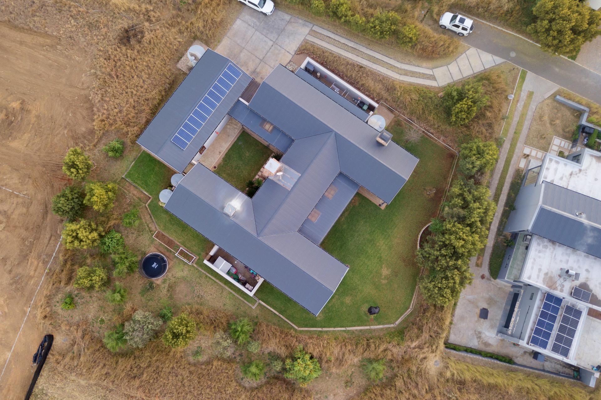 The home runs on a 5kVA Victron inverter with 12 solar panels and a 10kWh backup battery. There are 3 gas geysers, 30,000 litres of rainwater storage, and rain-fed irrigation for grass and trees. BreezeAir cooling and a Becker anthracite fireplace keep you covered during summer and winter.