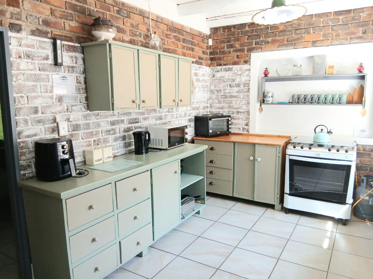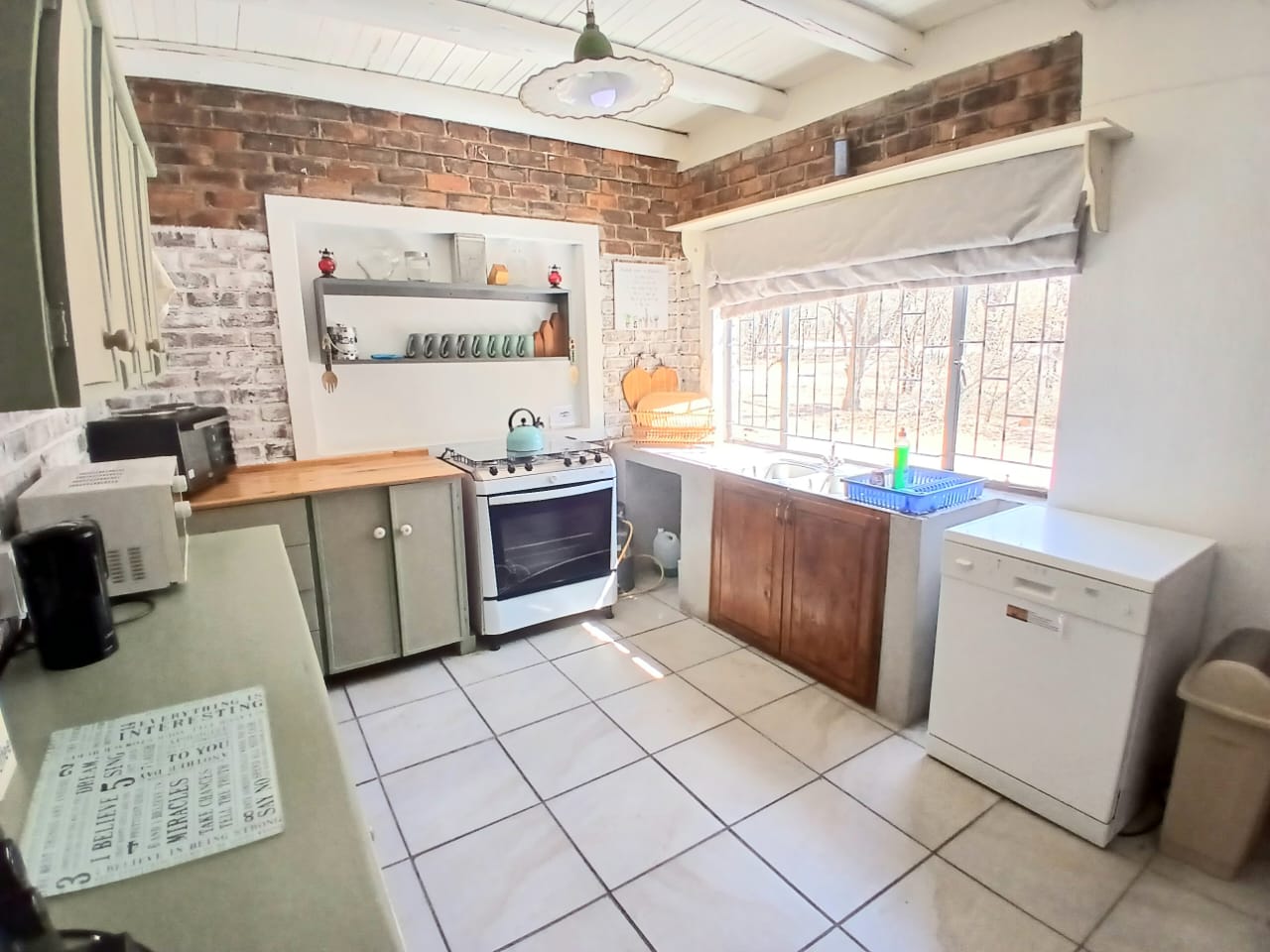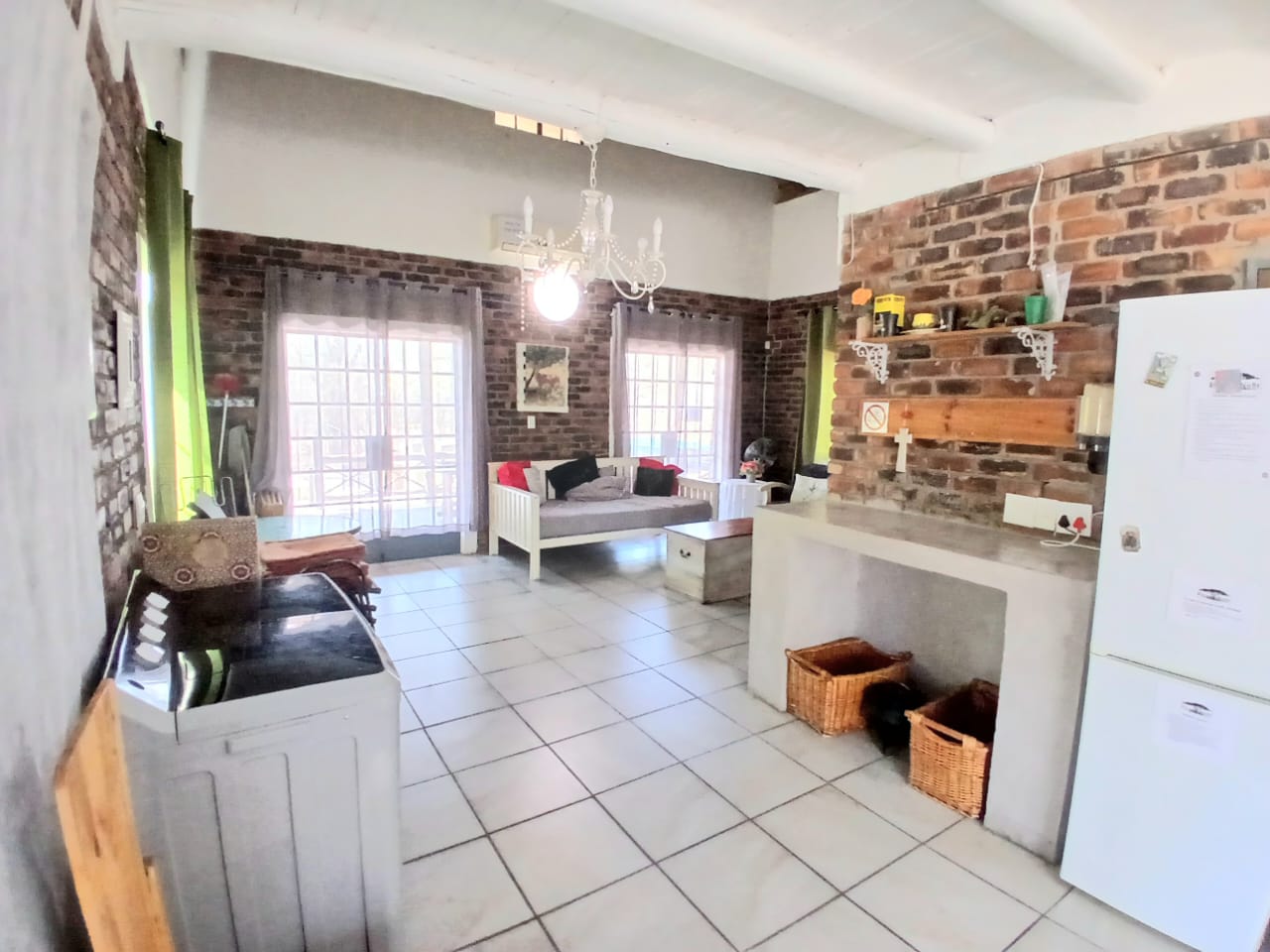 The home features an open-plan kitchen with ample storage, flowing into a welcoming lounge area. 2 separate glass doors lead to the entertainment area on the outside, allowing natural light and the birdsong from the gigantic trees to pour in.