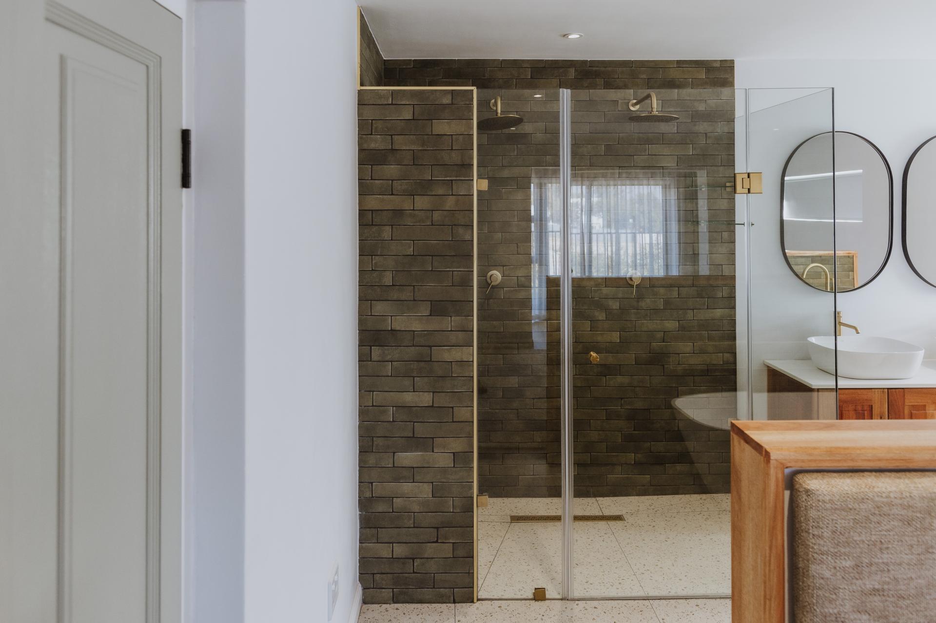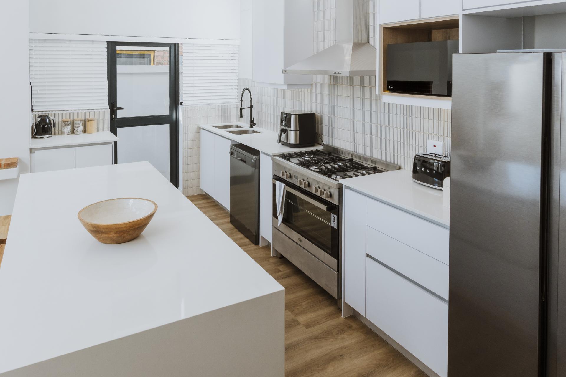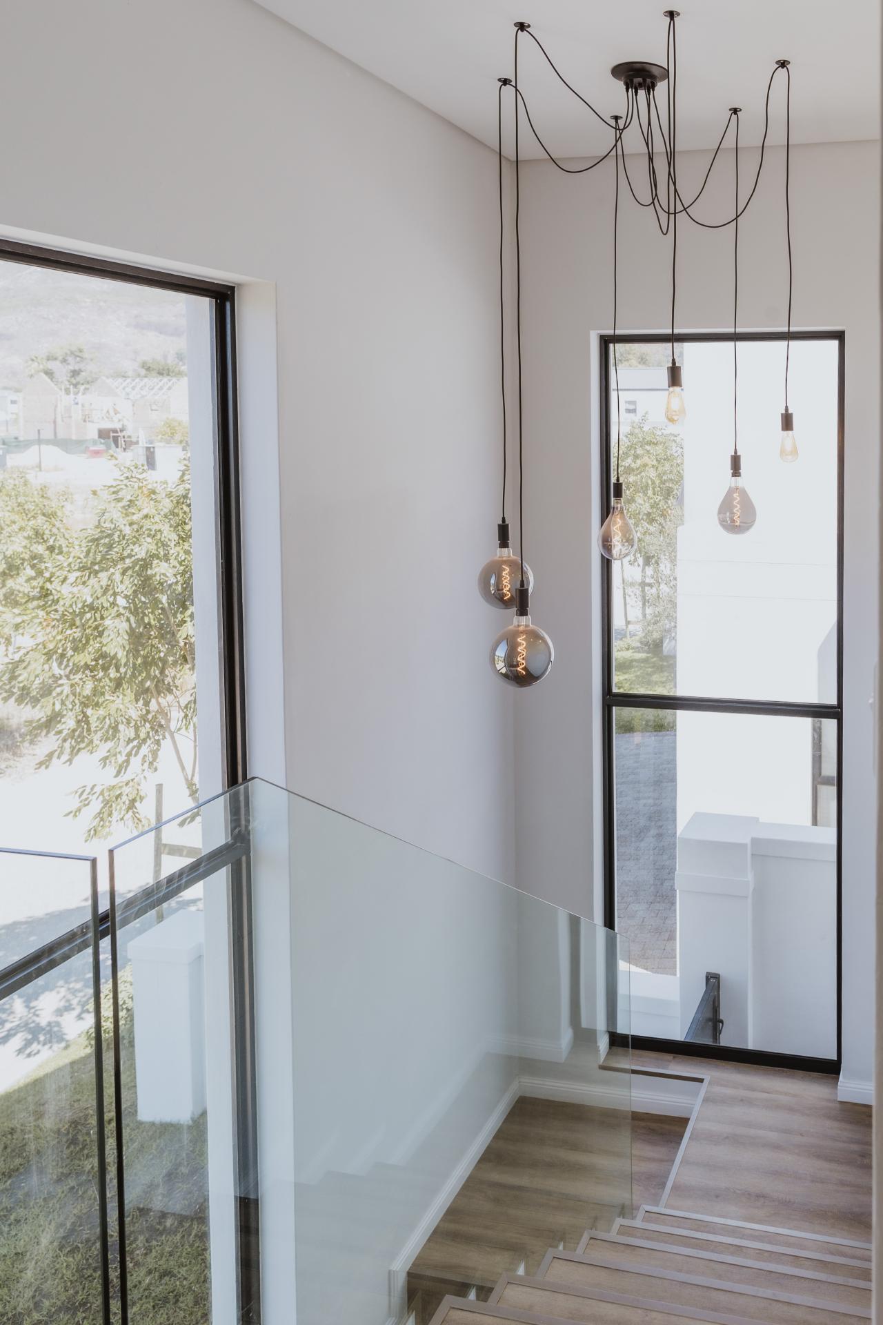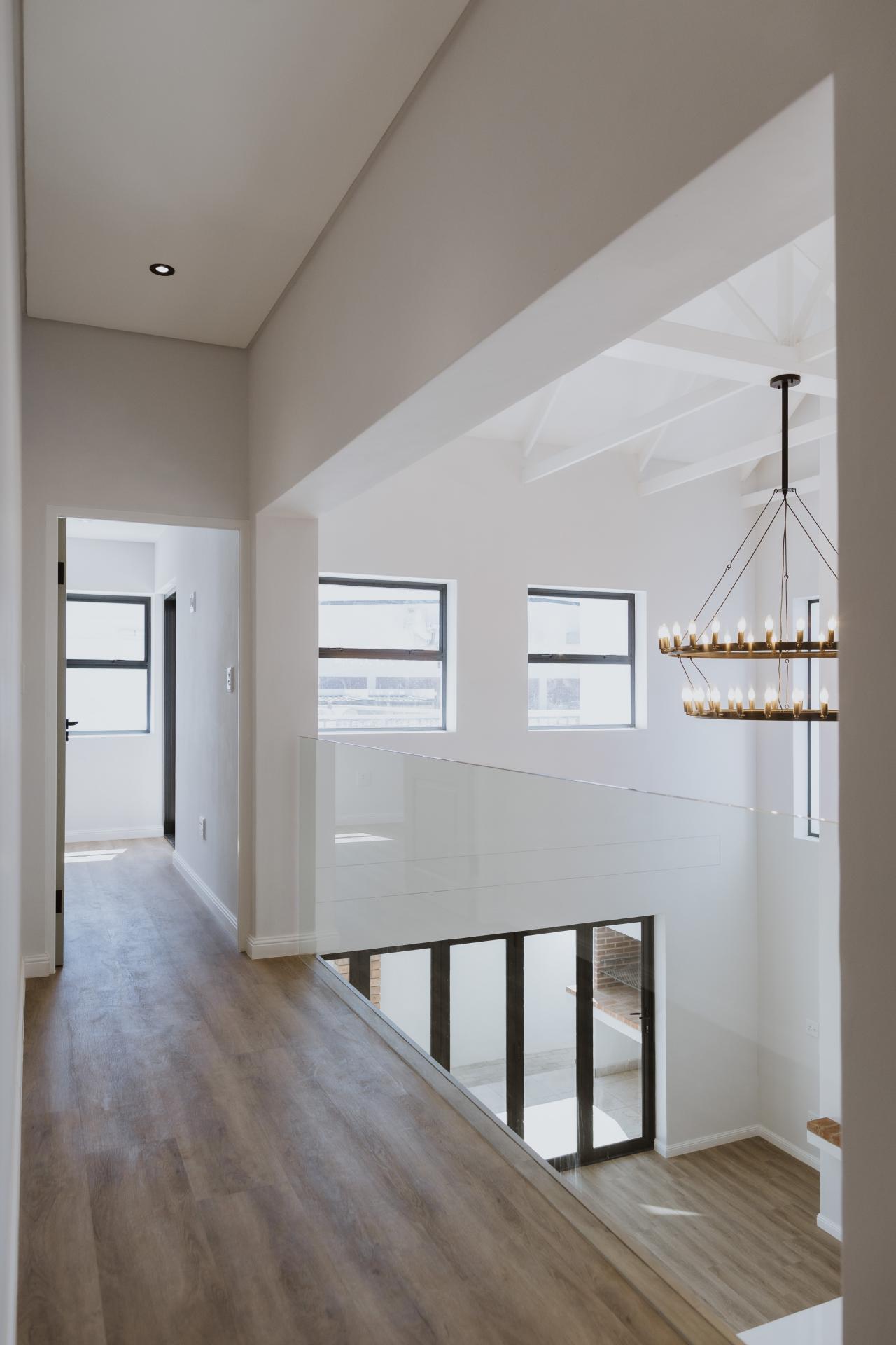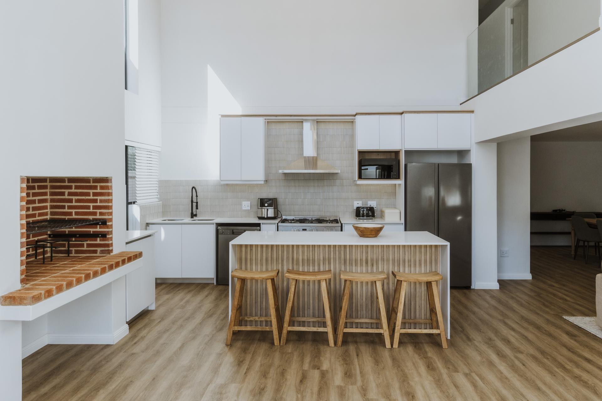 This home boasts a double volume living and kitchen area, featuring a magnificent custom designed wrought iron chandelier. The exposed trusses creates a sense of openness and space with glass stacking doors that lead out from the open-plan kitchen and entertainment area to the outdoor braai. Large glass panels on either side of the indoor braai invites natural light in to the space which in turn enhances the stunning architectural details.