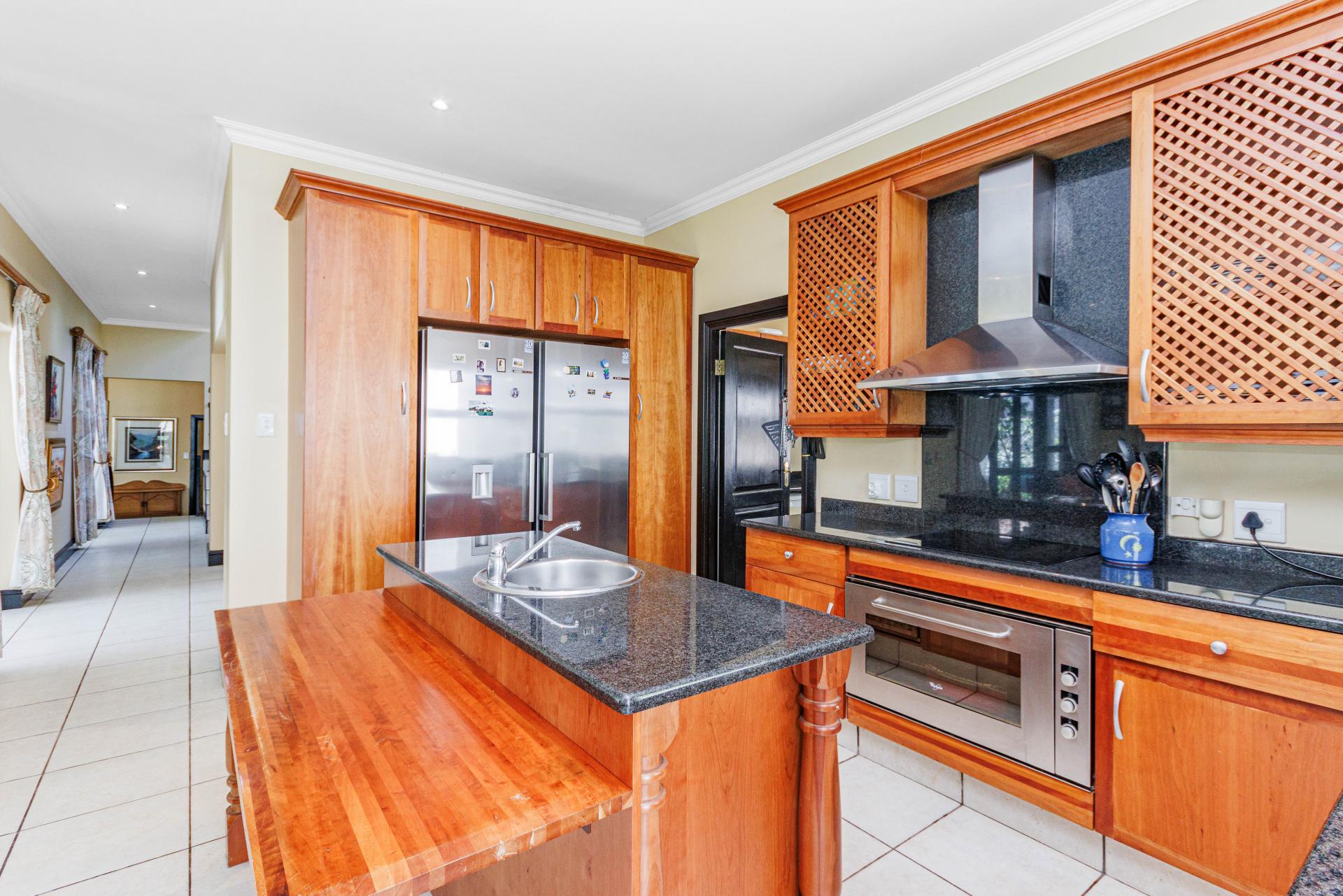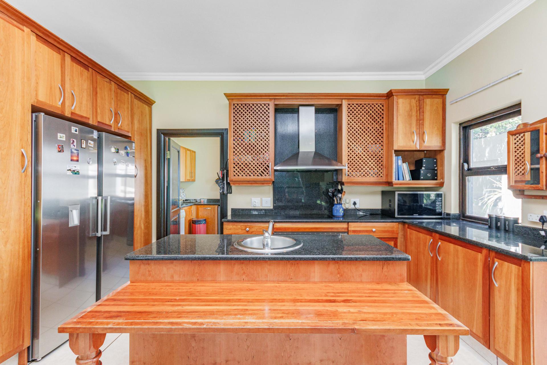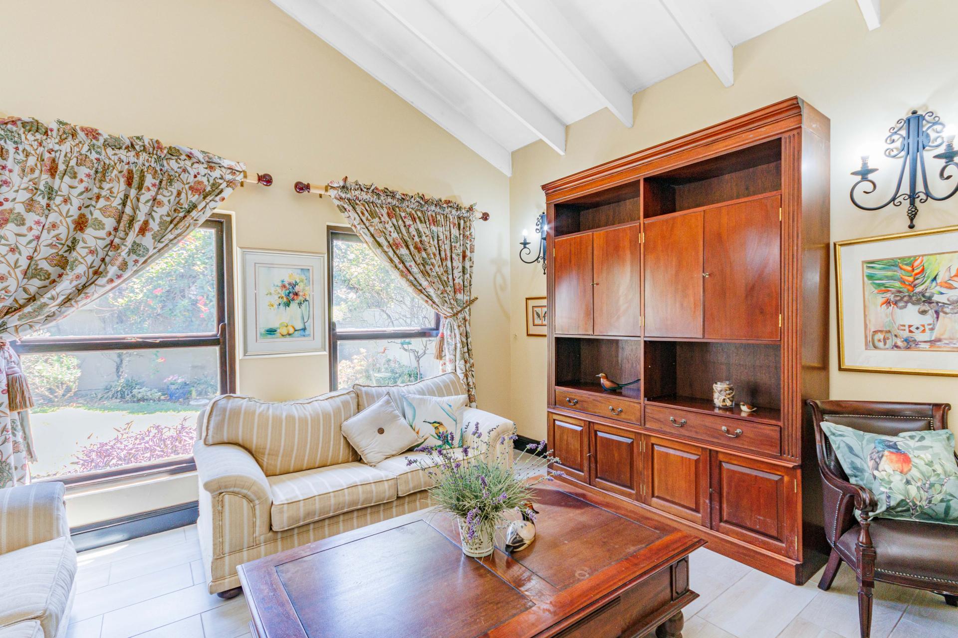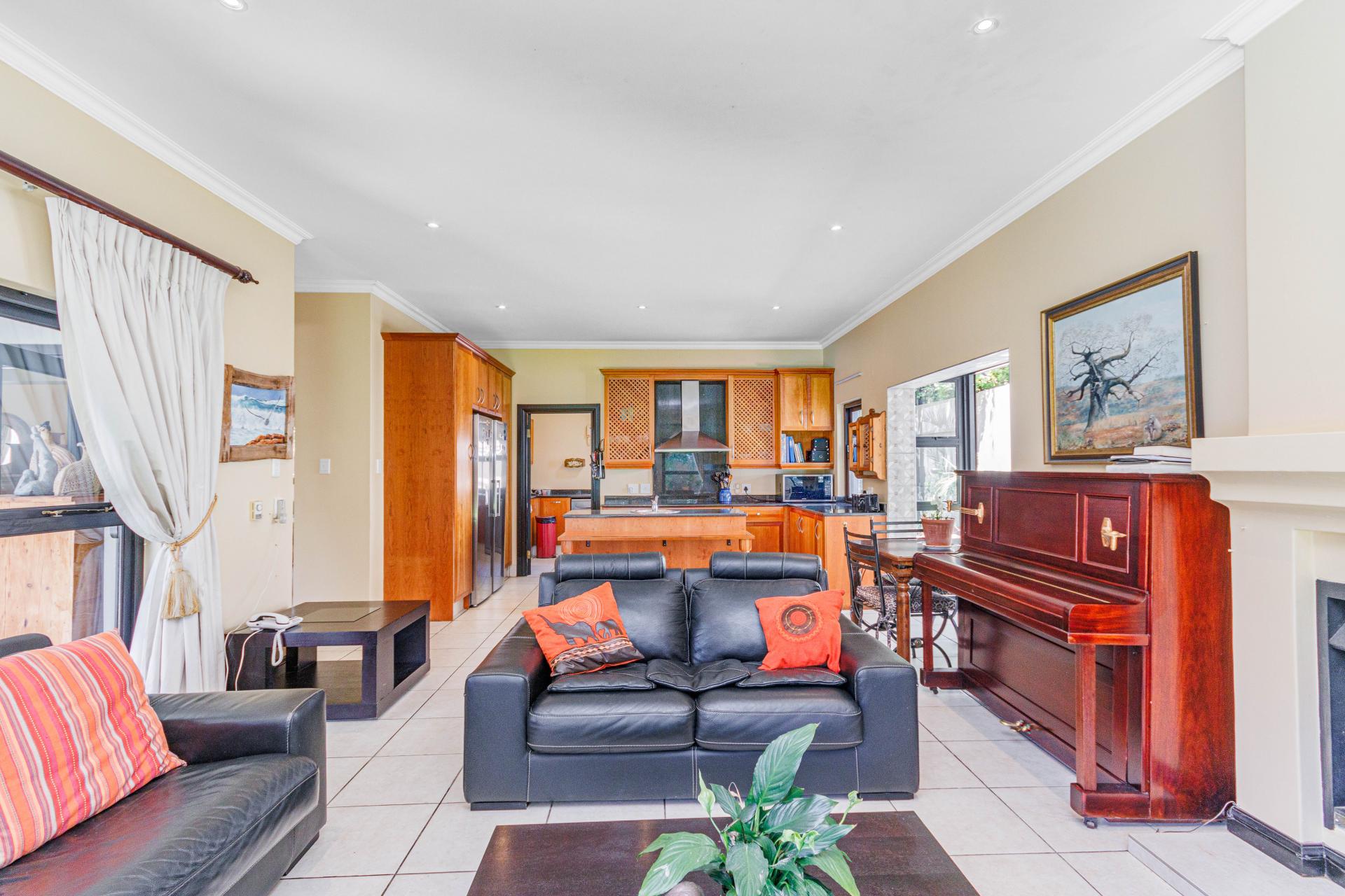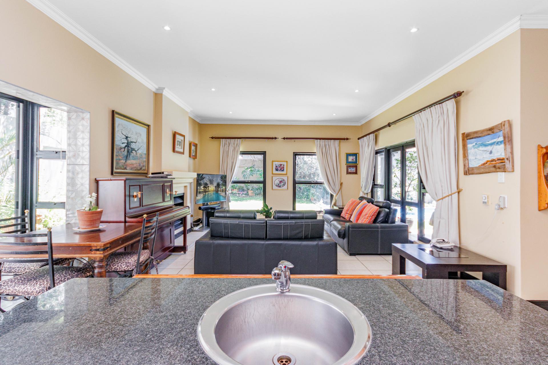 The open-plan kitchen, designed for modern living, flows into the cozy TV lounge and features a separate scullery along with ample storage. Step outside to the expansive patio, complete with a built-in braai, offering stunning views of the swimming pool and serene koi pond.
