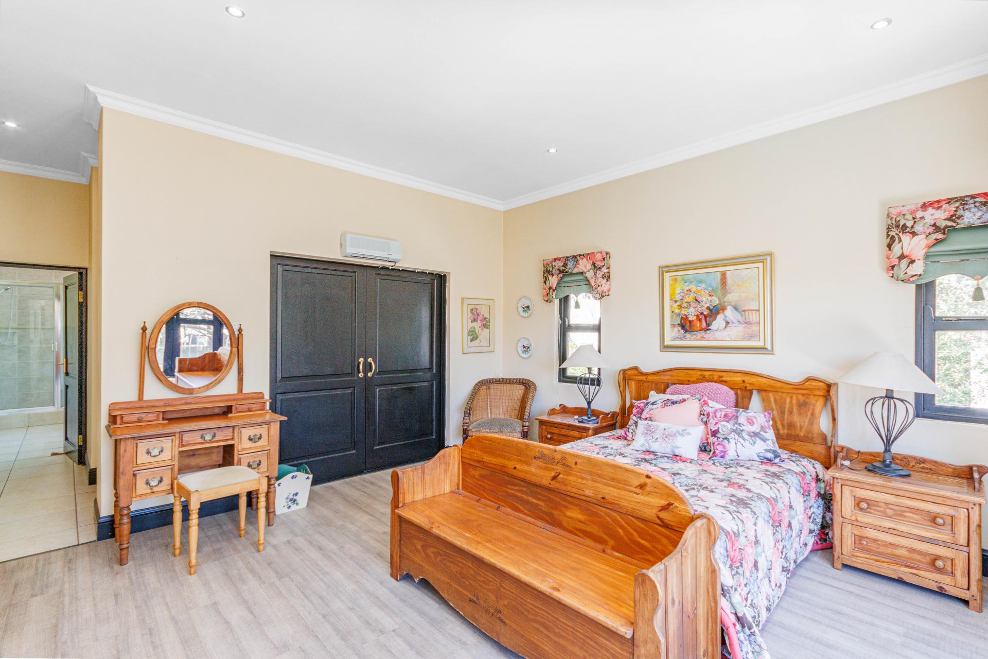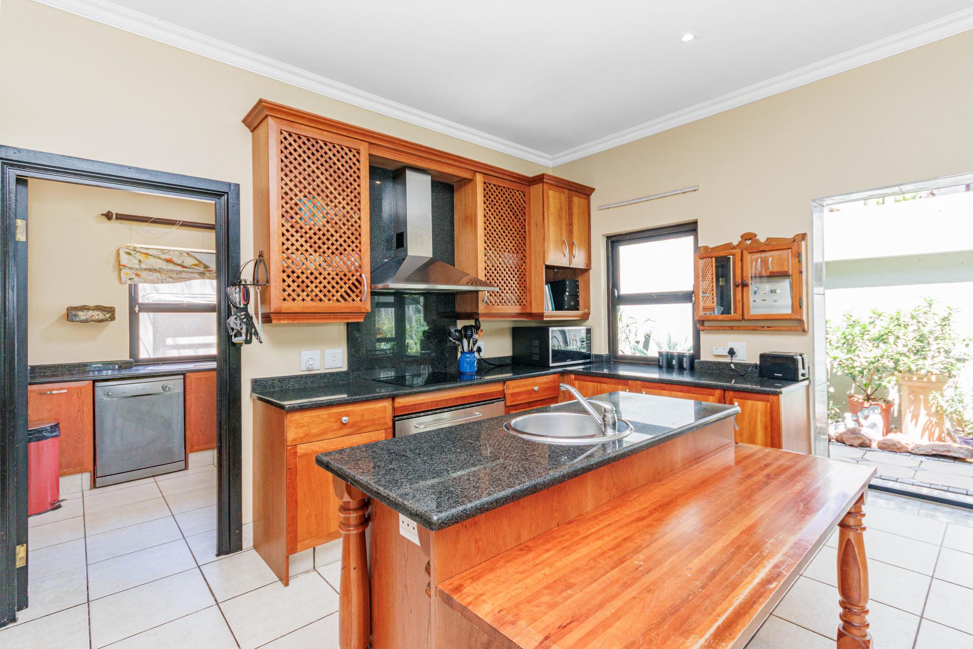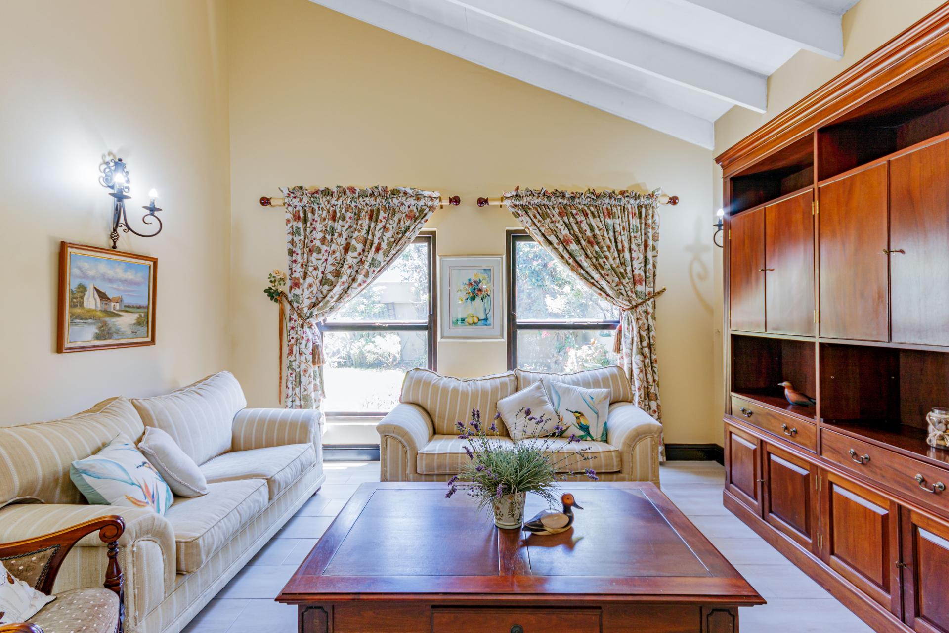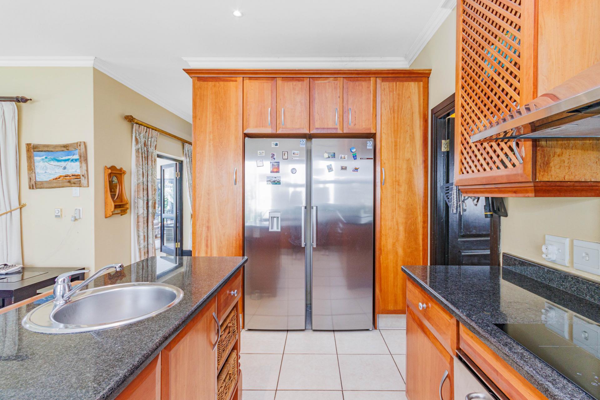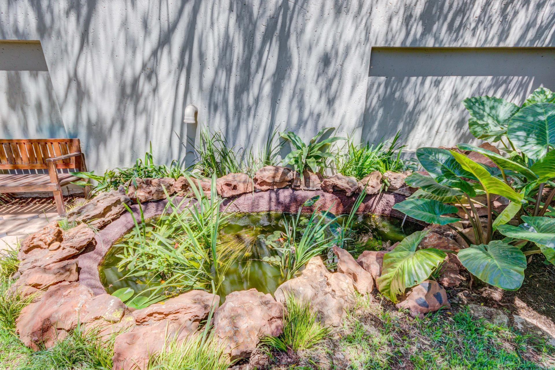 The open-plan kitchen, designed for modern living, flows into the cozy TV lounge and features a separate scullery along with ample storage. Step outside to the expansive patio, complete with a built-in braai, offering stunning views of the swimming pool and serene koi pond.