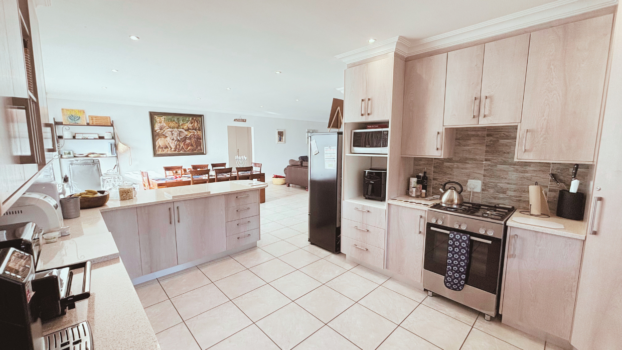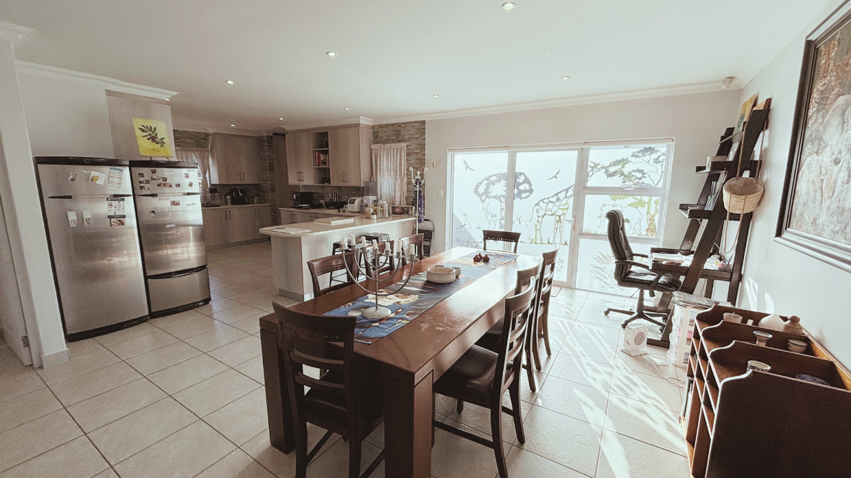 Sliding doors lead to a large, covered patio with a built-in braai, ideal for entertaining and enjoying breathtaking sunsets over the fairway.